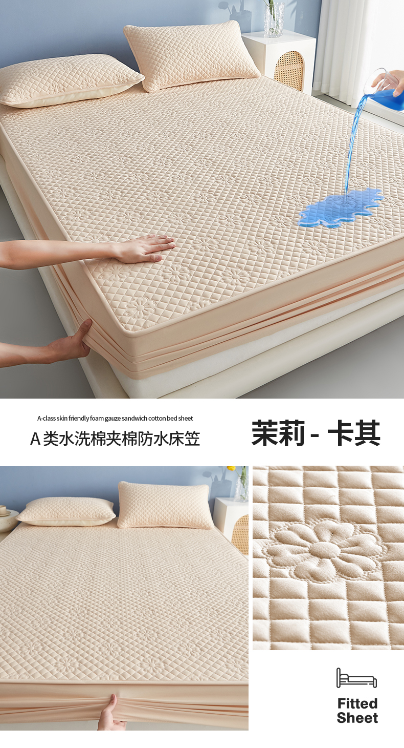 盛眠家纺 2025新款水洗棉防水夹棉床笠-茉莉系列 Shein、速卖通,亚马逊、Temu床笠单件 跨境外贸 茉莉-卡其