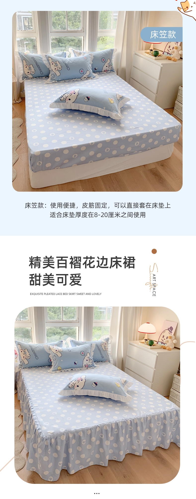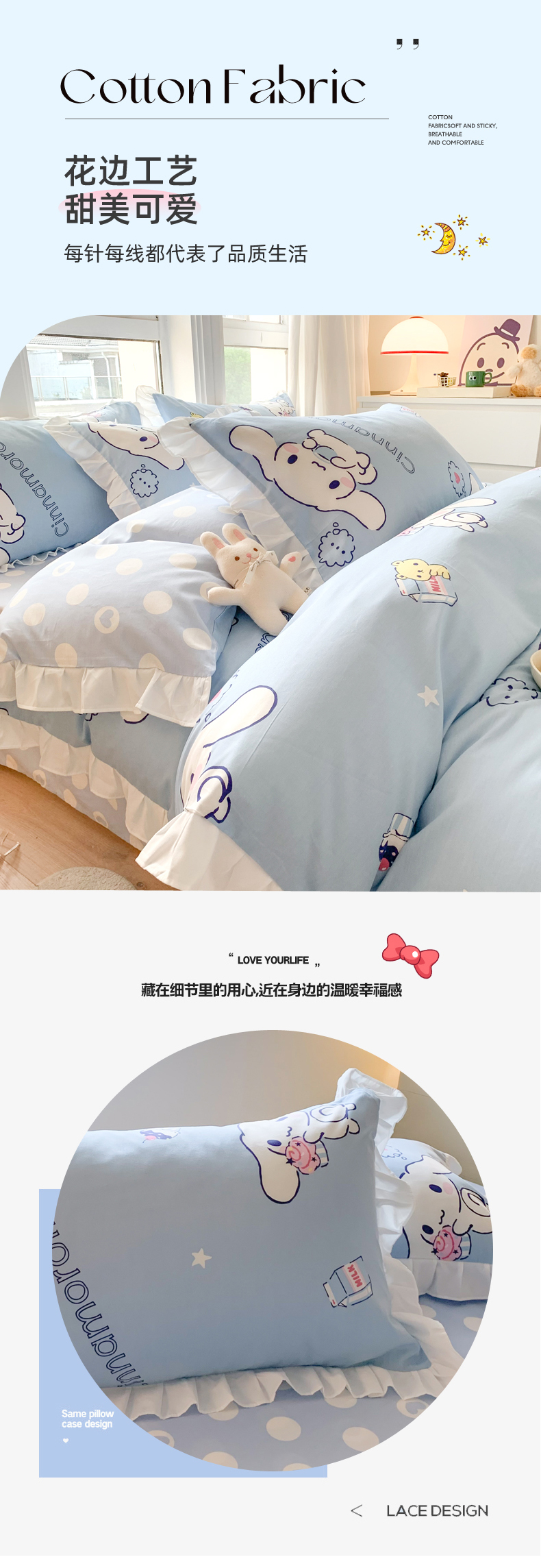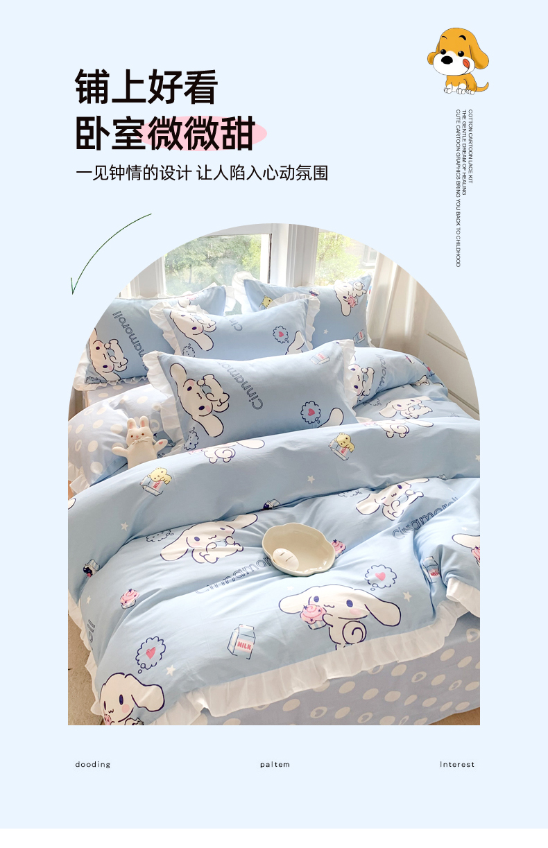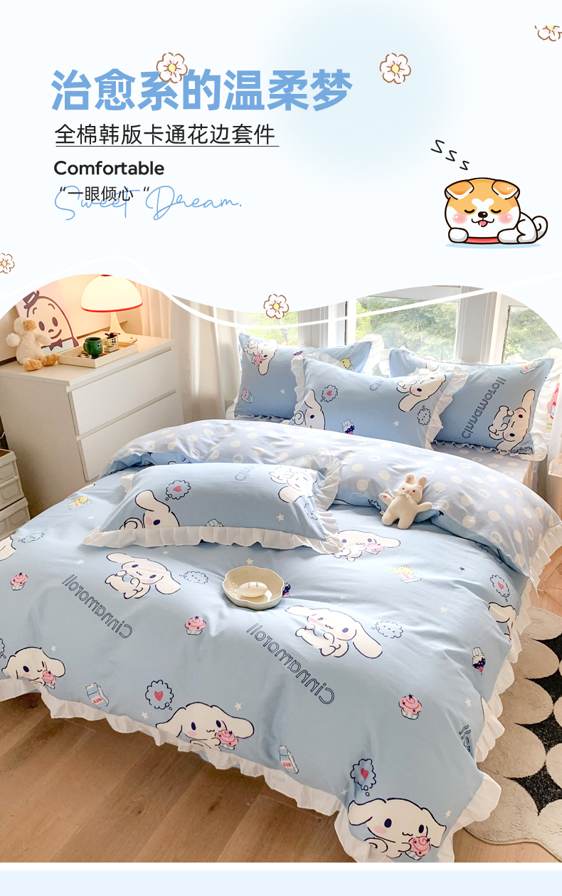 当前位置: 91家纺网 > 商品网购 > 床品套件 > 四件套 > 全棉普通四件套 > 玉元坊 2025新款三丽鸥系列白花边被套纯棉全棉床裙三件套四件套-大耳狗白花边款式 甜品玉桂狗