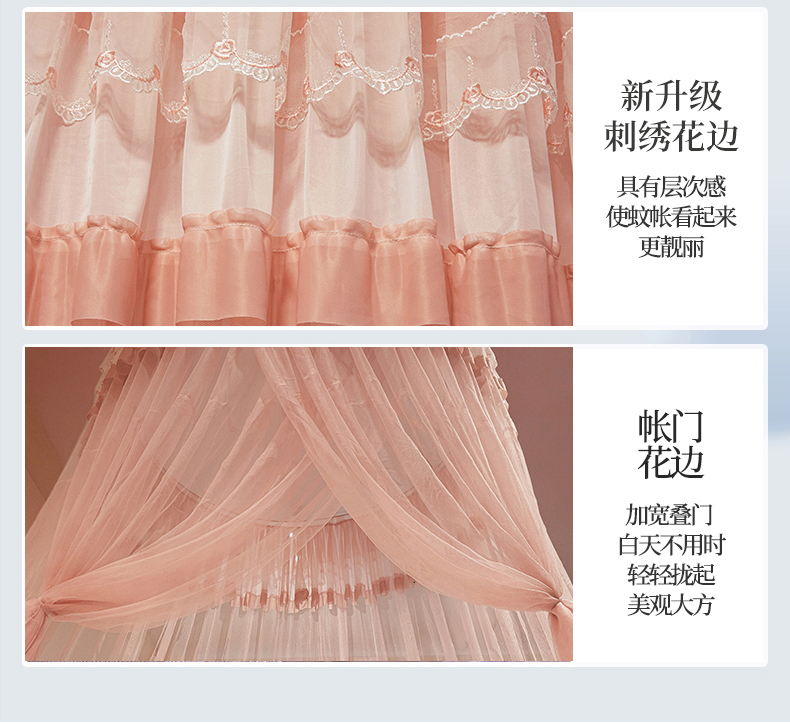 (总)雪姿家纺 2025新款刺绣花边双层宫廷三开门落地蚊帐-舒雅,素雅-海洋兰,素雅-暖玉,素雅-蓝灰,素雅-黄色,素雅-柳绿