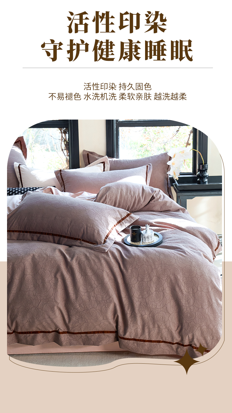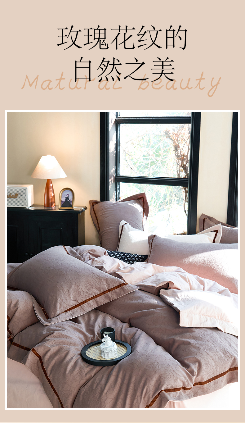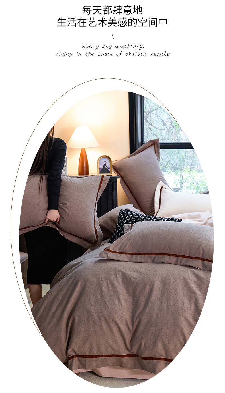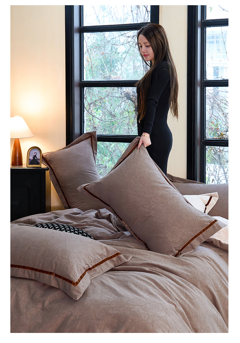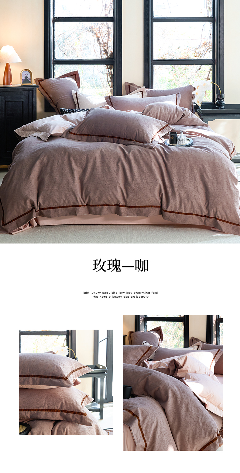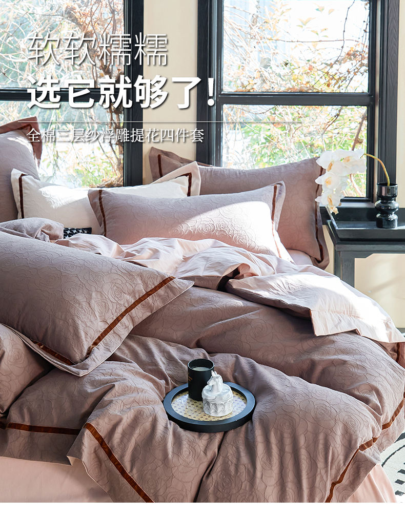 当前位置: 91家纺网 > 商品网购 > 床品套件 > 四件套 > 提花四件套 > 久典家居 2025新款三层纱浮雕大提花织带贴边款四件套 玫瑰—咖