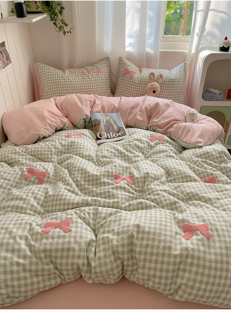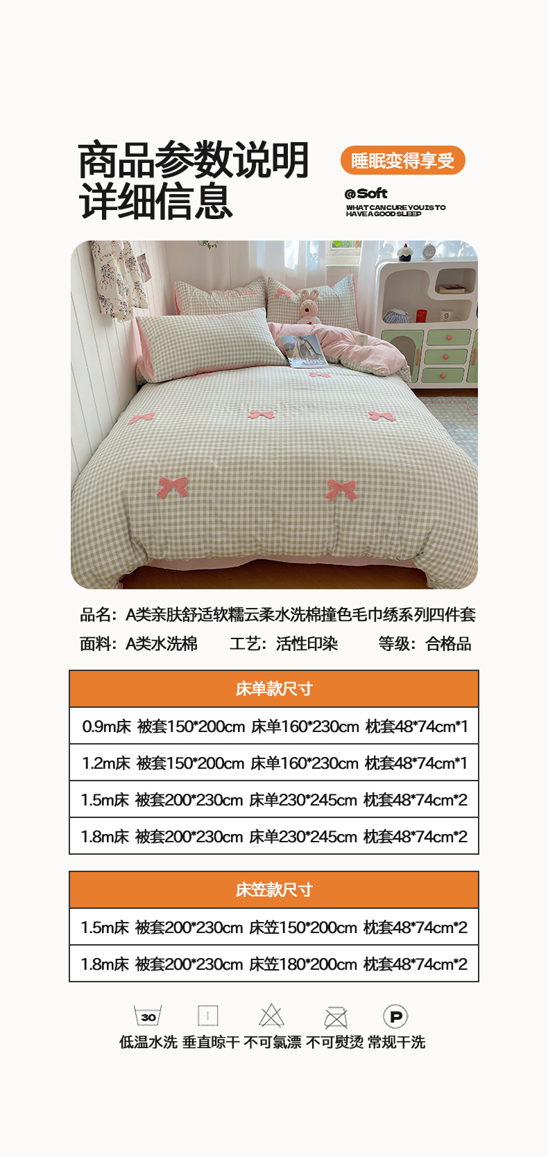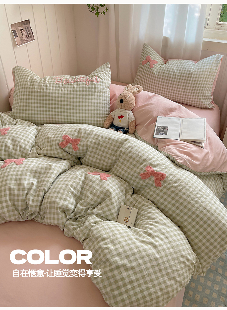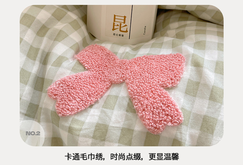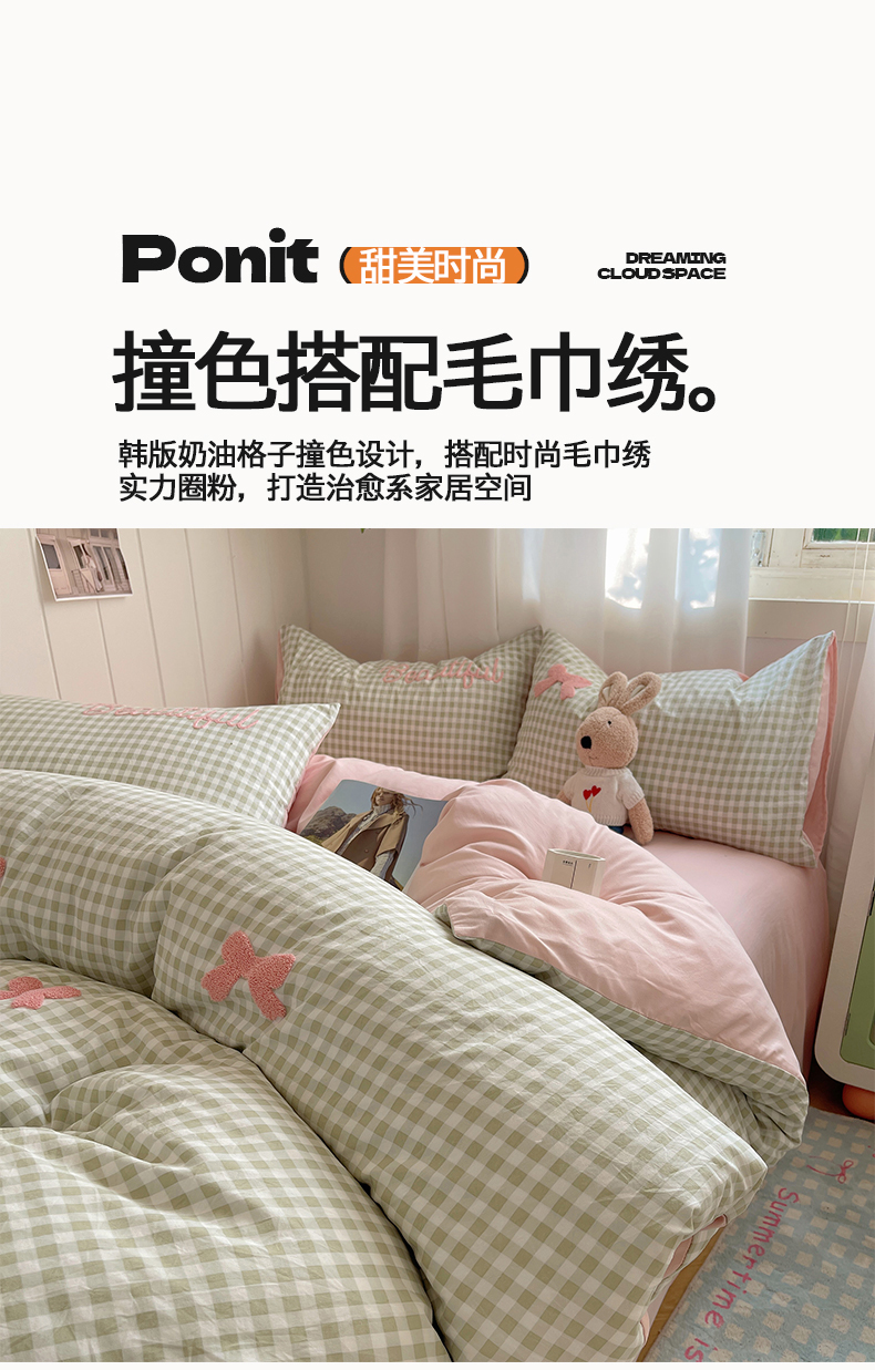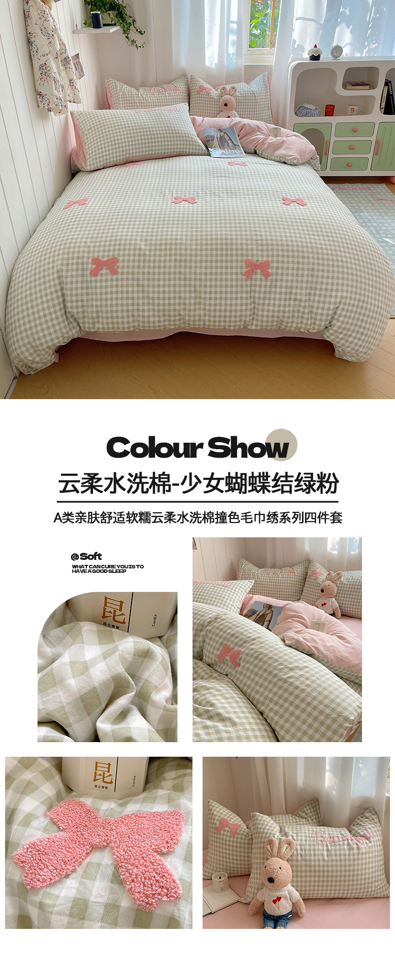 当前位置: 91家纺网 > 商品网购 > 床品套件 > 四件套 > 水洗棉四件套 > 桃心家居 2025新款A类亲肤舒适软糯云柔水洗棉奶油格子撞色毛巾绣猫咪蝴蝶结水洗棉系列四件套 云柔水洗棉-少女蝴蝶结绿粉
