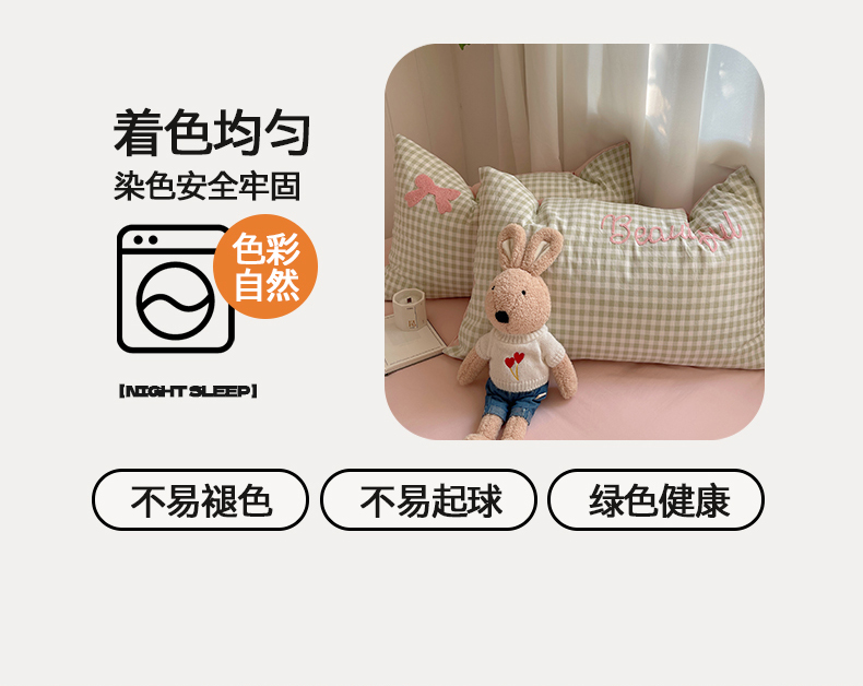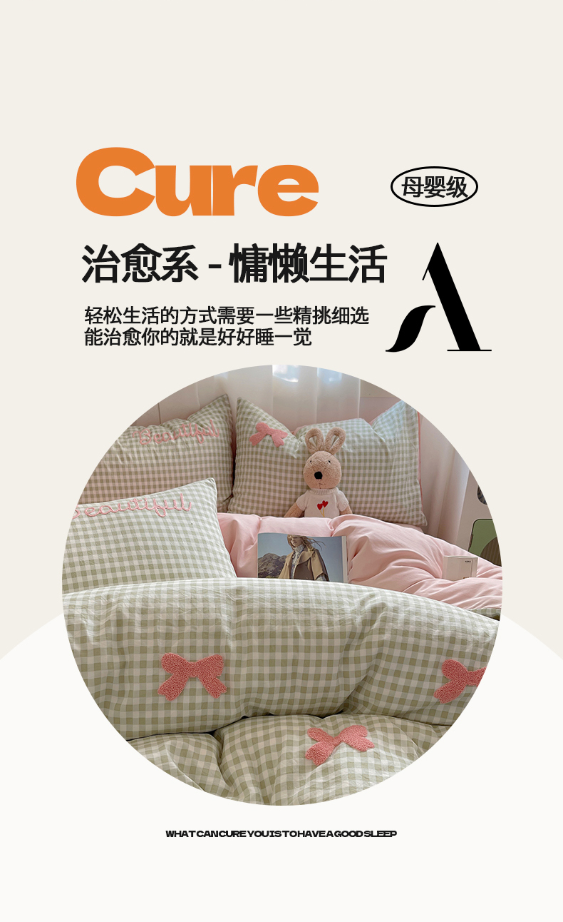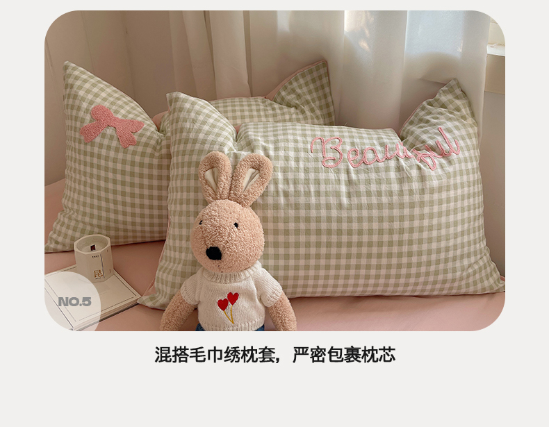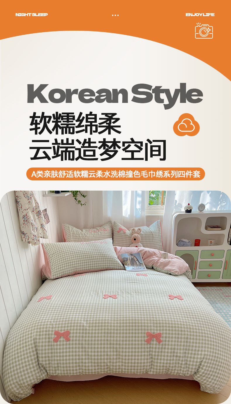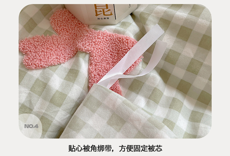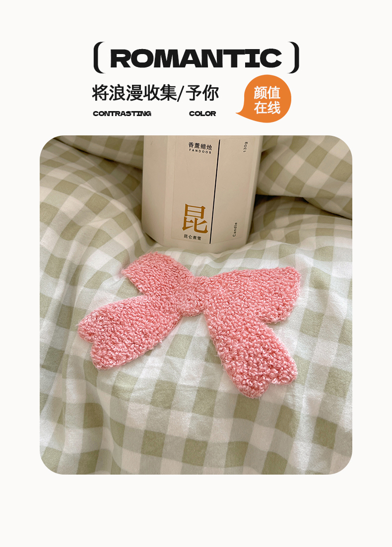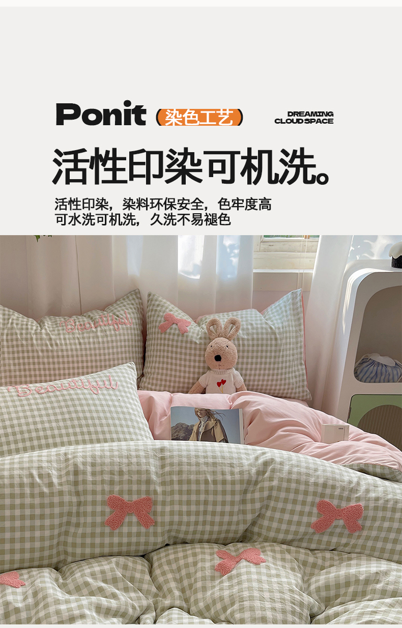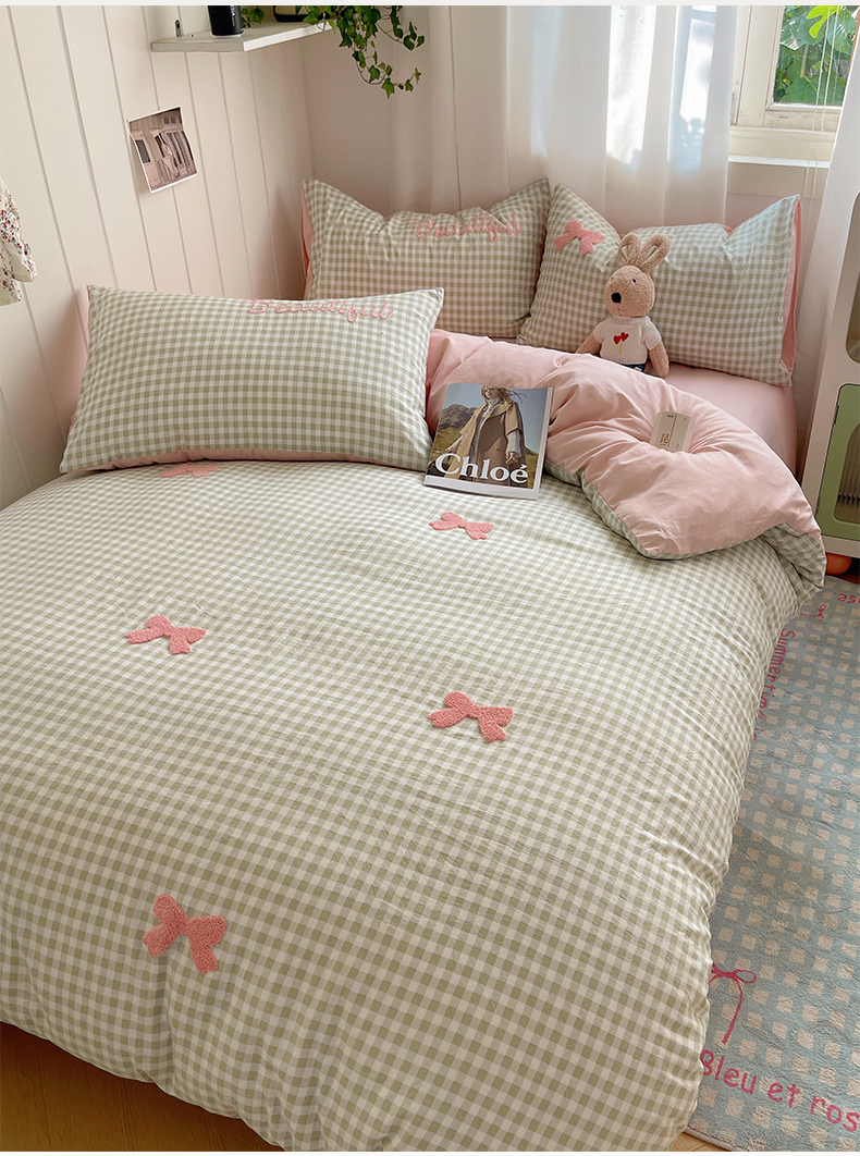当前位置: 91家纺网 > 商品网购 > 床品套件 > 四件套 > 水洗棉四件套 > 桃心家居 2025新款A类亲肤舒适软糯云柔水洗棉奶油格子撞色毛巾绣猫咪蝴蝶结水洗棉系列四件套 云柔水洗棉-少女蝴蝶结绿粉