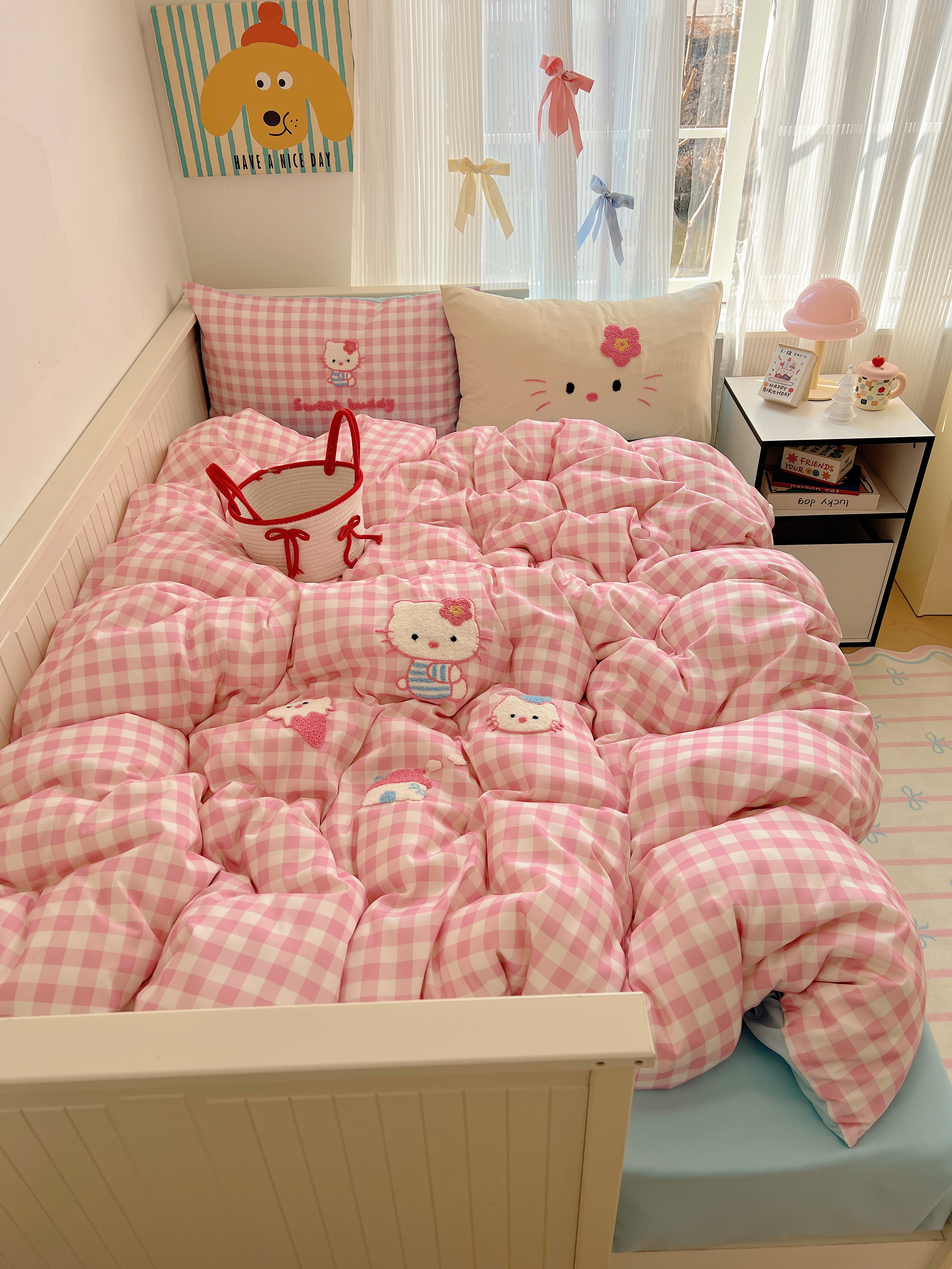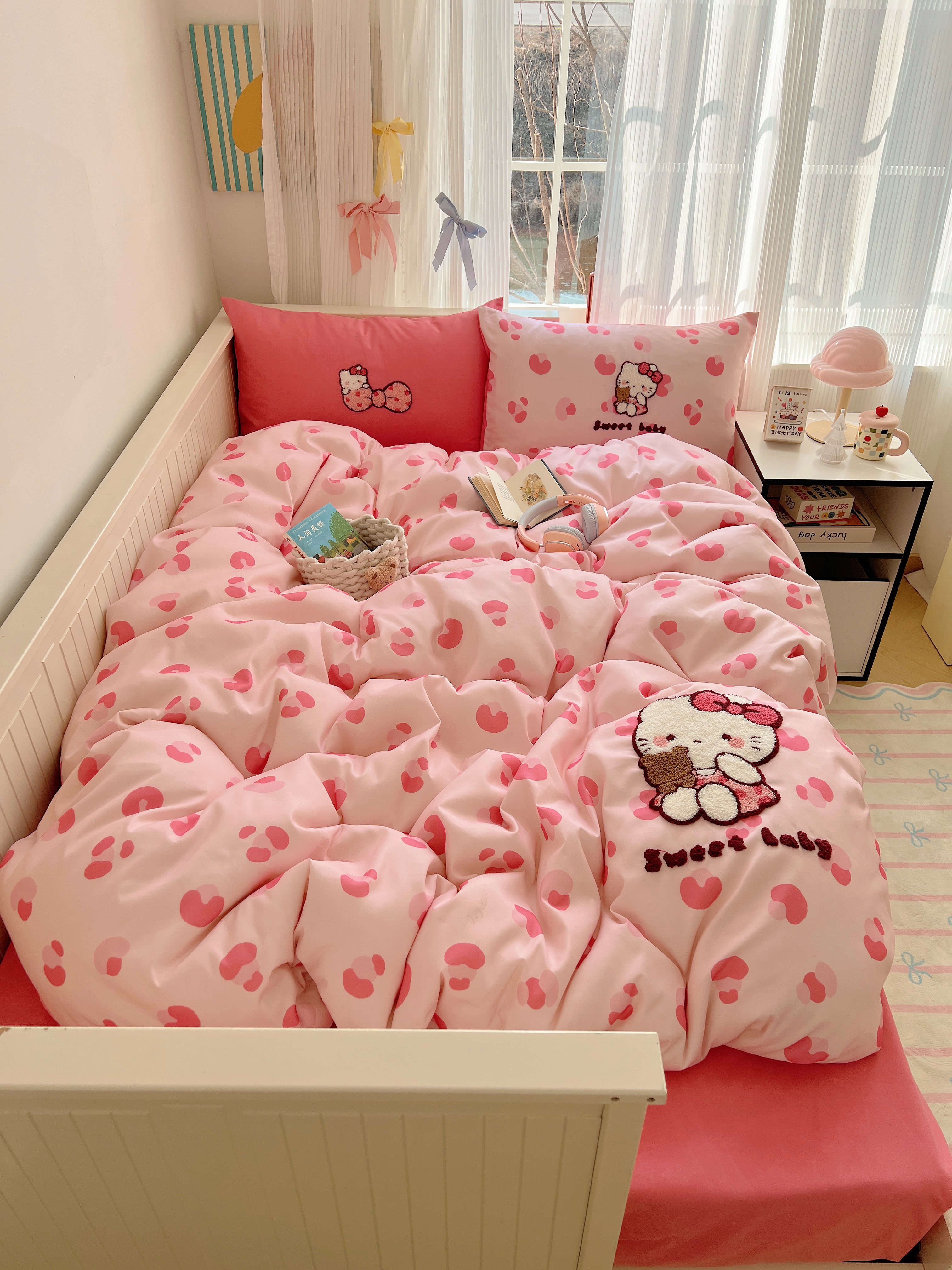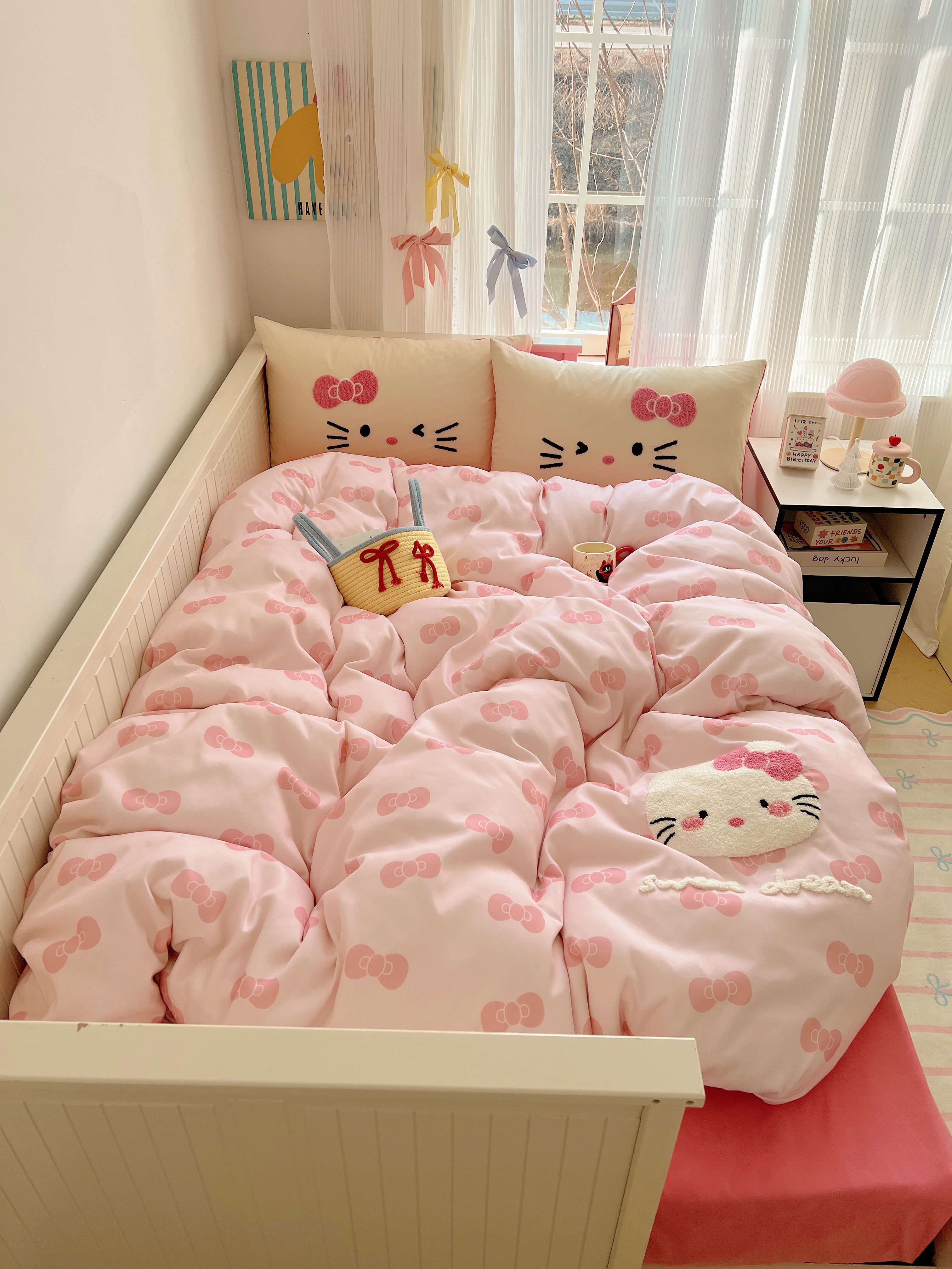 桃喜 2025新款猫咪系列印花毛巾绣水洗棉四件套 粉蝴蝶结小猫