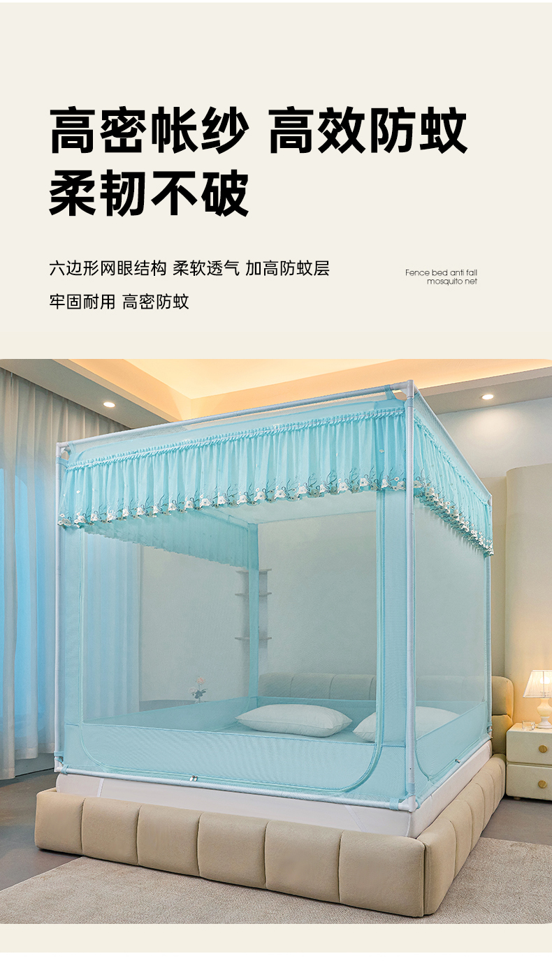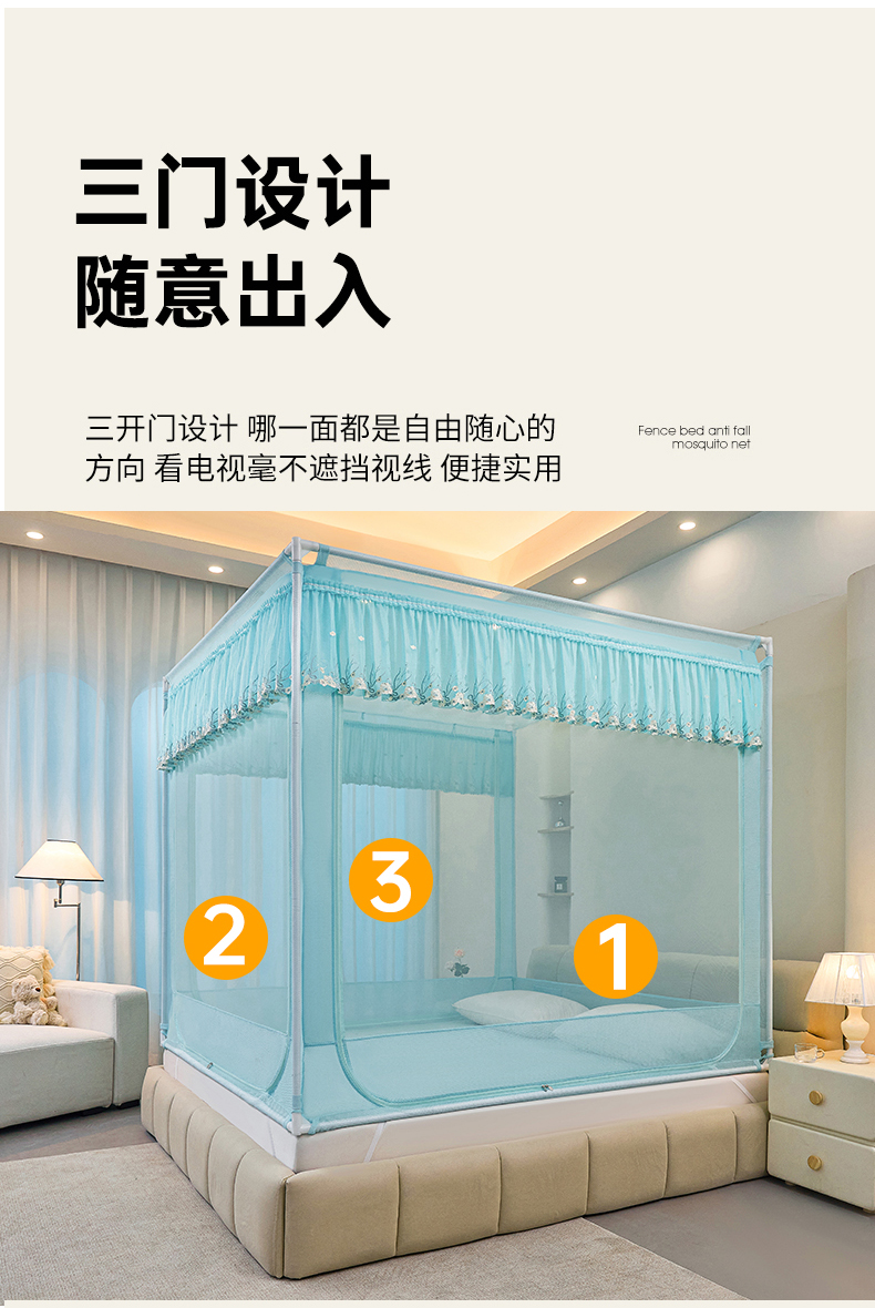 (总)2025新款双层花边全包围床笠款三开门蚊帐-幽梦星辰,奶黄,藕玉,颜淡蓝