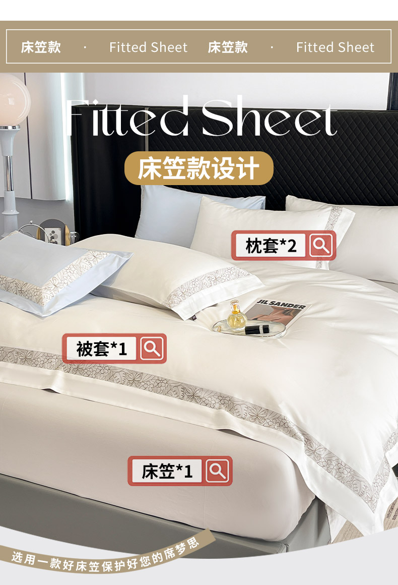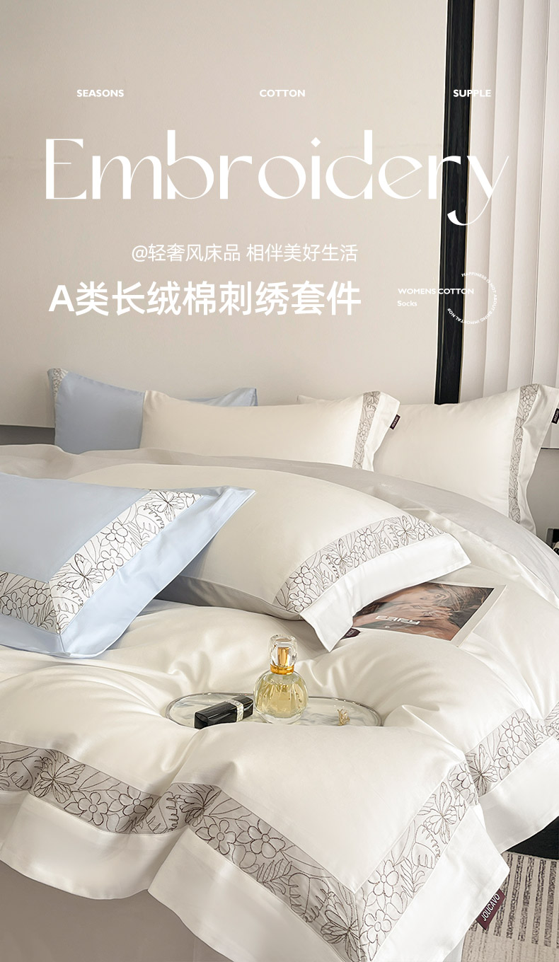当前位置: 91家纺网 > 商品网购 > 床品套件 > 四件套 > 长绒棉四件套 > 2025新款A类100支长绒棉夹棉床盖床笠四件套全棉纯棉床单加厚高端重工刺绣四季款床上用品 诺兰-白灰