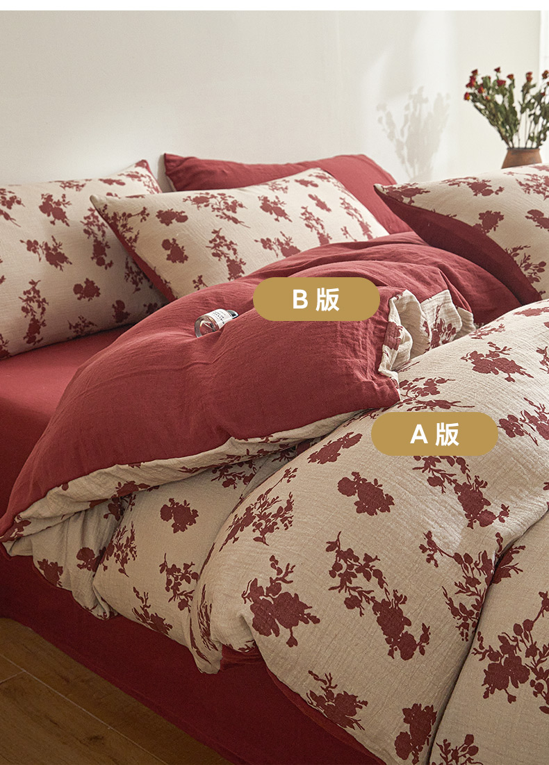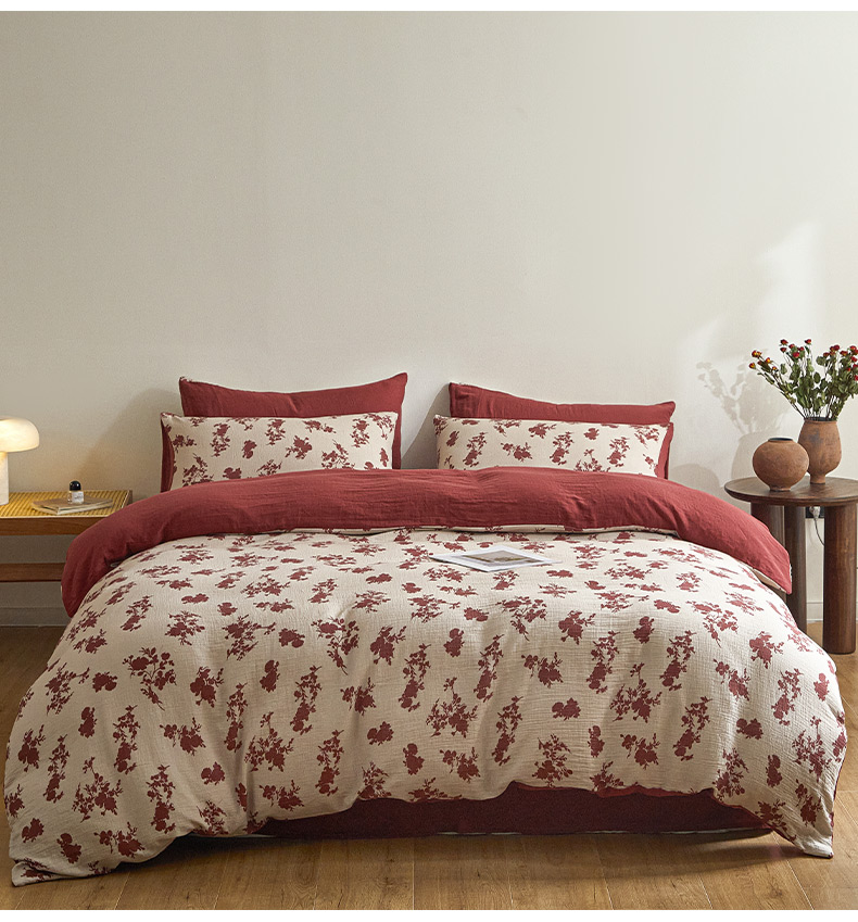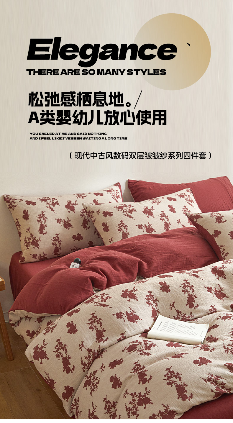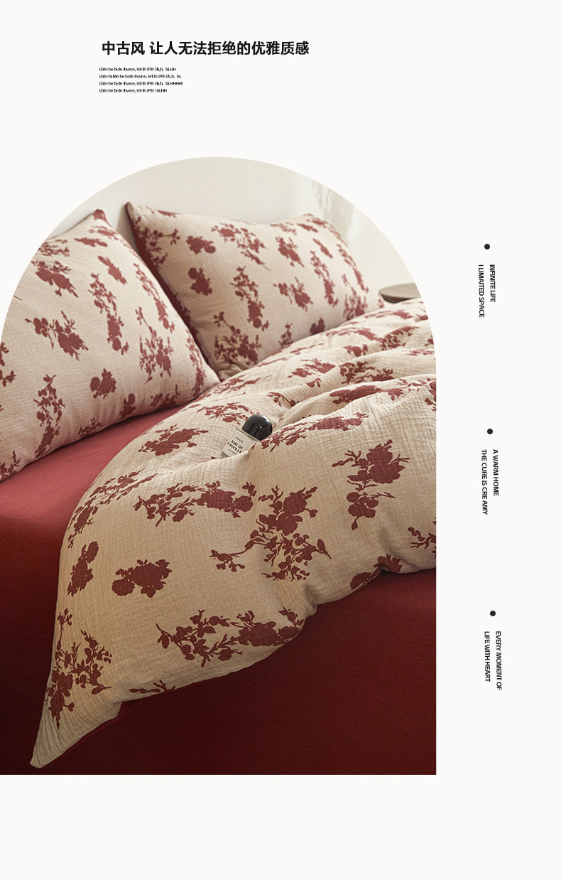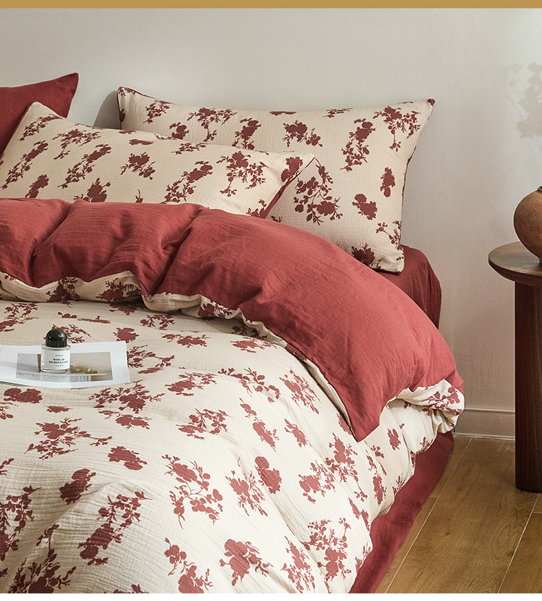 商品名称:卡巴伦家纺 2025新款全棉双层皱皱纱现代中古风数码四件套 细雨汀花-红
