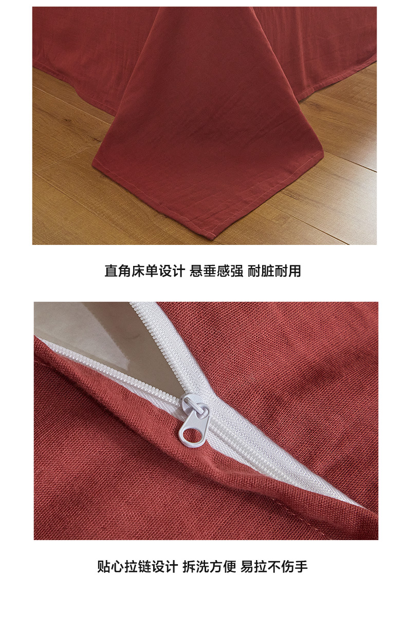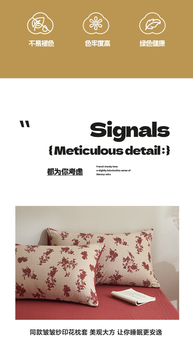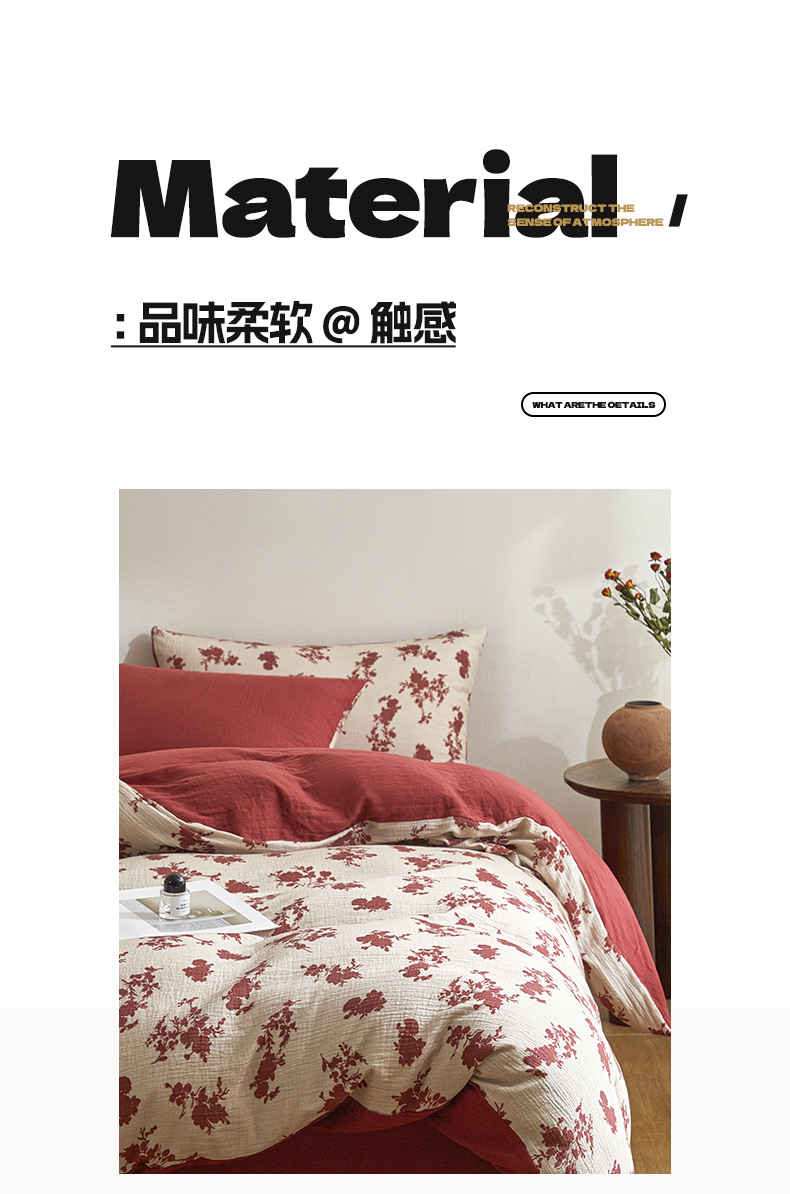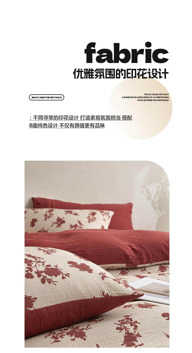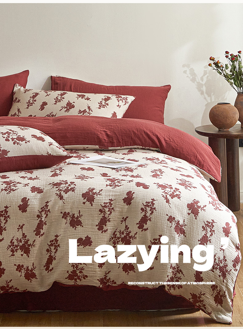 商品名称:卡巴伦家纺 2025新款全棉双层皱皱纱现代中古风数码四件套 细雨汀花-红