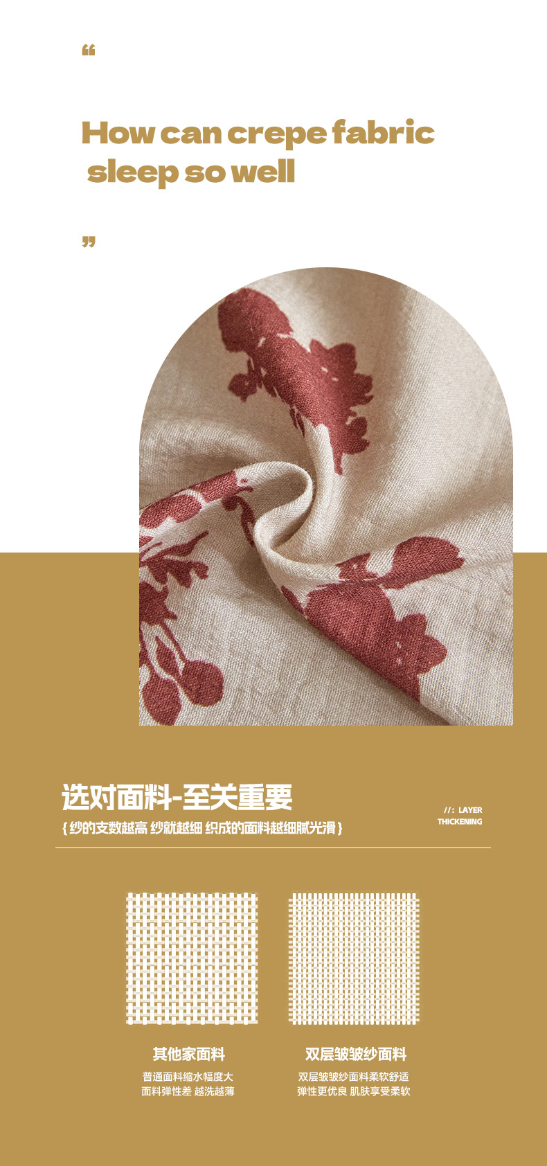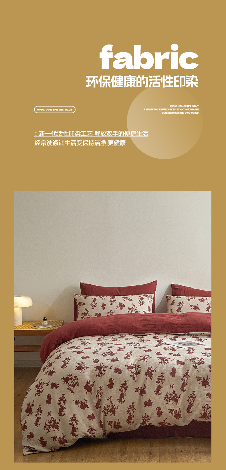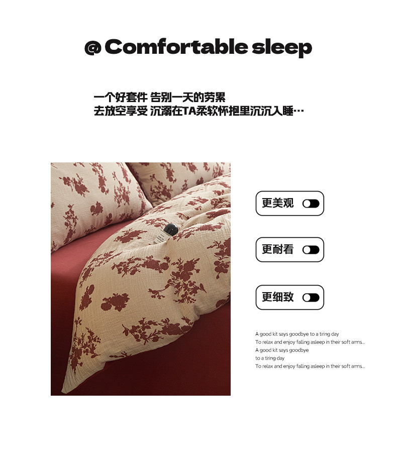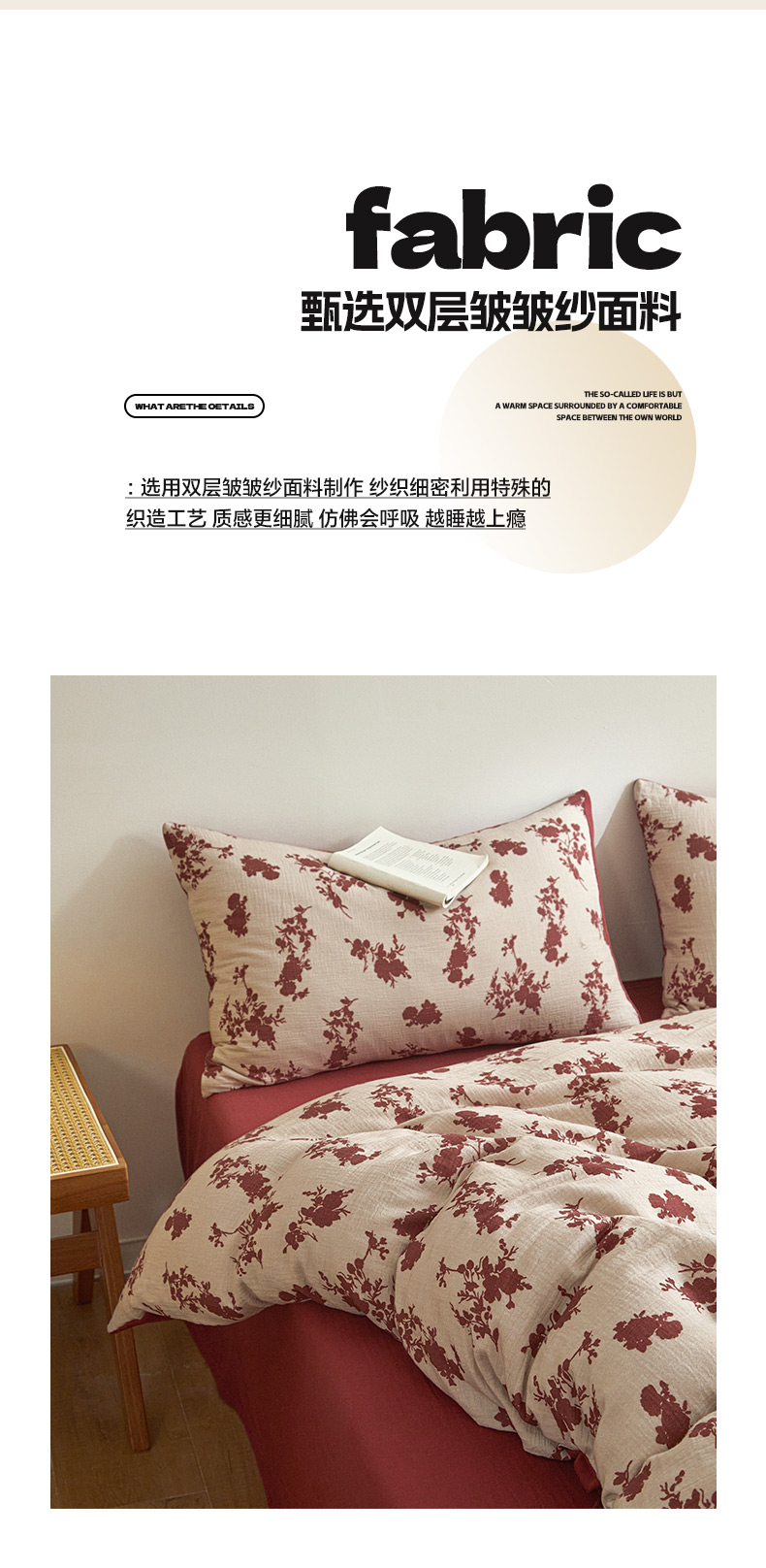 商品名称:卡巴伦家纺 2025新款全棉双层皱皱纱现代中古风数码四件套 细雨汀花-红