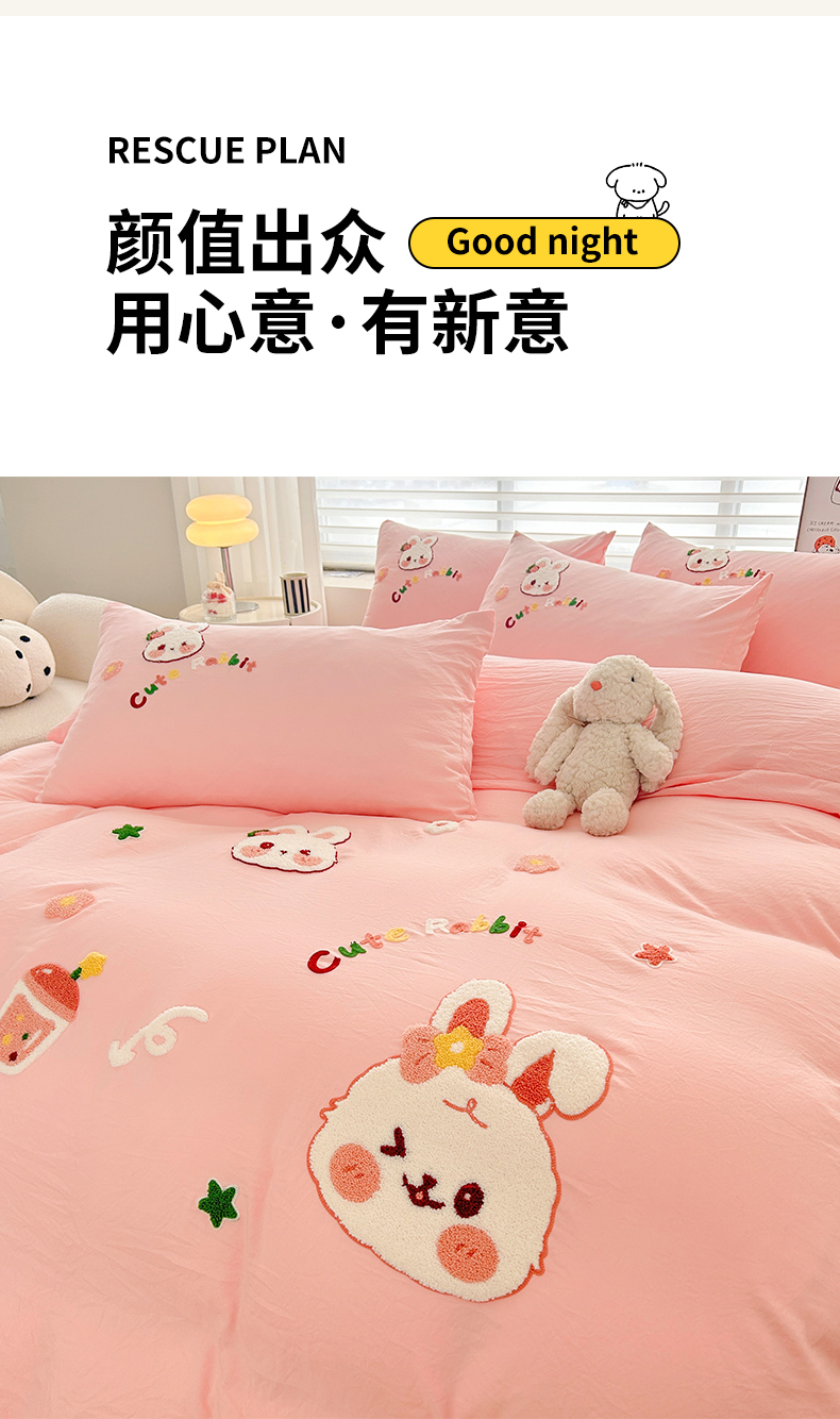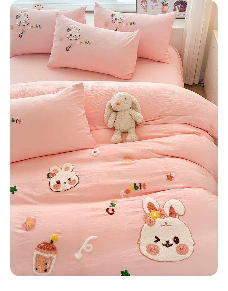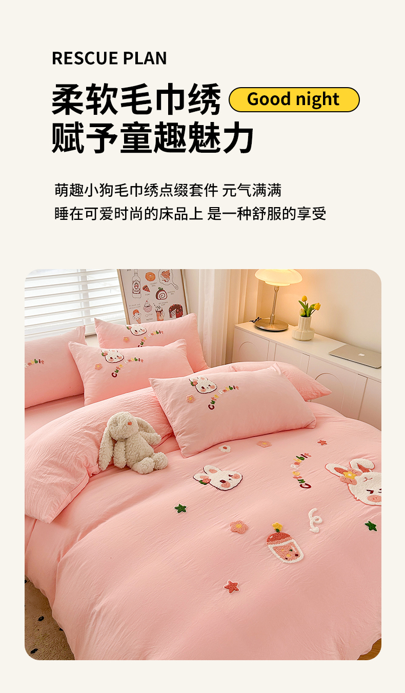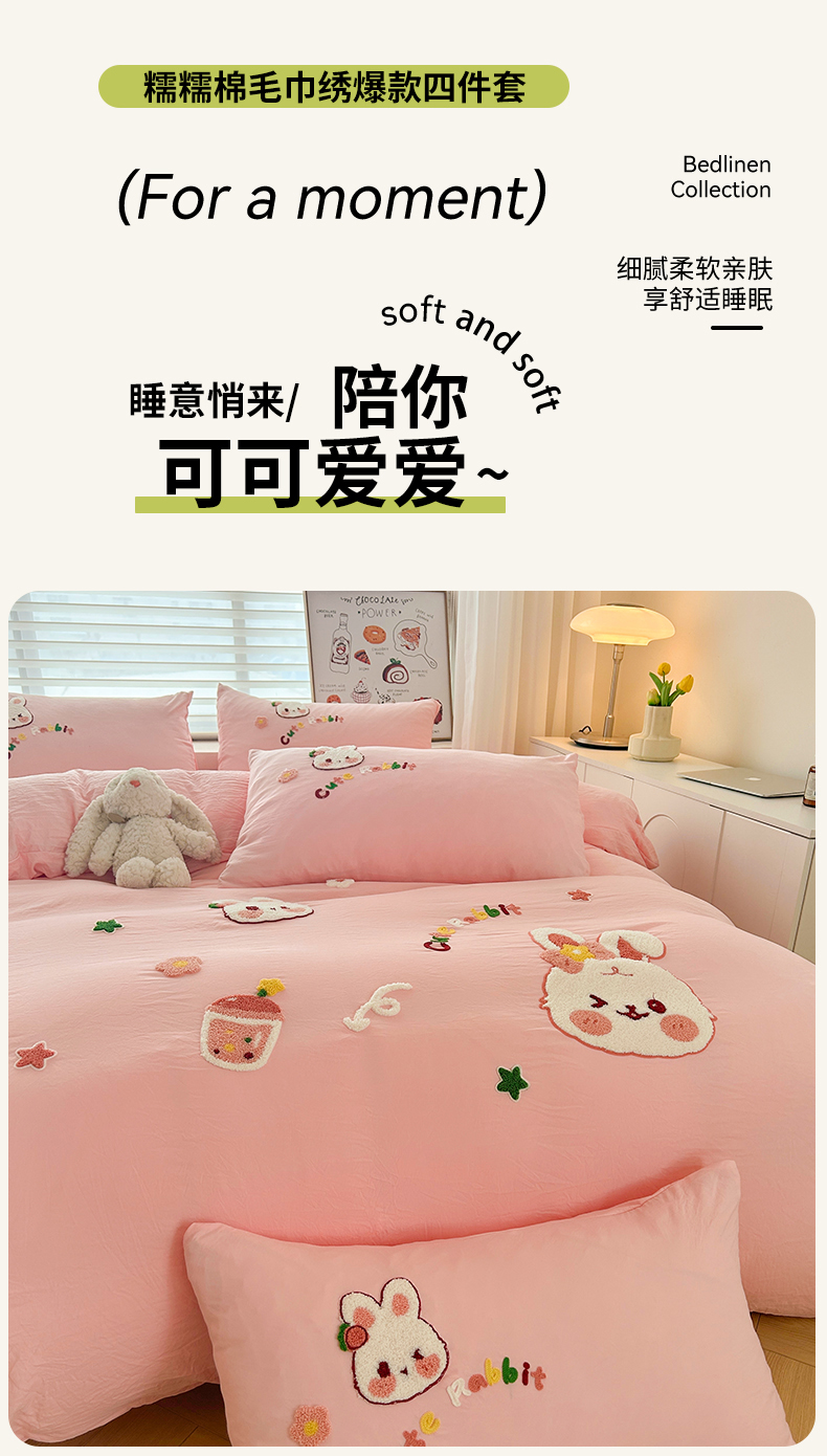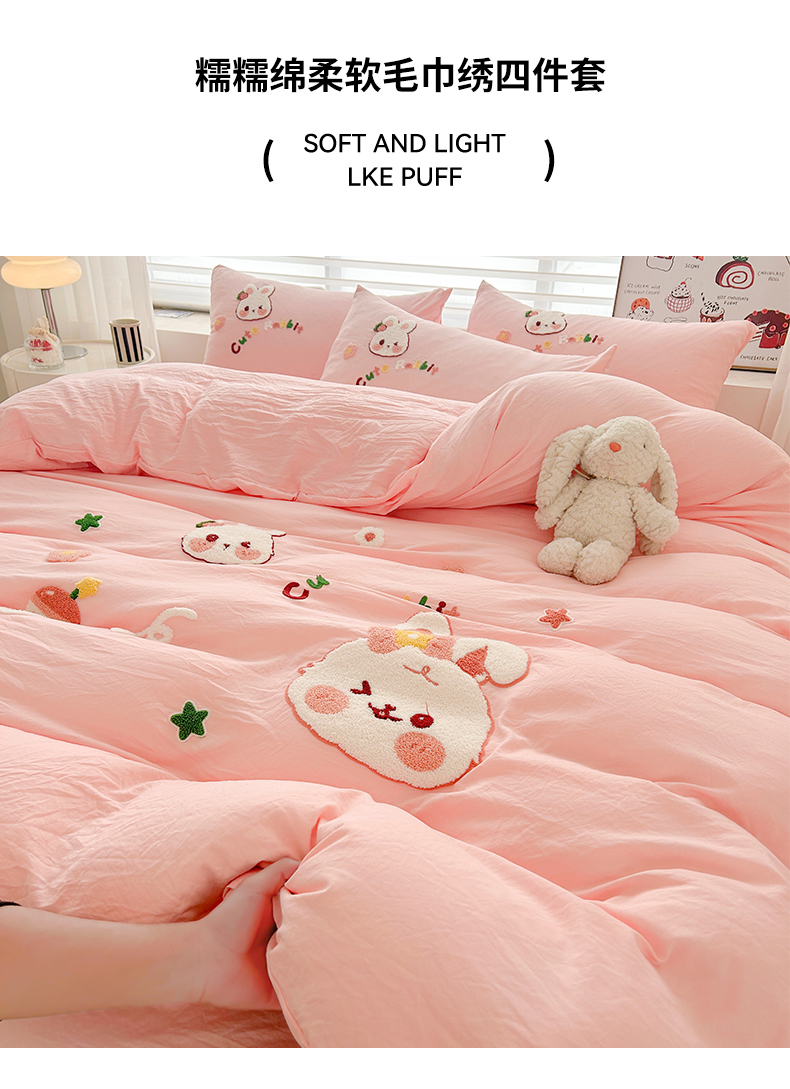 包小包 2025新款糯糯绵毛巾绣可爱卡通爆款四件套 奶油兔-粉