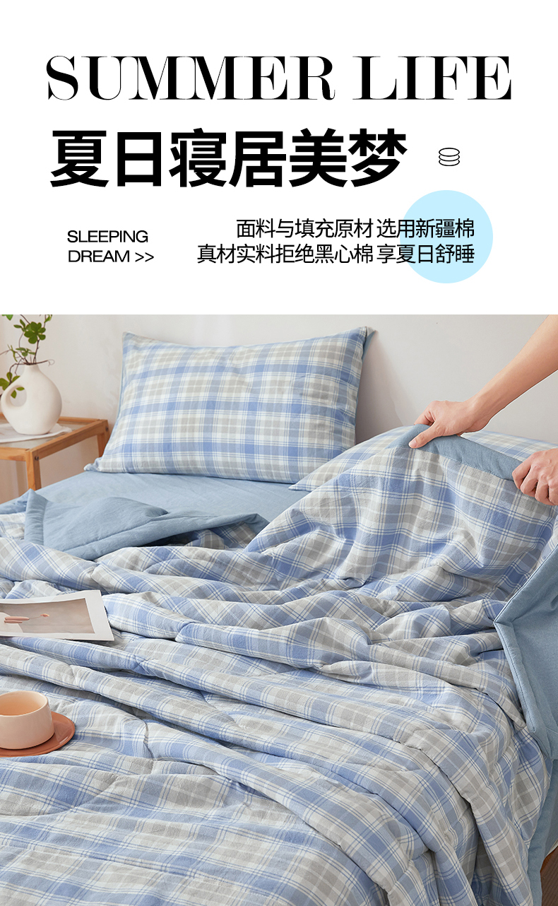 被子 > 夏被 > 2025新款A类里外全棉夏凉被100%新疆棉纯棉全棉填充无印格子款空调被原棉夏被 里外全棉-韵蓝格
