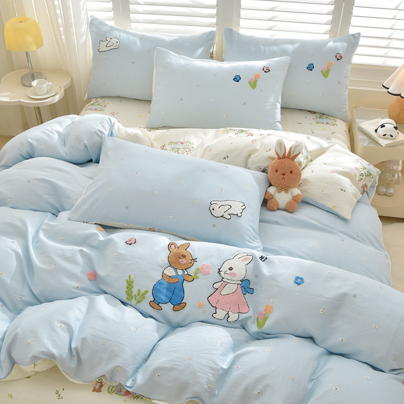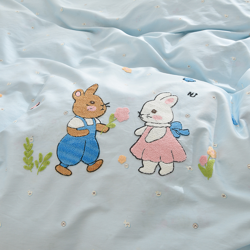 乐窝家纺仓储 2025新款全棉纯棉毛巾绣四件套 小兔子
