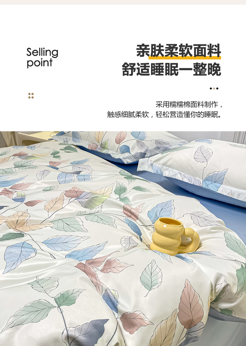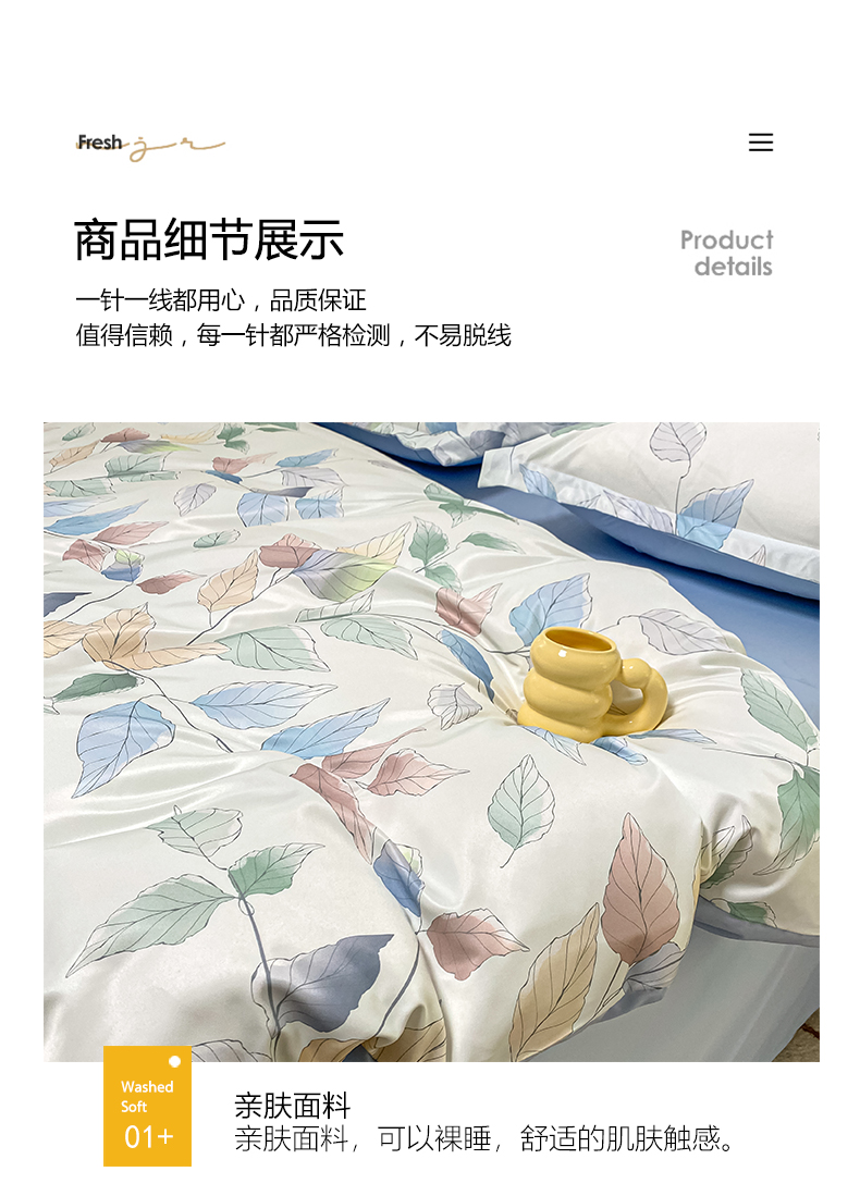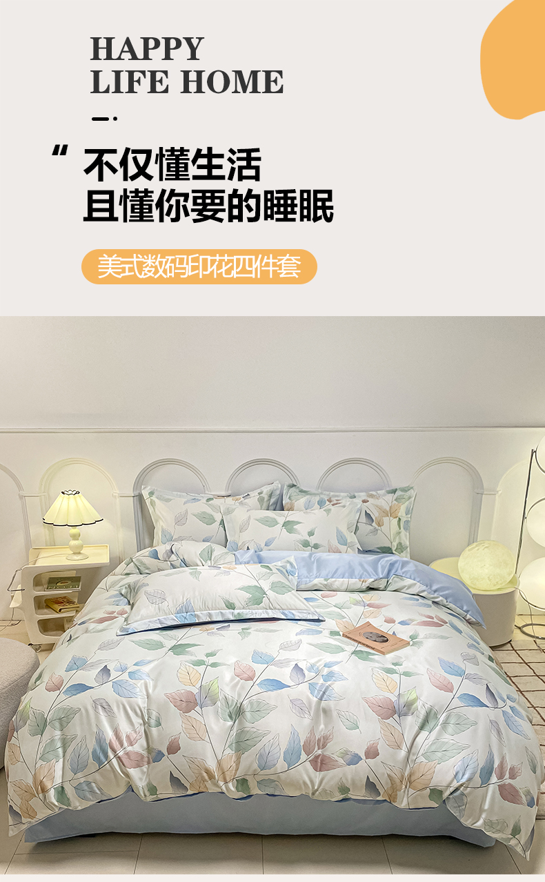 商品名称:2025新款水洗冰丝美式数码印花四件套轻奢时尚北欧风床上用品学生宿舍三四件套 柳叶绿