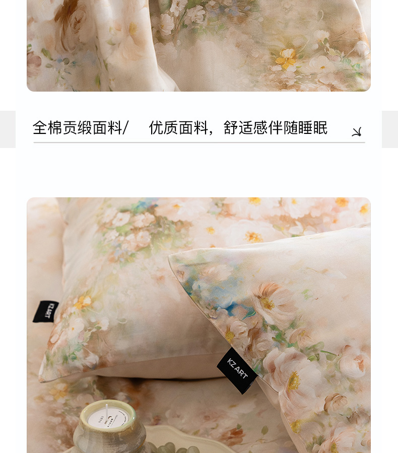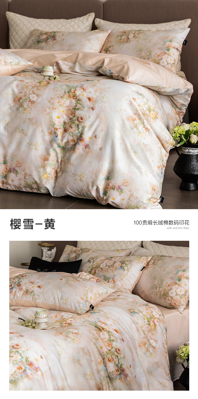 商品名称:佳汐蓝家纺 2025新款春夏60S贡缎长绒棉数码印花四件套 樱雪-黄