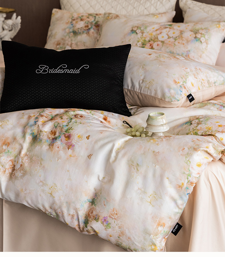 佳汐蓝家纺 2025新款春夏60S贡缎长绒棉数码印花四件套 樱雪-黄