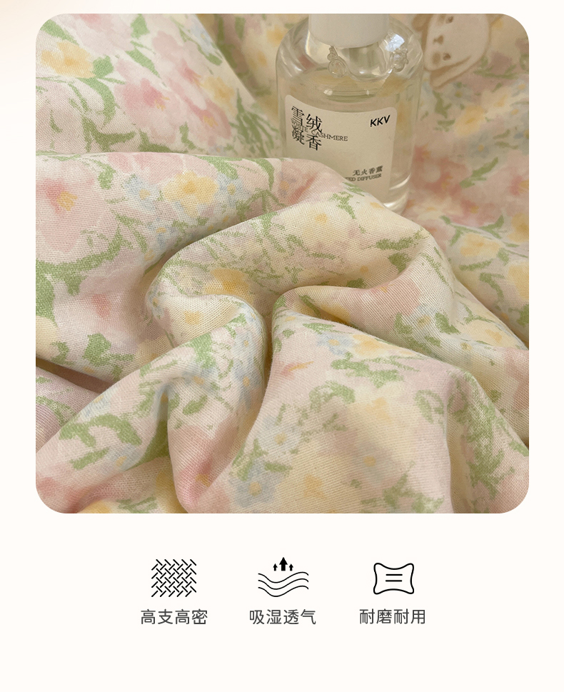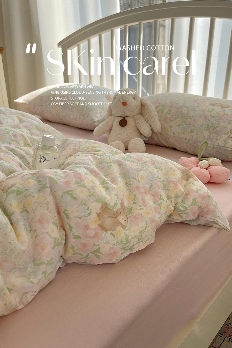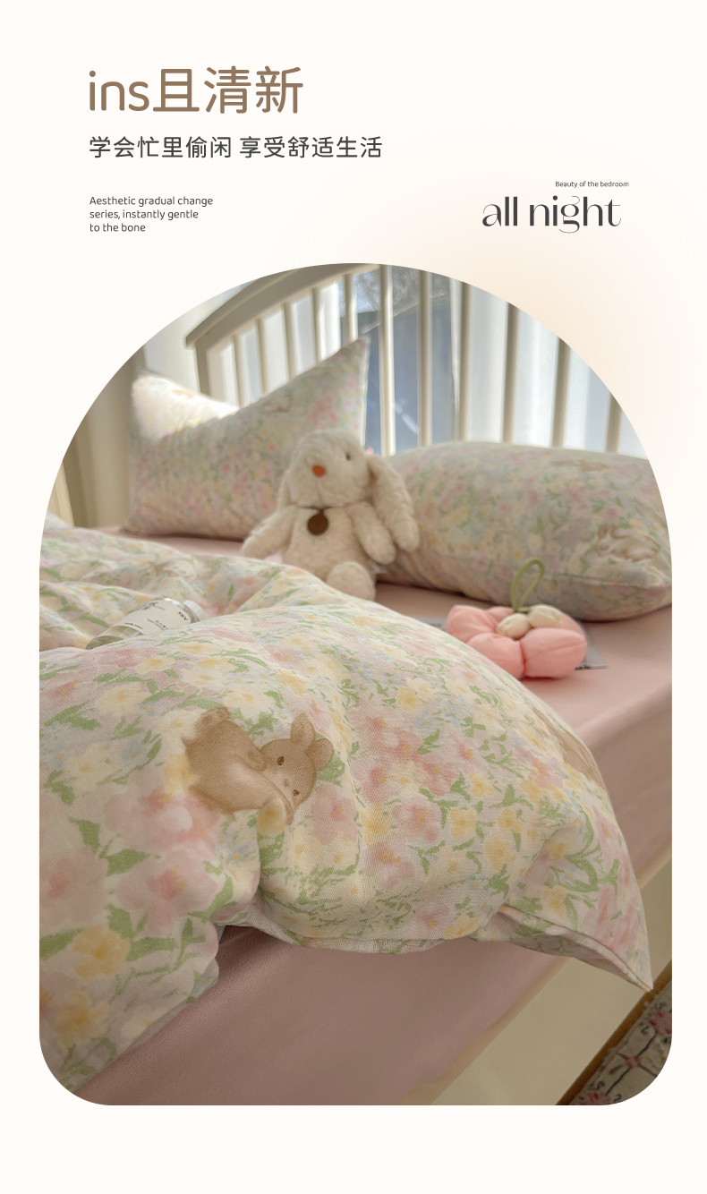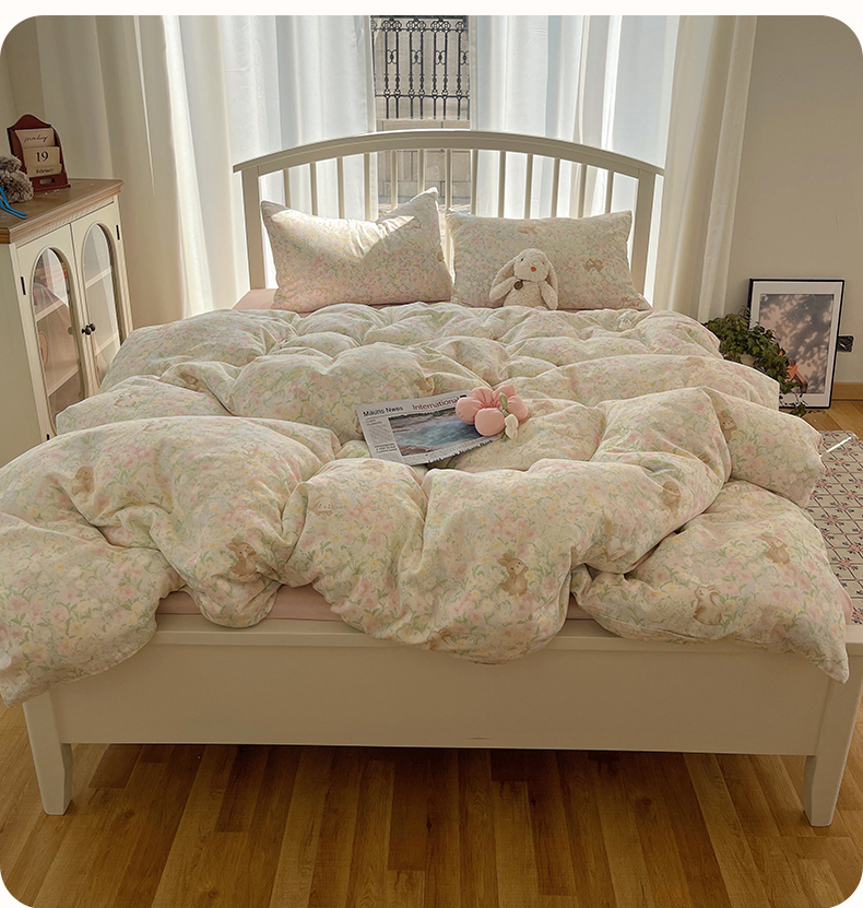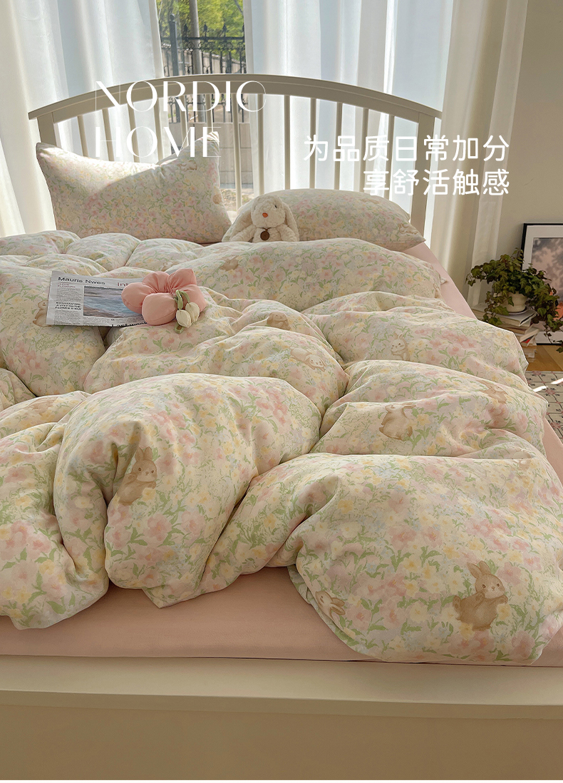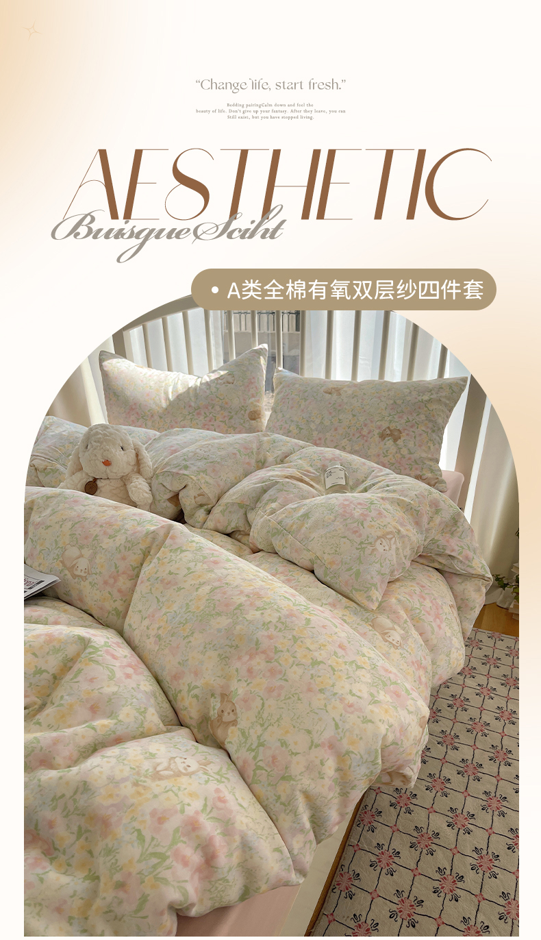 瑞莱 2025夏季新款全棉纯棉有氧双层纱四件套 梦幻花园兔