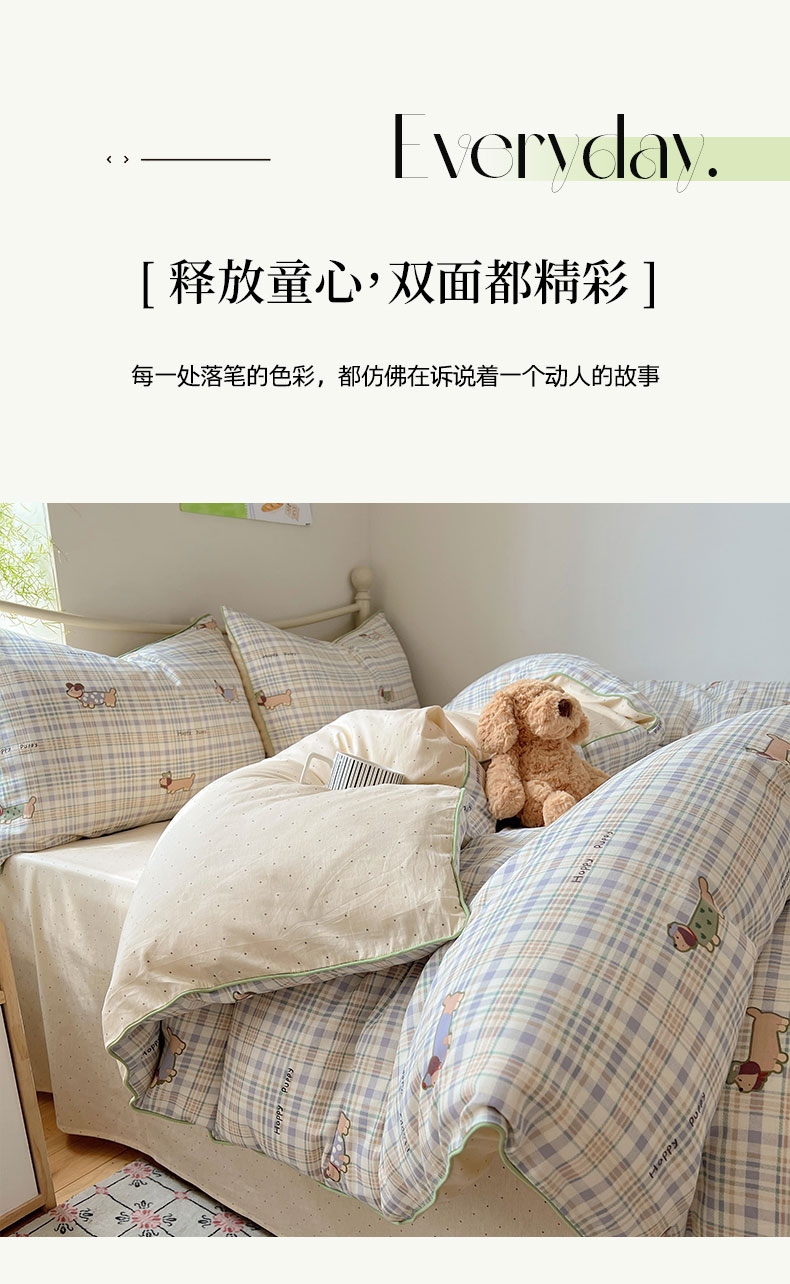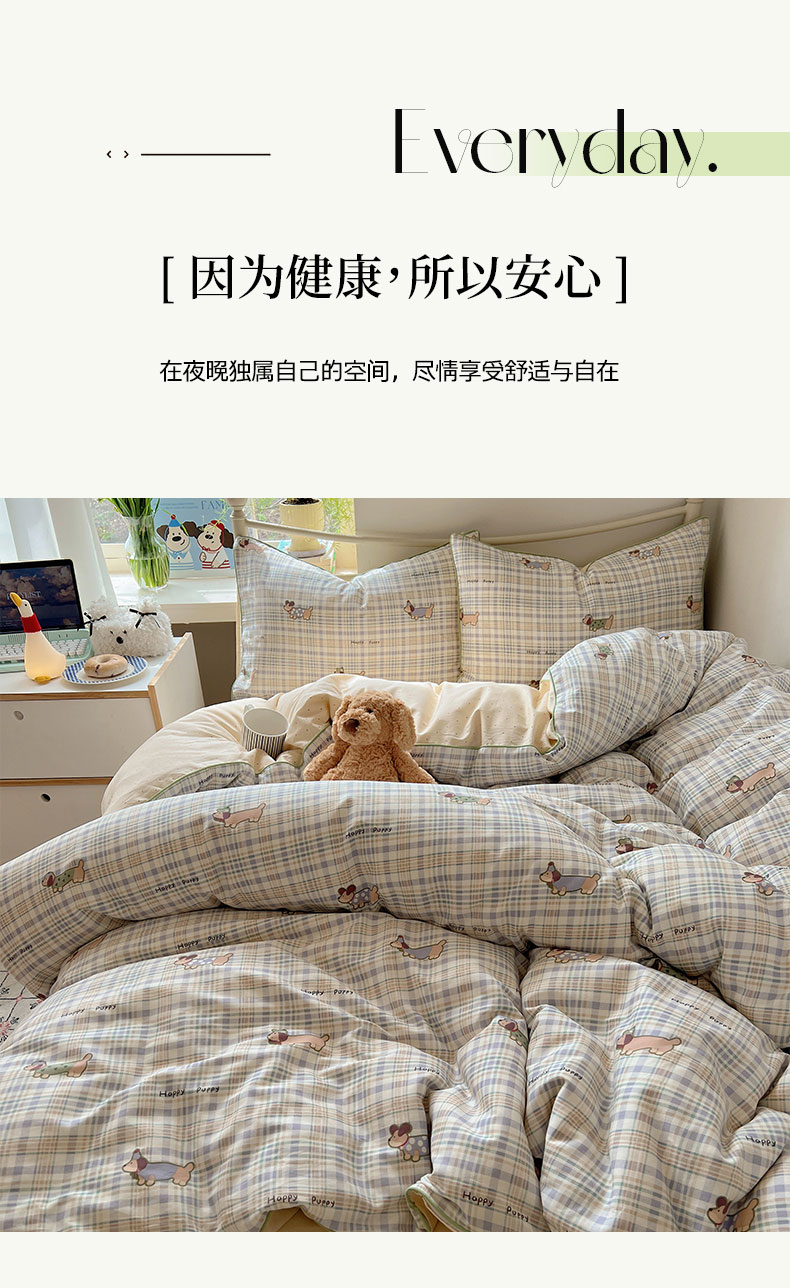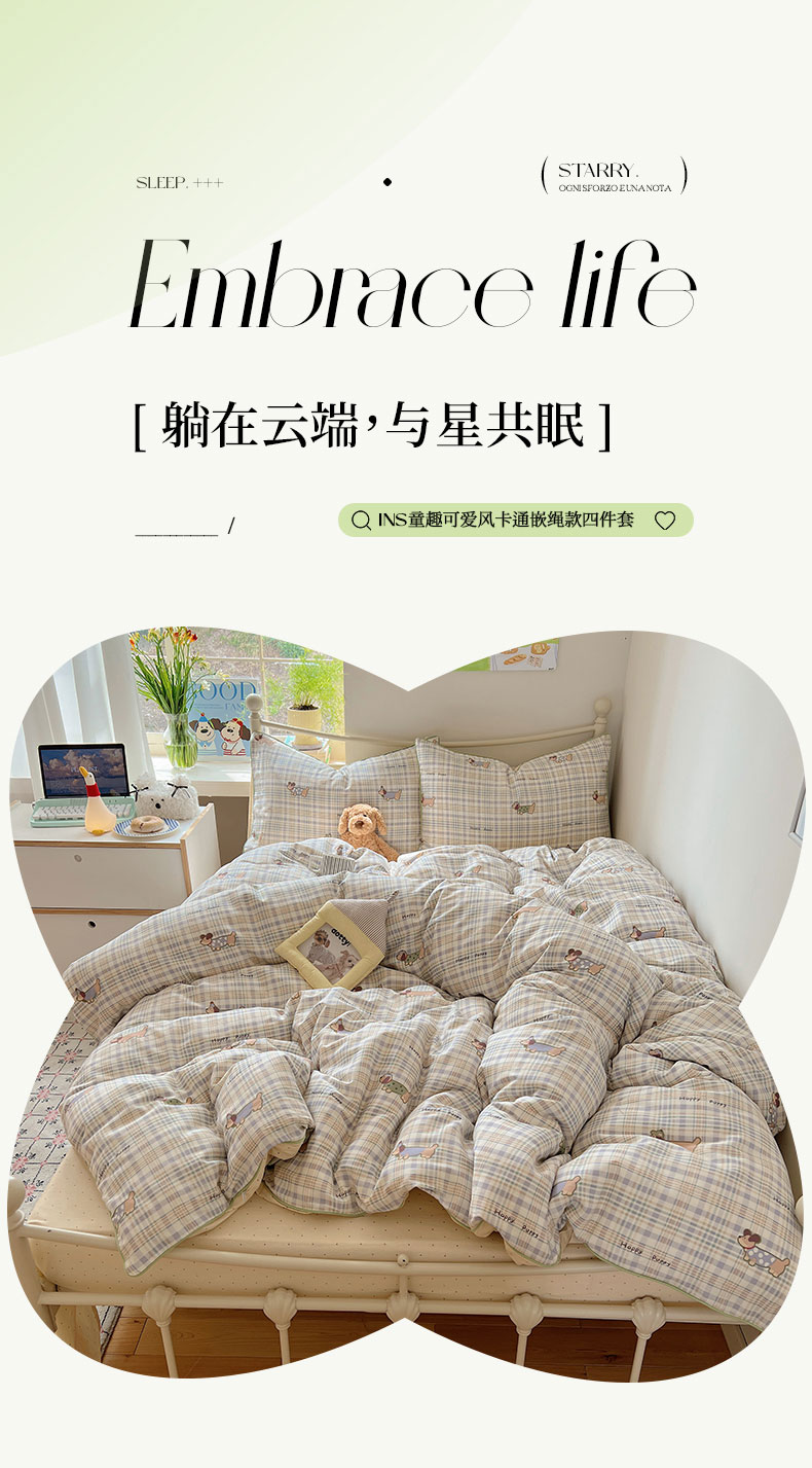商品名称:六巷胡同 2025新款40S全棉纯棉INS童趣可爱风卡通嵌绳款四件套 嵌绳格纹腊肠狗