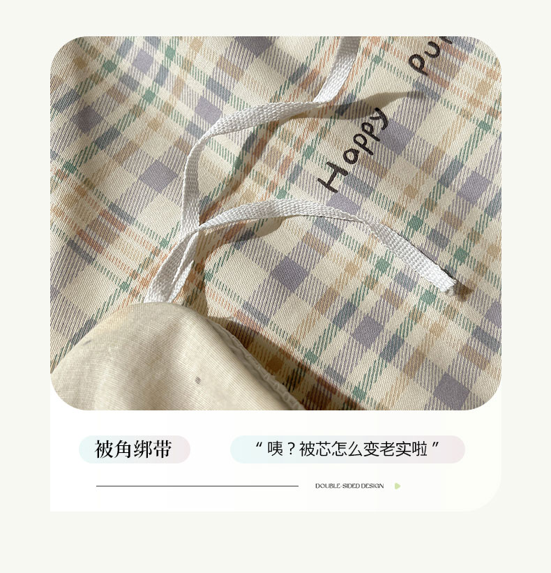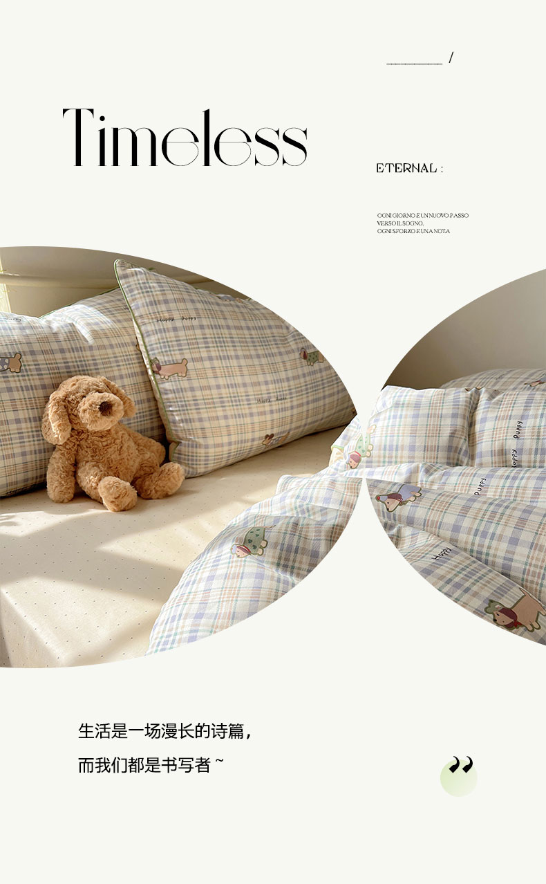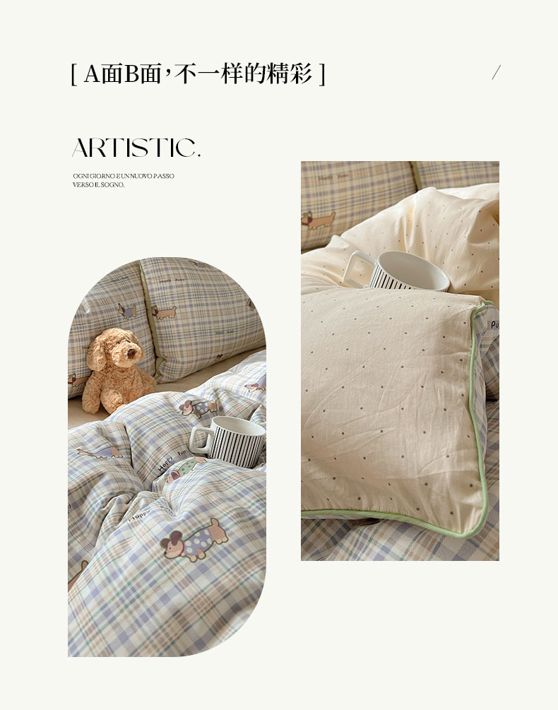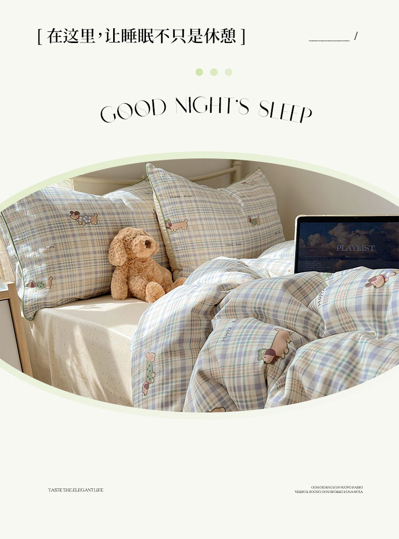商品名称:六巷胡同 2025新款40S全棉纯棉INS童趣可爱风卡通嵌绳款四件套 嵌绳格纹腊肠狗