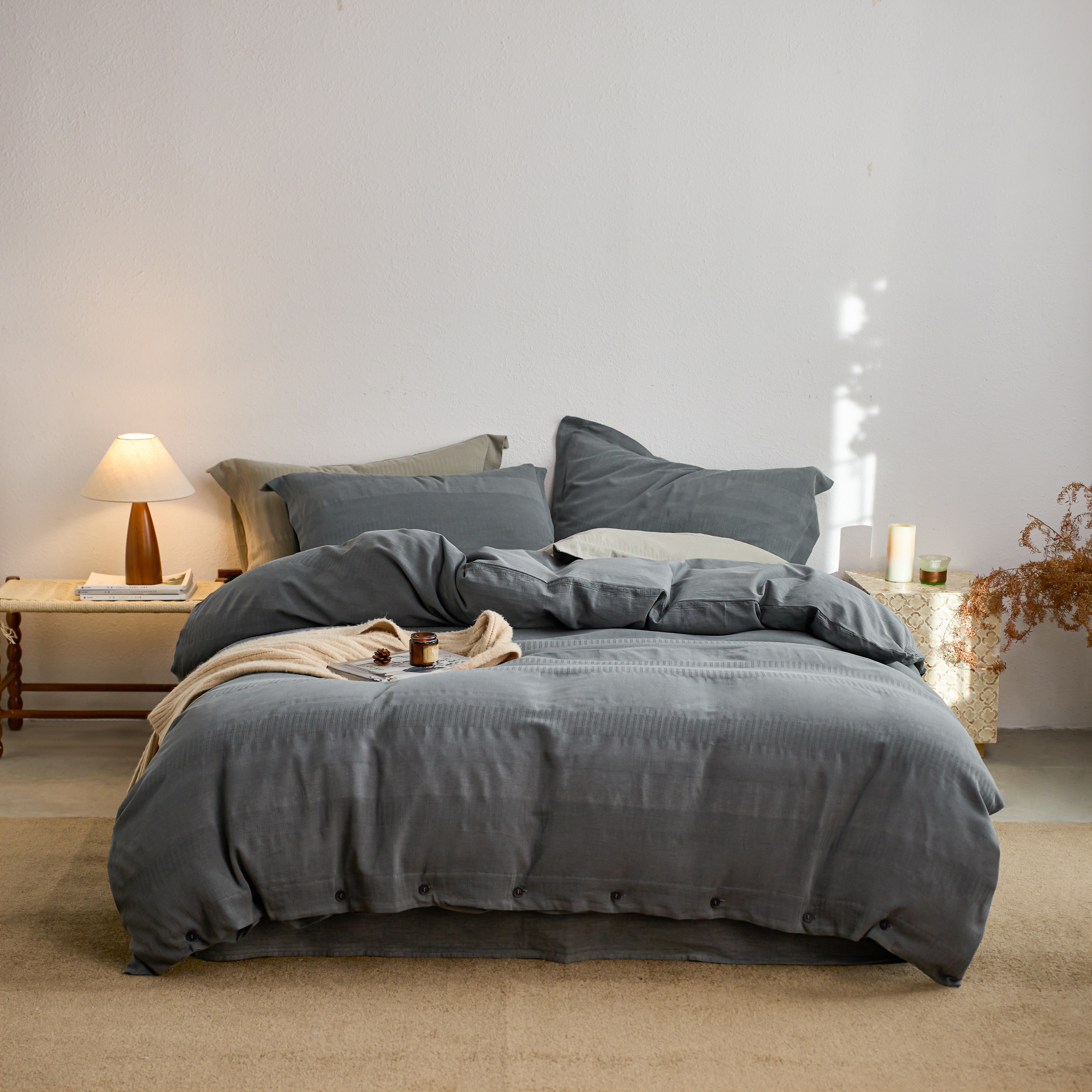 安莱生活 2025新款全棉纯棉纱洗纽扣款大提花四件套--艾伦 艾伦-深灰