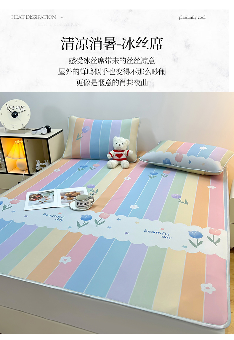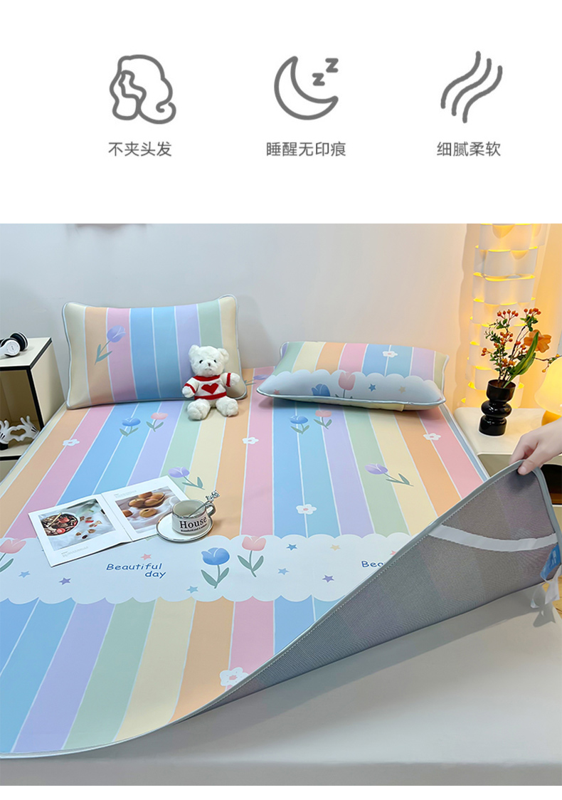 商品名称:柏薇 2025新款凉感丝中分子印花复合三明治凉席套件 五彩花朵