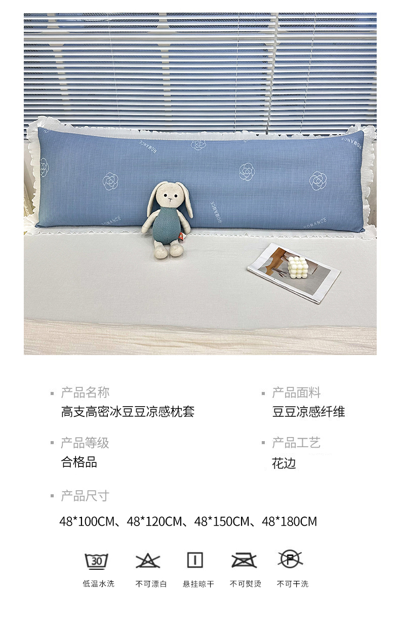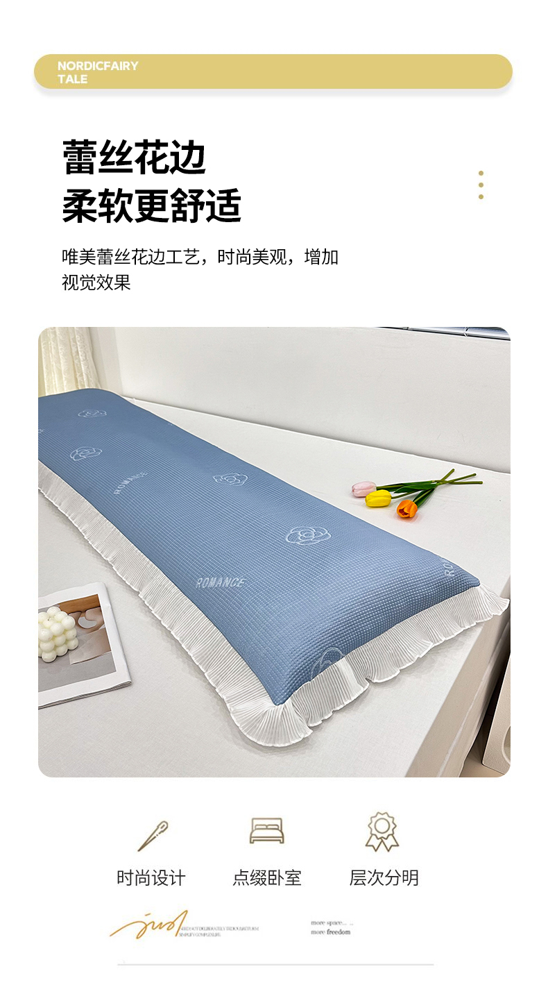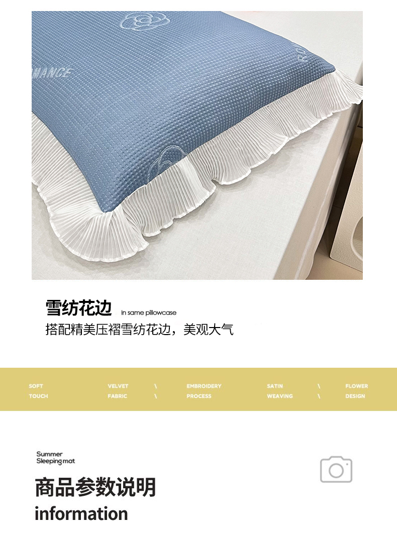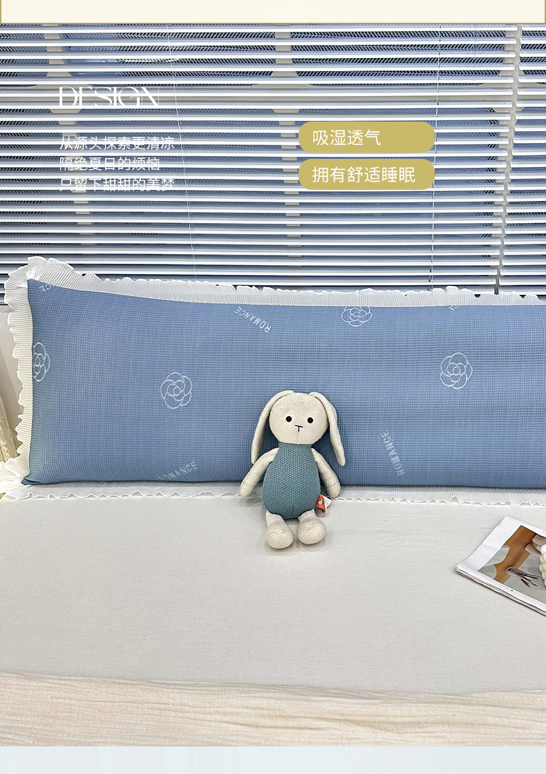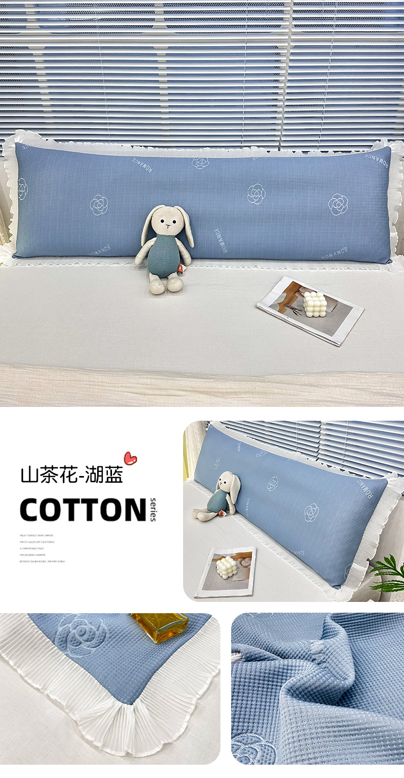 商品名称:雨彤家纺 2025新款冰豆豆蕾丝花边双人长枕套单品枕套枕套单件 山茶花-湖蓝