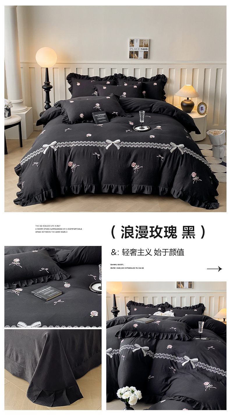 商品名称:大麦乐田 2025爆款韩版法式 满版刺绣大宽花边吊边款四件套 浪漫玫瑰 黑
