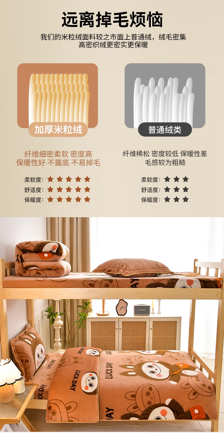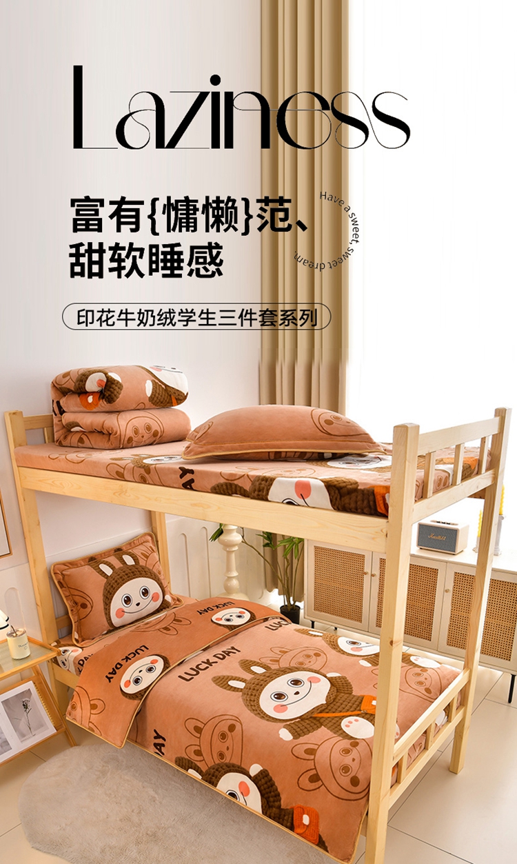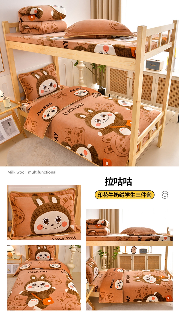 商品名称:馨梦缘2025新款爆款高克重印花牛奶绒法莱绒学生三件套 拉咕咕