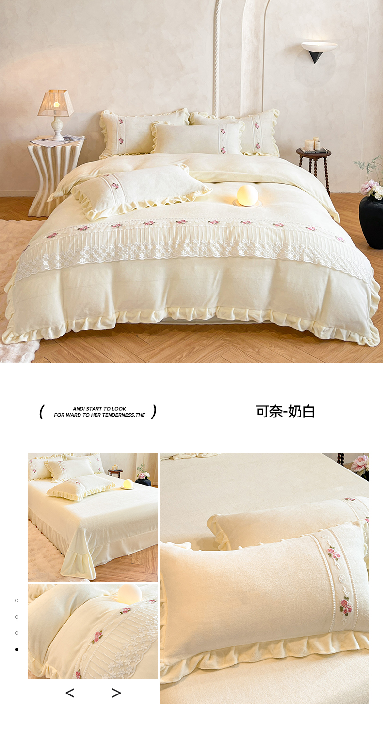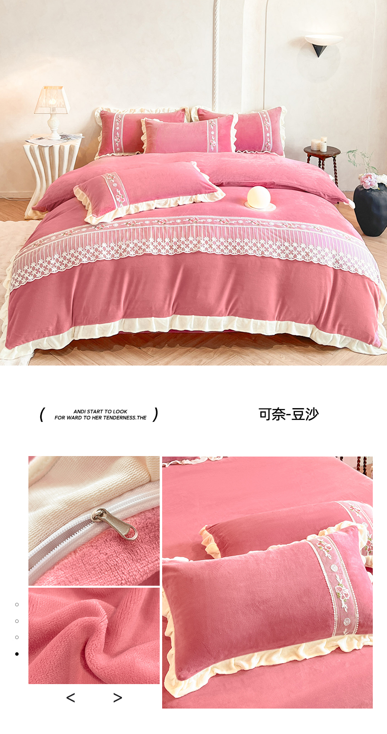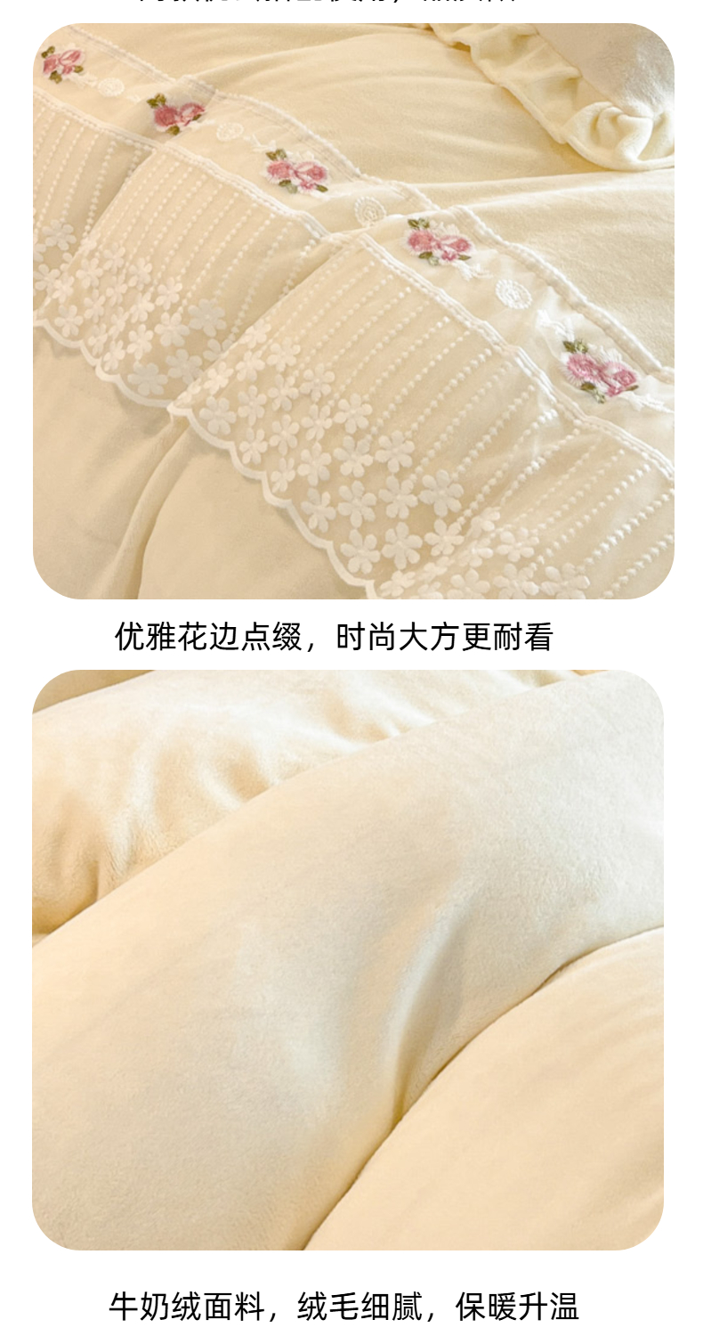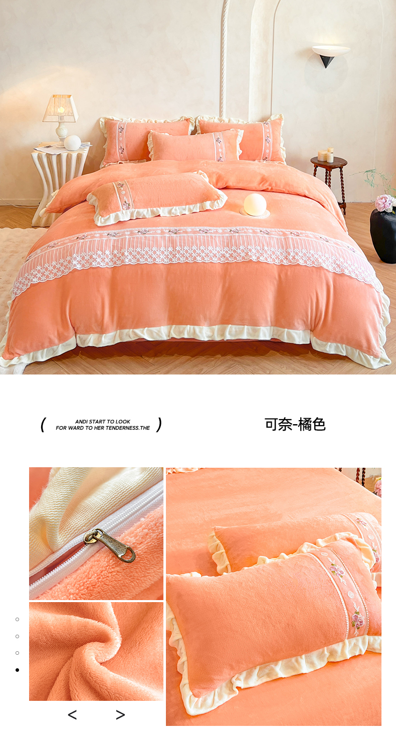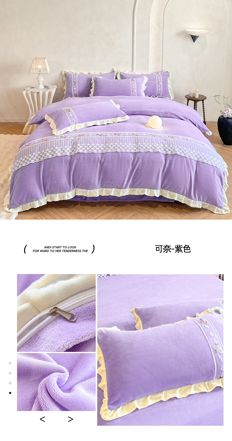 (总)舒咪欧 2025新款绣花全消光牛奶绒宝宝绒花边四件套-可奈,可奈-豆沙,可奈-粉玉,可奈-橘色,可奈-奶白,可奈-天兰,可奈-紫色