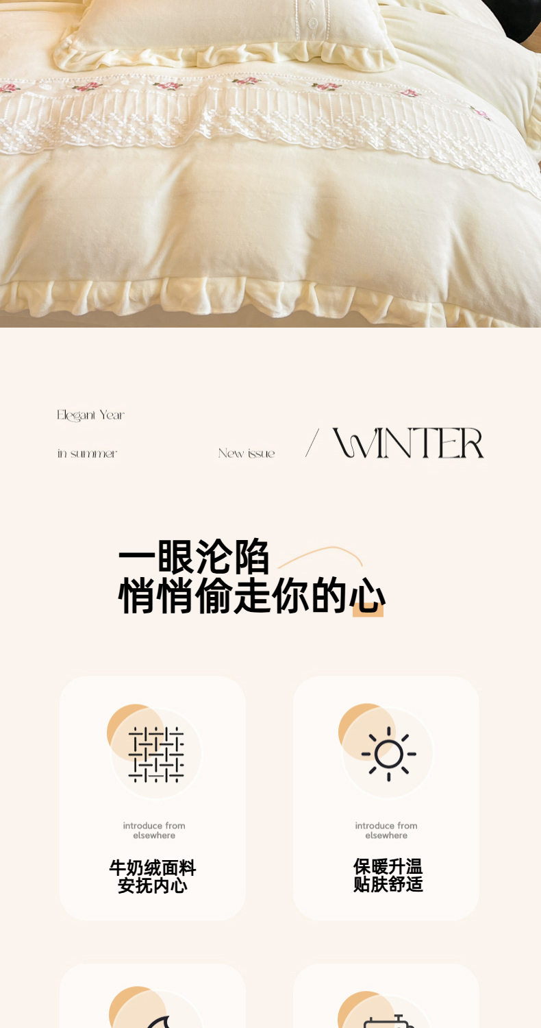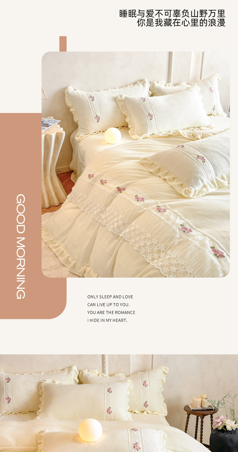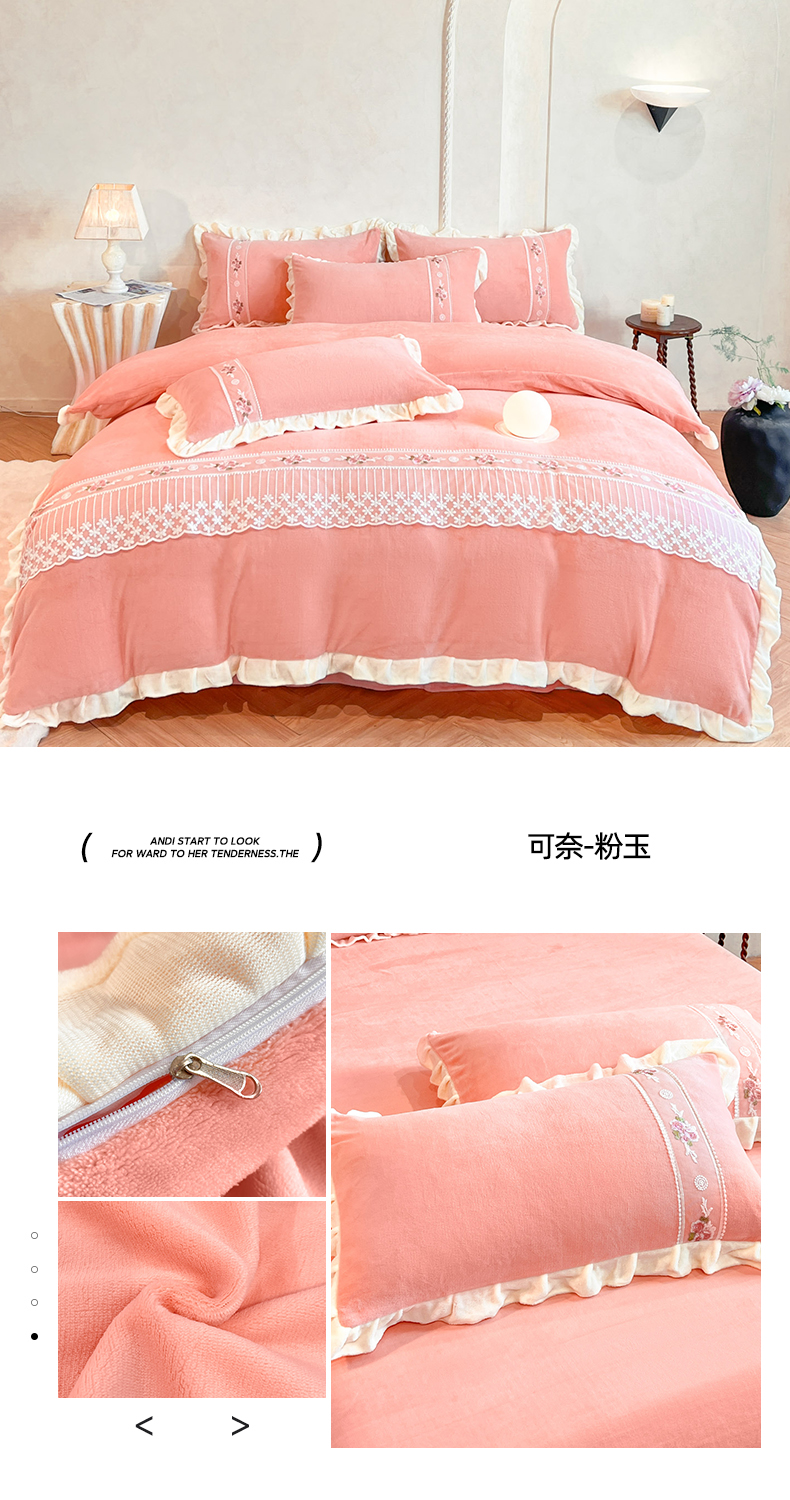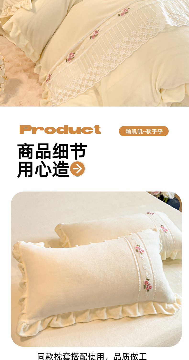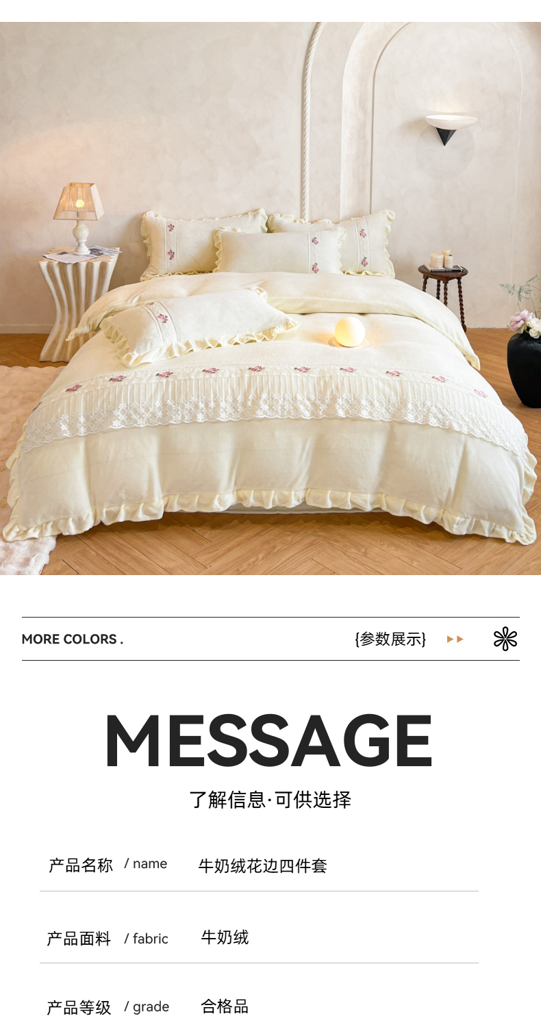 (总)舒咪欧 2025新款绣花全消光牛奶绒宝宝绒花边四件套-可奈,可奈-豆沙,可奈-粉玉,可奈-橘色,可奈-奶白,可奈-天兰,可奈-紫色