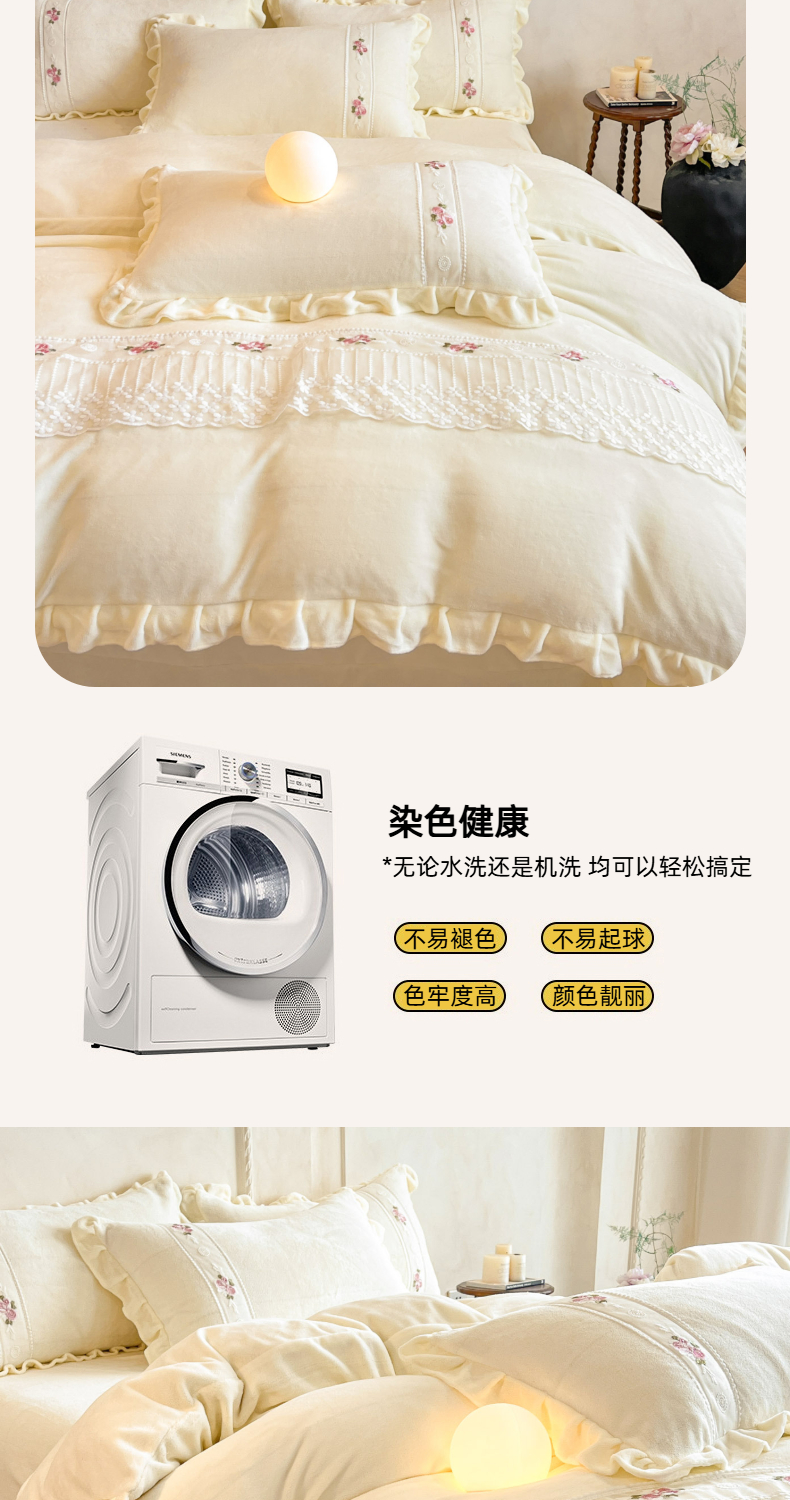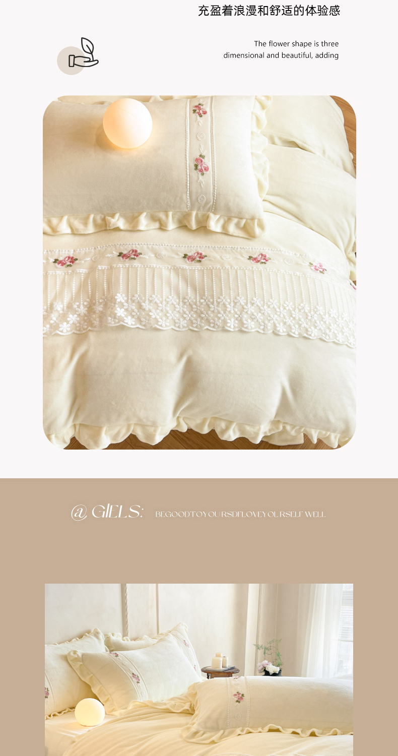(总)舒咪欧 2025新款牛奶绒刺绣花边 法式公主风四件套艾莎系列,艾莎-粉色,艾莎-奶白,艾莎-紫色,艾莎-天兰,艾莎-黄色,艾莎-玫红,艾莎-绿色