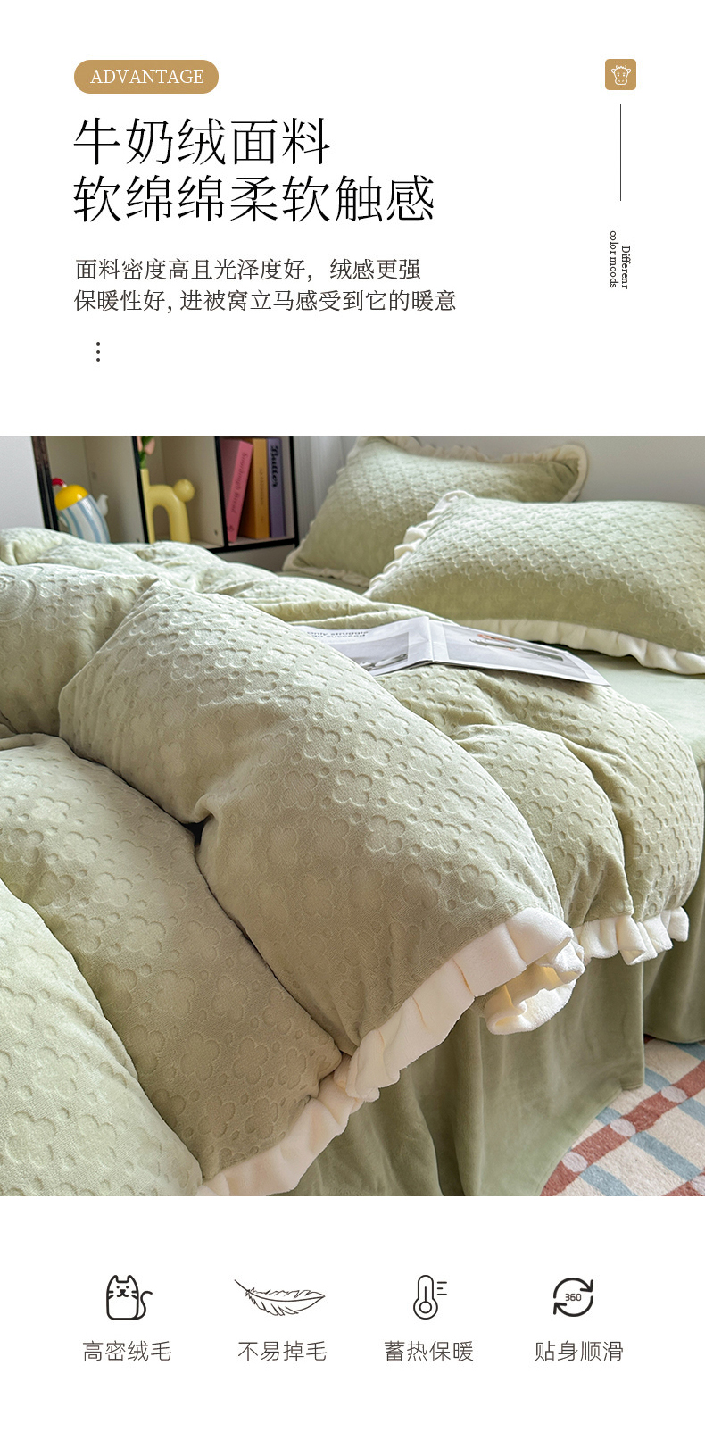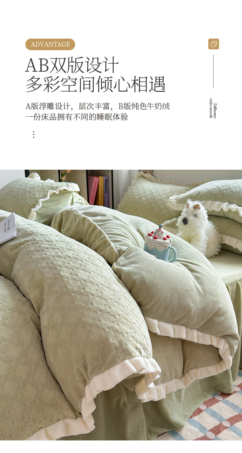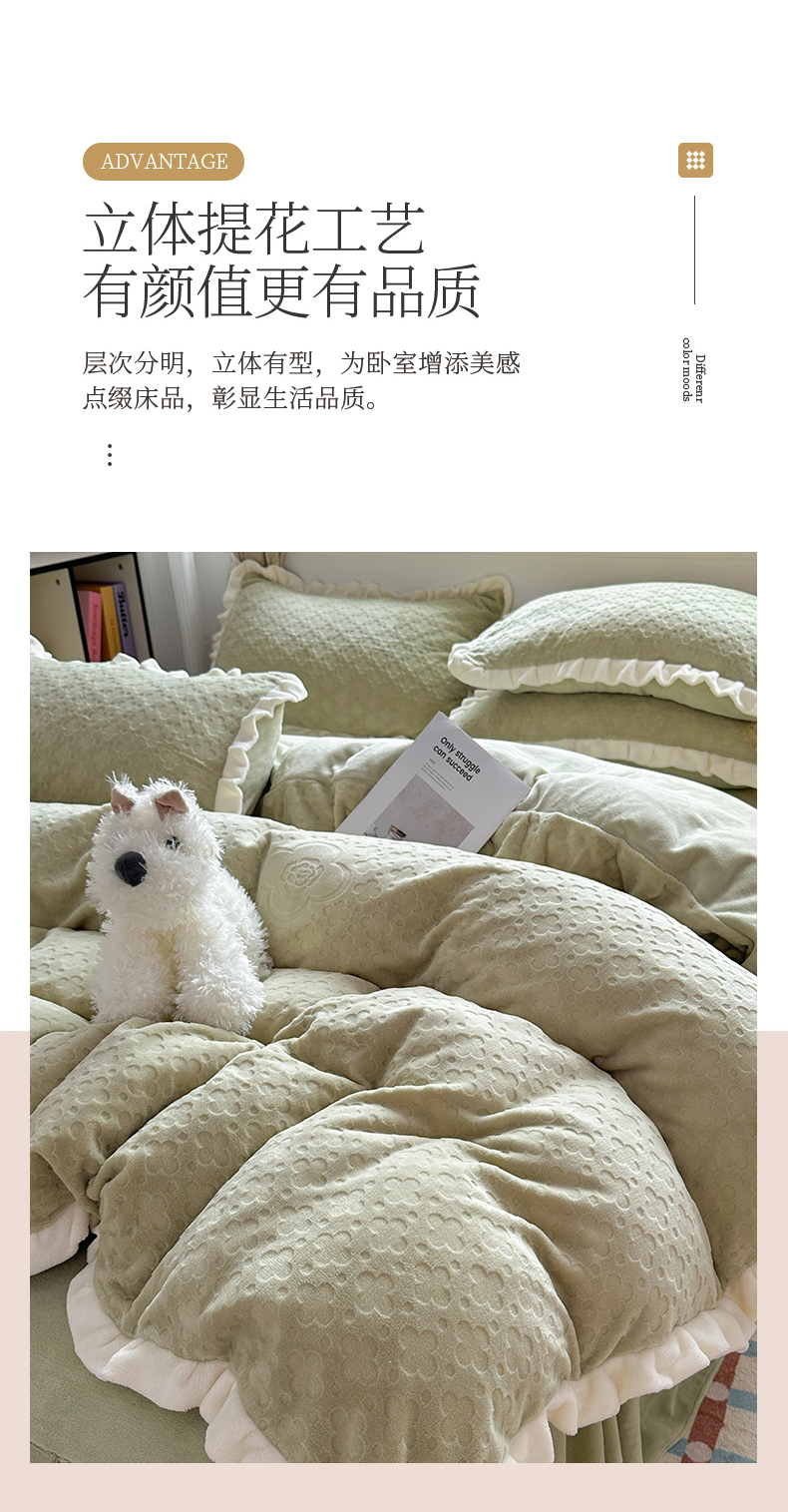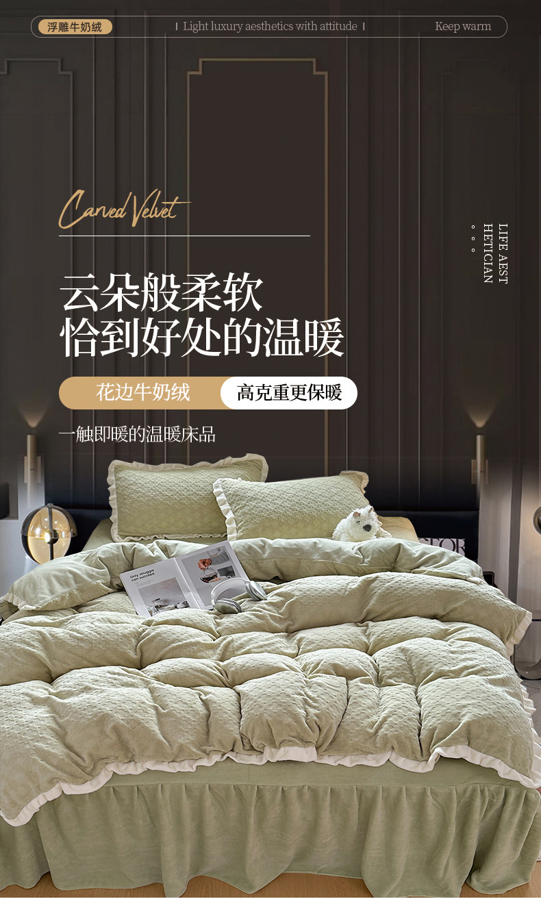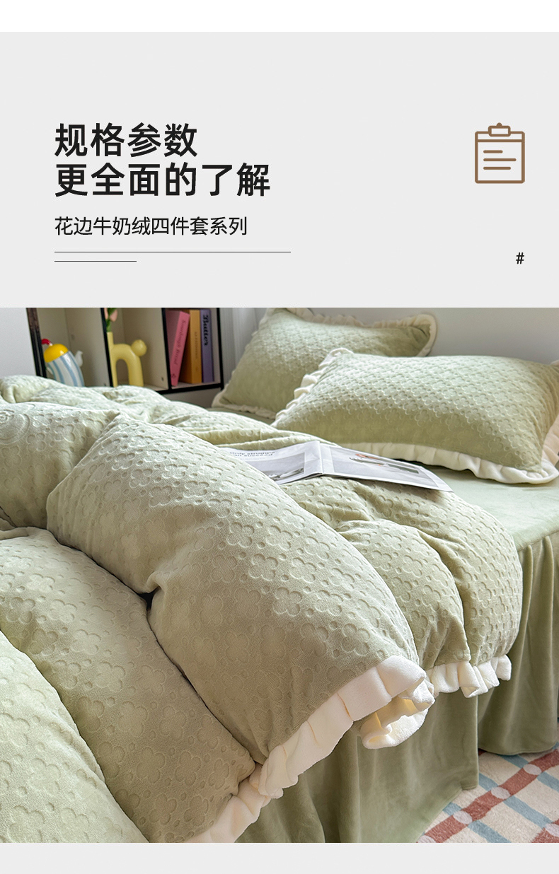 当前位置: 91家纺网 > 商品网购 > 床品套件 > 四件套 > 牛奶绒四件套 > KA家纺 2025秋冬新款床裙款雕花牛奶绒四件套-繁花系列 繁花绿