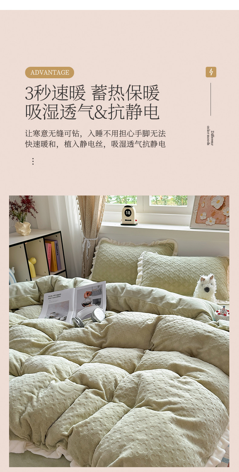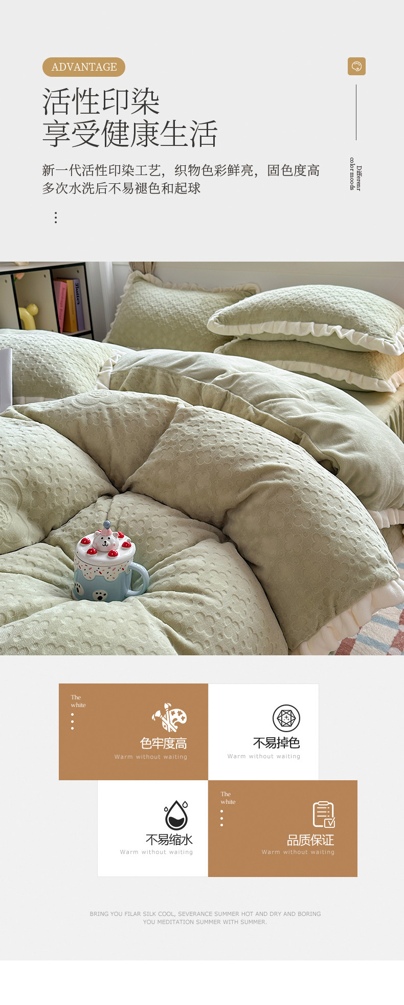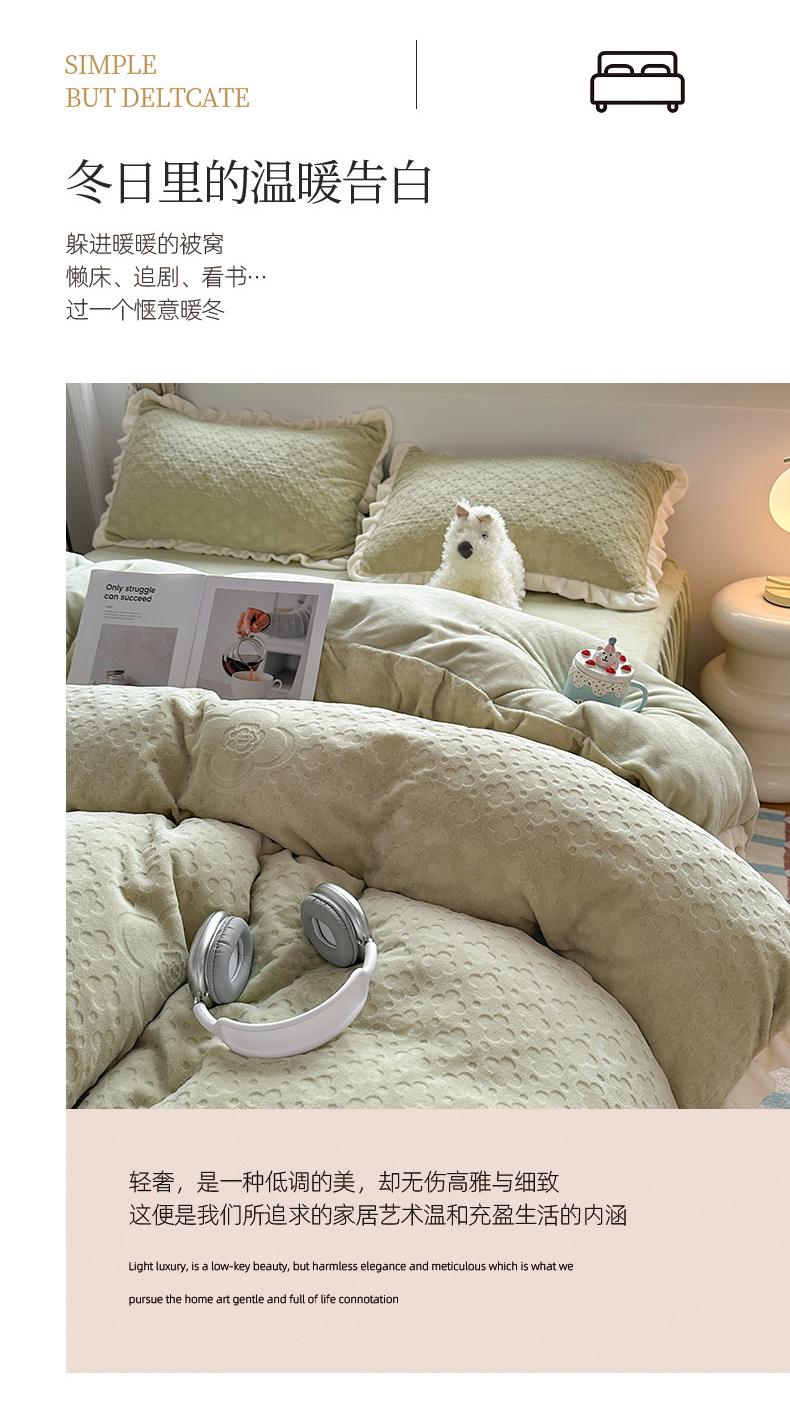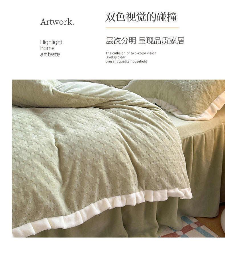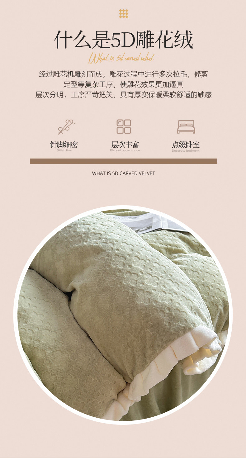 当前位置: 91家纺网 > 商品网购 > 床品套件 > 四件套 > 牛奶绒四件套 > KA家纺 2025秋冬新款床裙款雕花牛奶绒四件套-繁花系列 繁花绿
