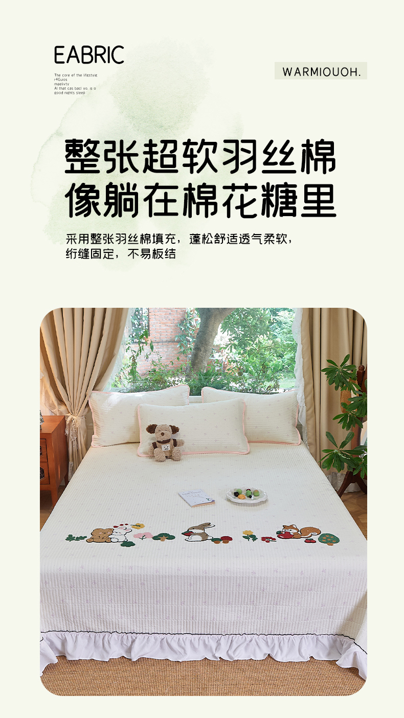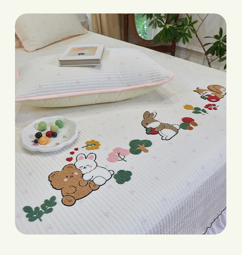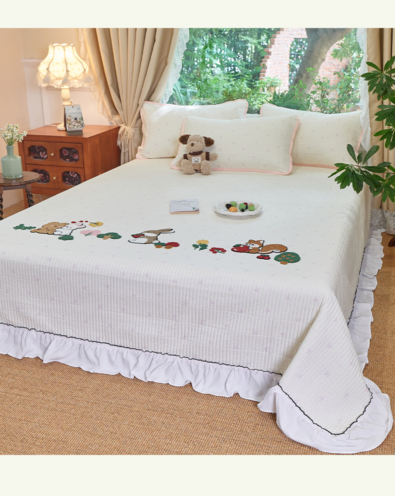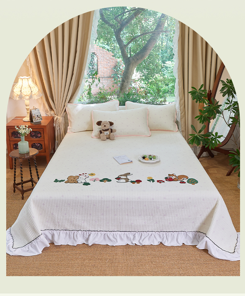 当前位置: 91家纺网 > 商品网购 > 床品套件 > 三件套 > 鑫喜莱家纺 2025新款云朵棉毛巾绣花边款床盖三件套系列 童话森林-粉白