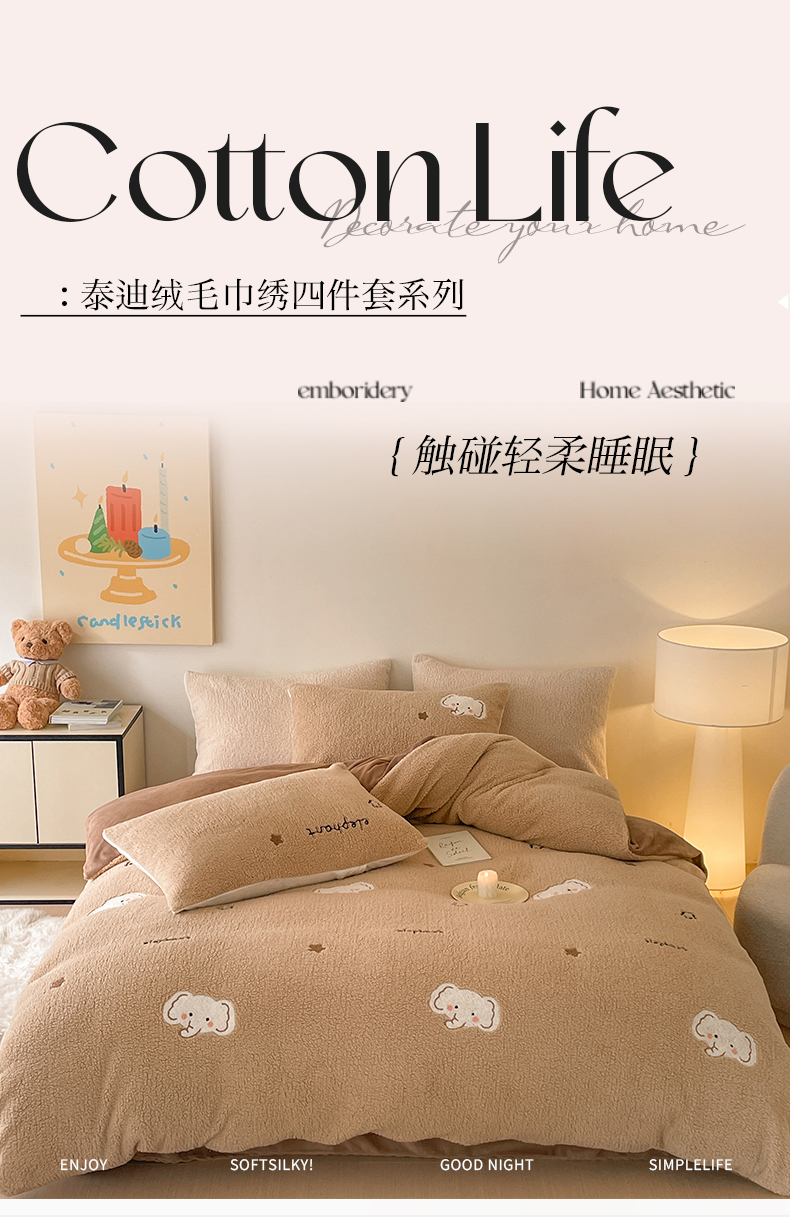 (总)川悦生活 2025新款泰迪绒毛巾绣卡通四件套,茶茶熊仔,狗仔派对,怪味南瓜,好梦小狗,花田兔宝,糯小熊,趣味萌宅,甜蜜兔妮,星空小象