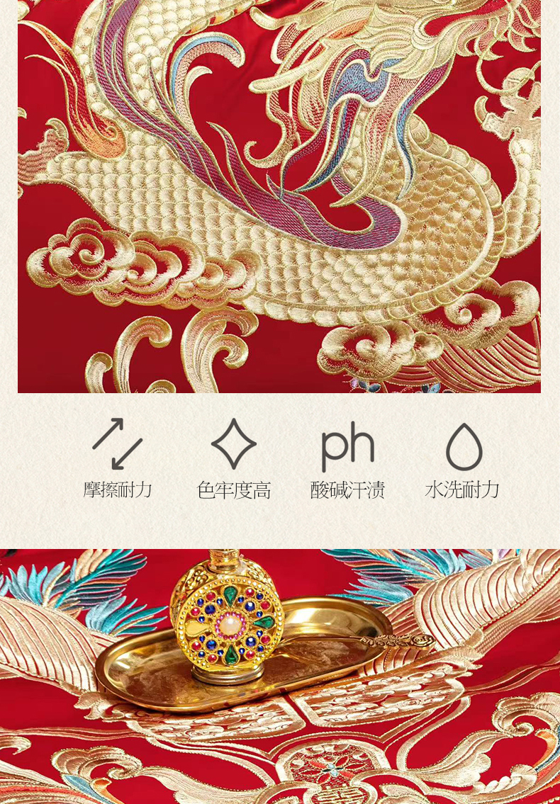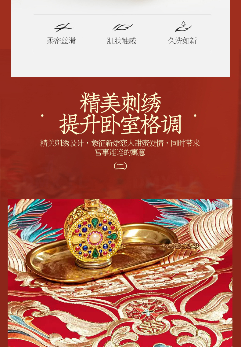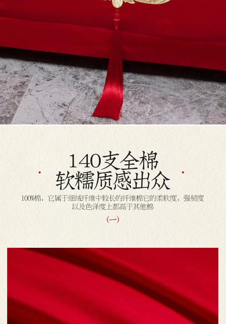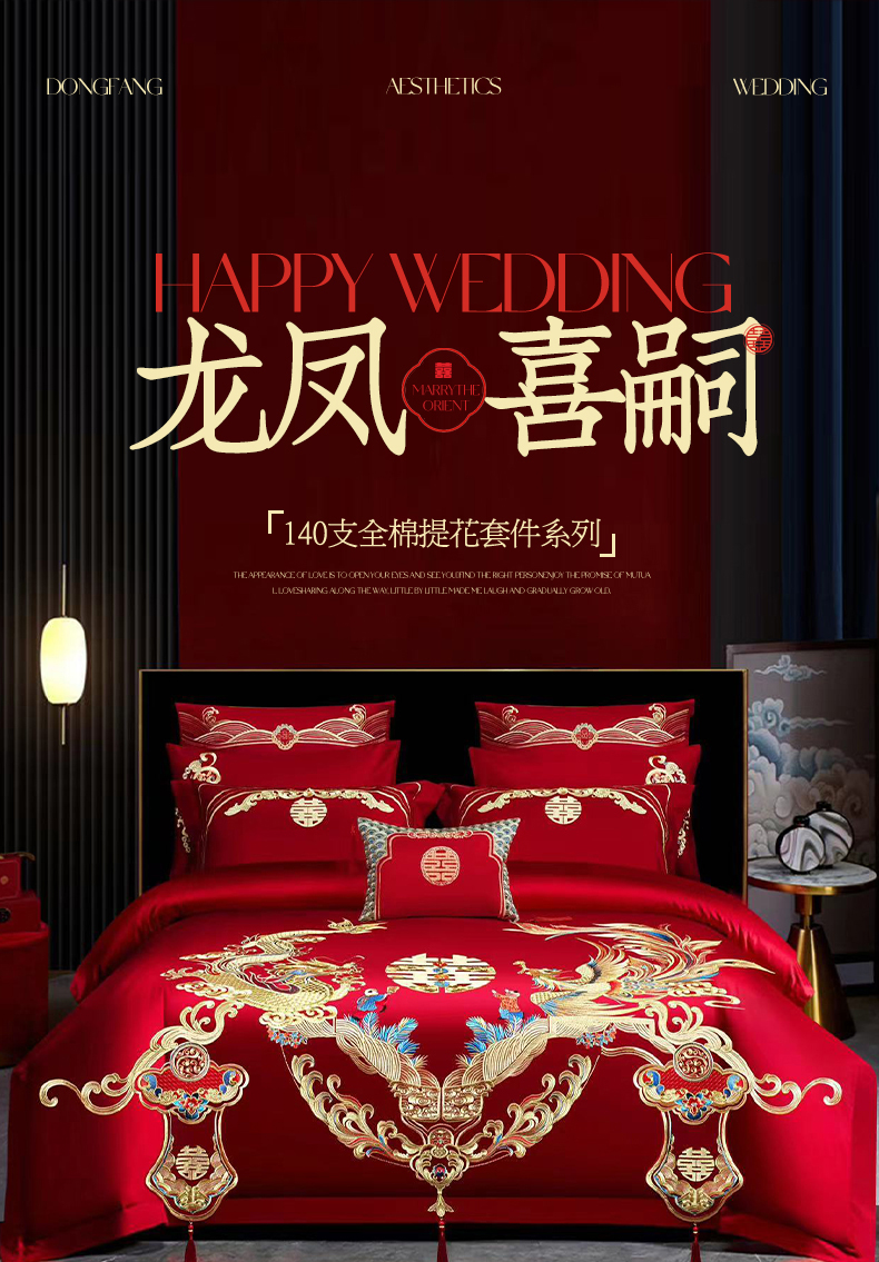 当前位置: 91家纺网 > 商品网购 > 床品套件 > 四件套 > 婚庆四件套 > 美娘阁 2025新款长绒棉全棉贡缎提花款新中式古典韵味精美刺绣婚庆四件套系列 龙凤喜嗣