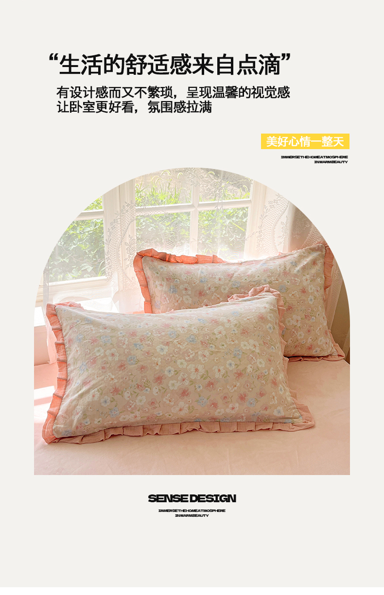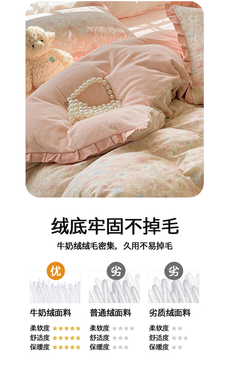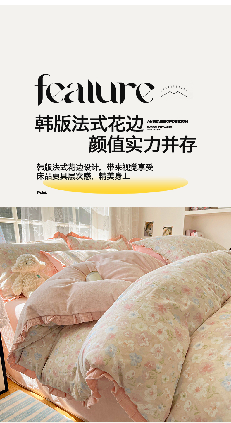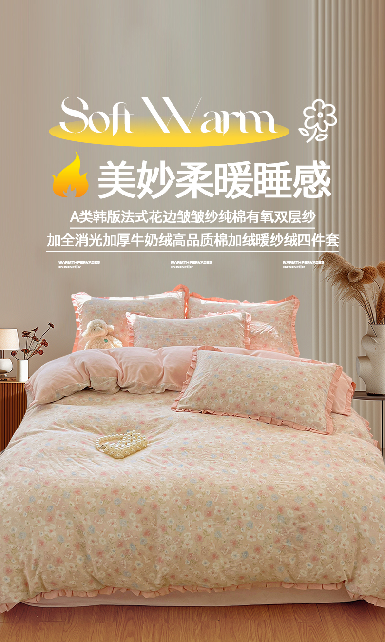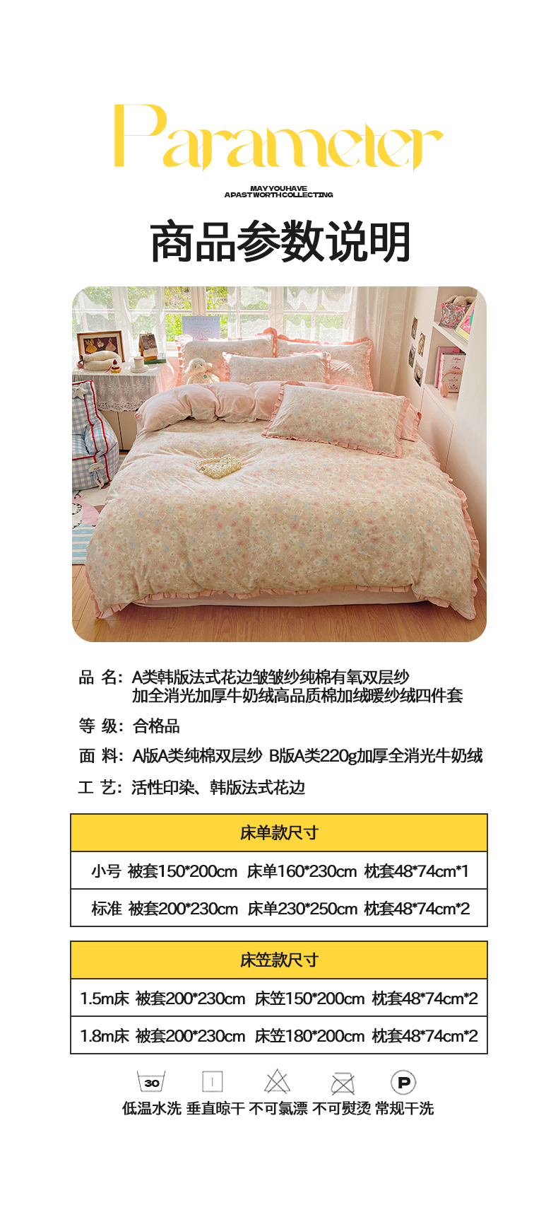 商品名称:桃子家居 2025新款A类韩版花边皱皱纱纯棉有氧双层纱加全消光加厚牛奶绒高品质棉加绒暖纱绒四件套 暖纱绒-白茶粉