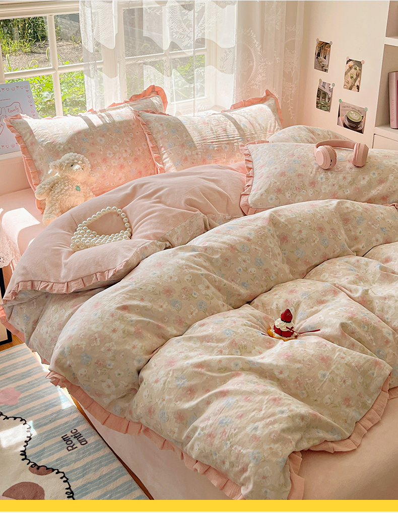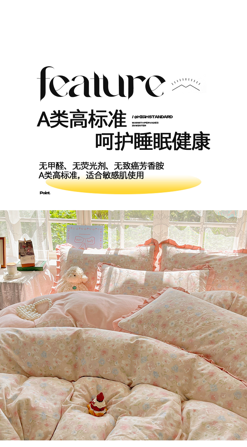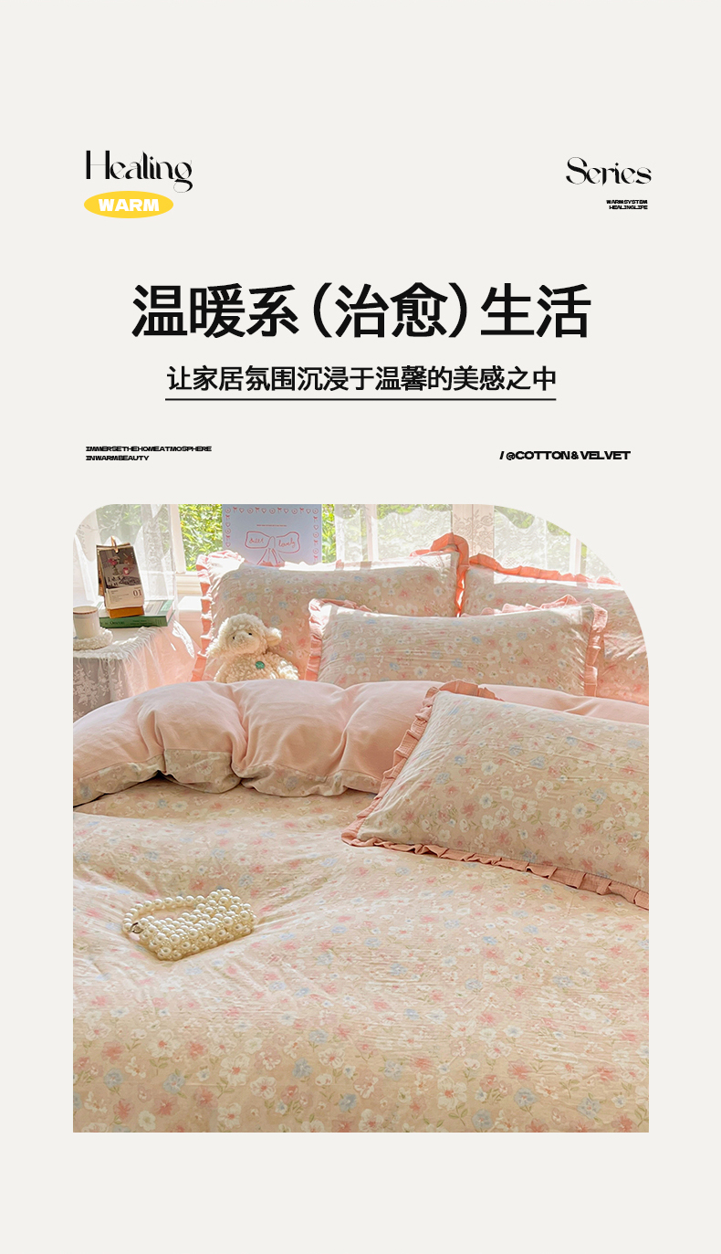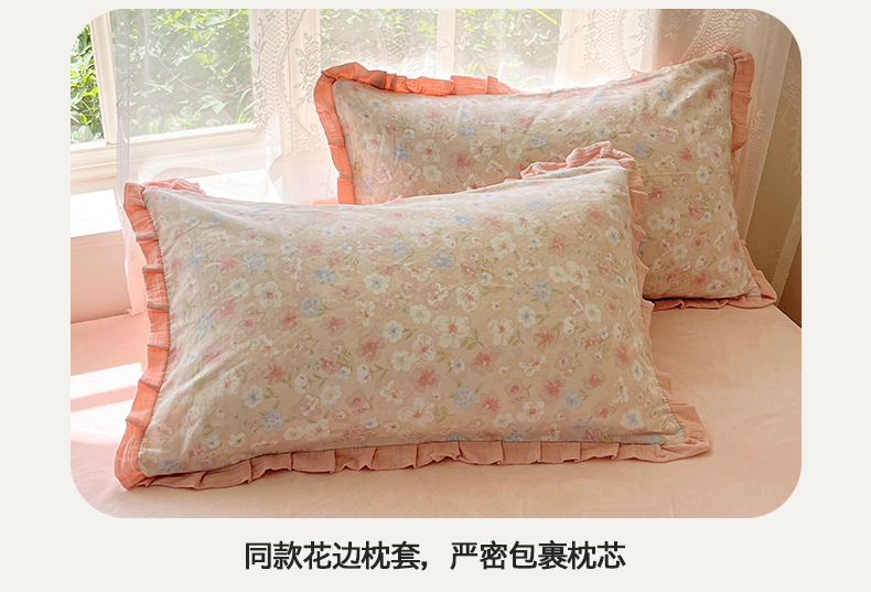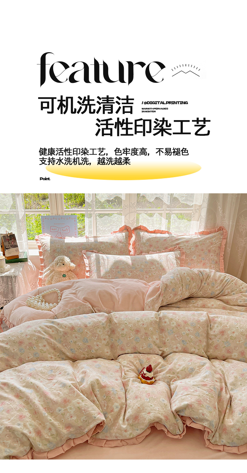 商品名称:桃子家居 2025新款A类韩版花边皱皱纱纯棉有氧双层纱加全消光加厚牛奶绒高品质棉加绒暖纱绒四件套 暖纱绒-白茶粉