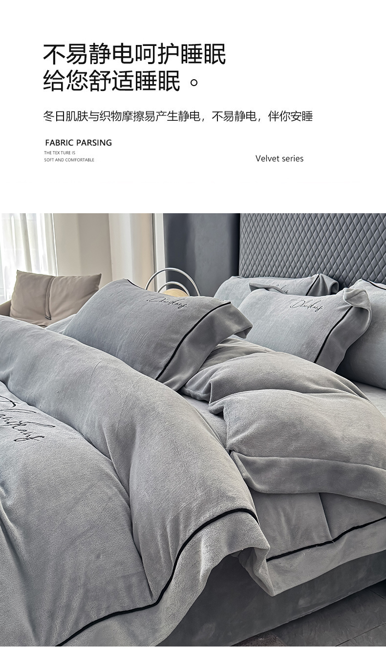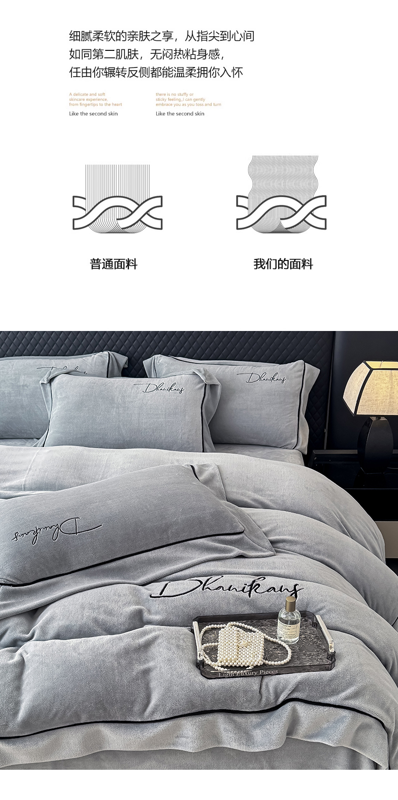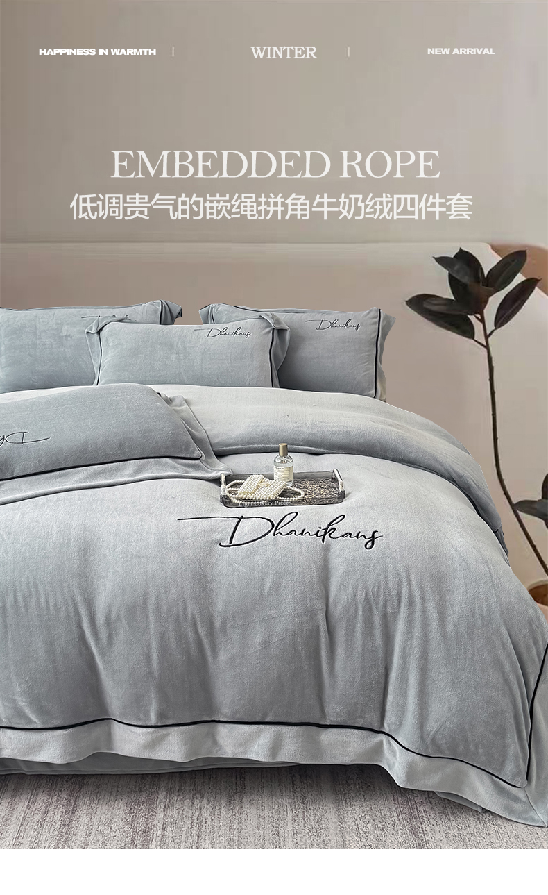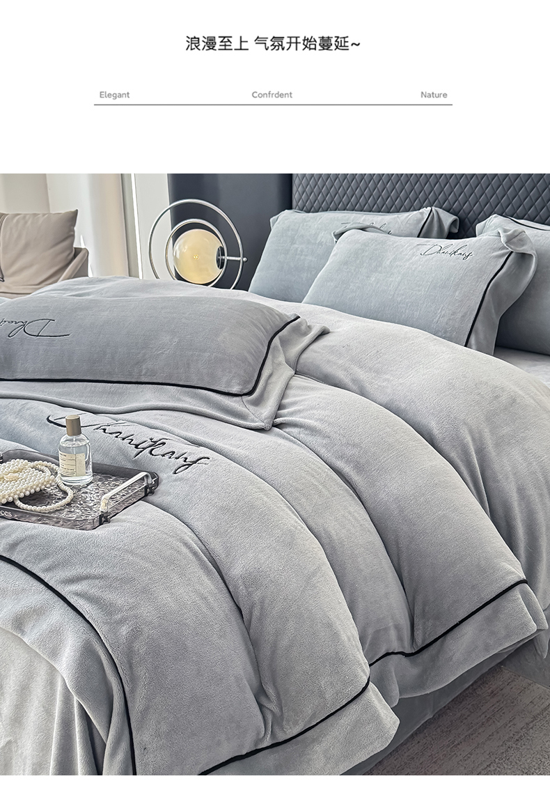 商品名称:KA家纺 2025新款冬轻奢刺绣款嵌绳大拼角牛奶绒四件套 轻奢牛奶绒-灰