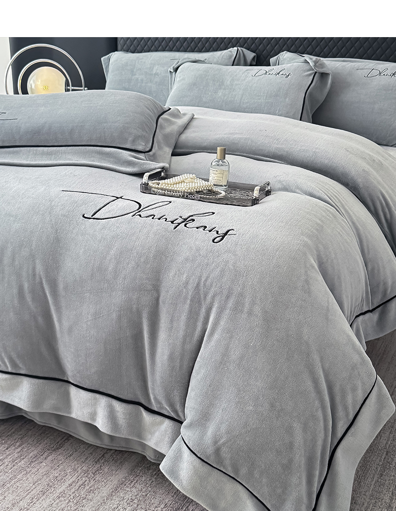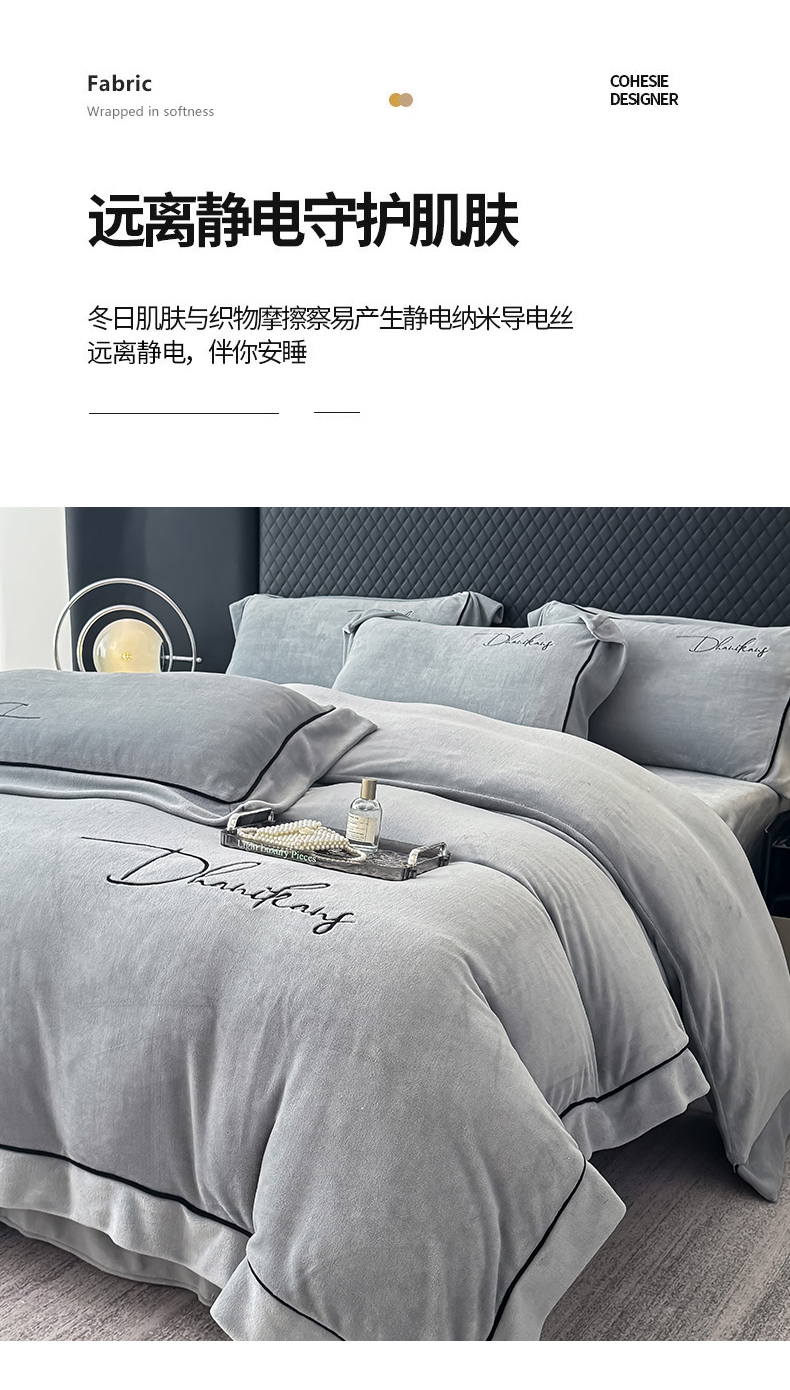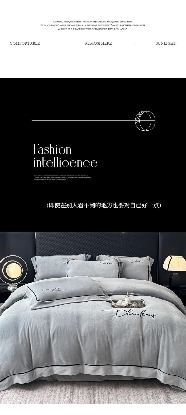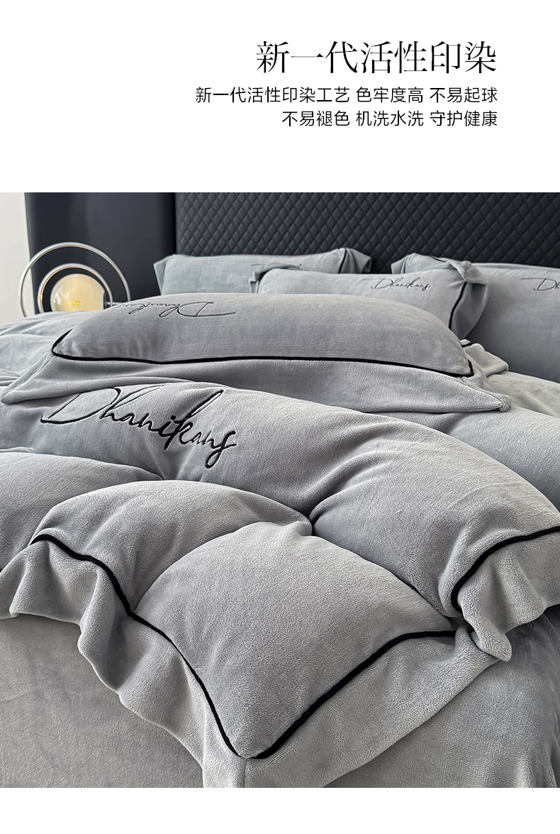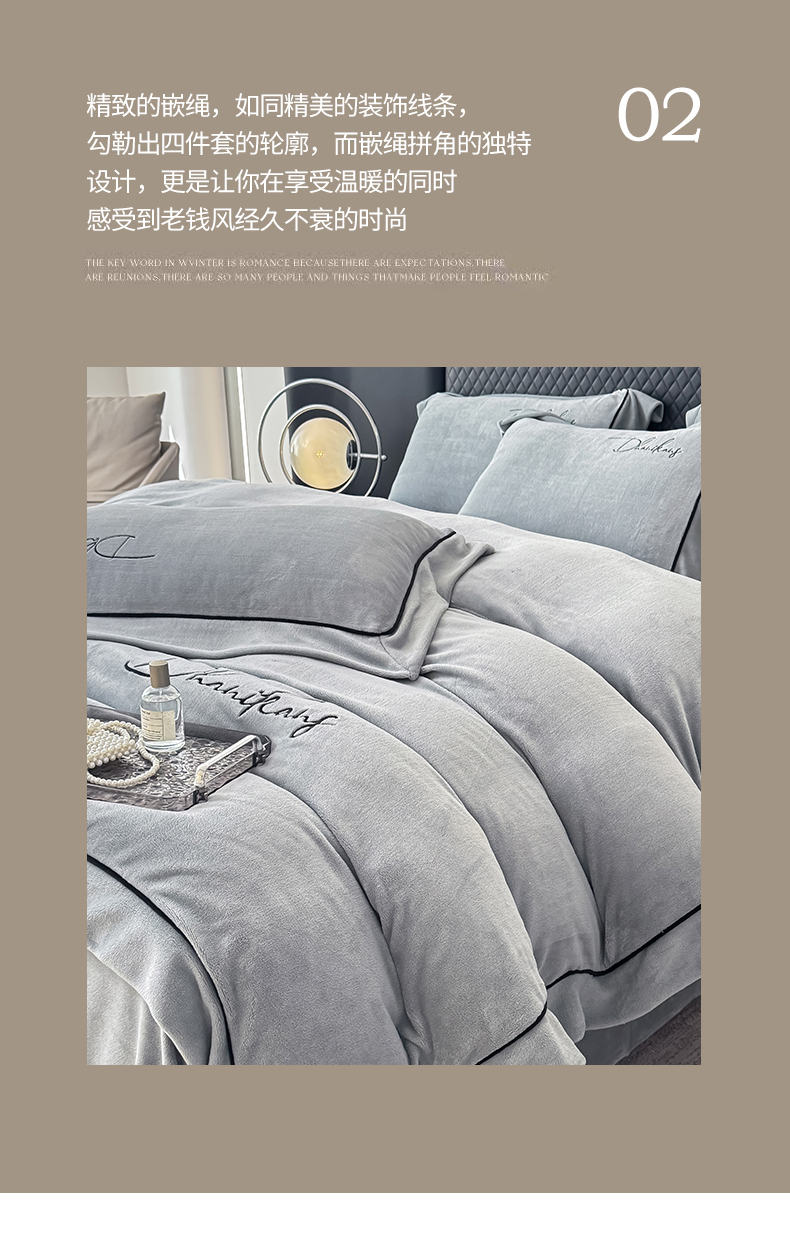商品名称:KA家纺 2025新款冬轻奢刺绣款嵌绳大拼角牛奶绒四件套 轻奢牛奶绒-灰
