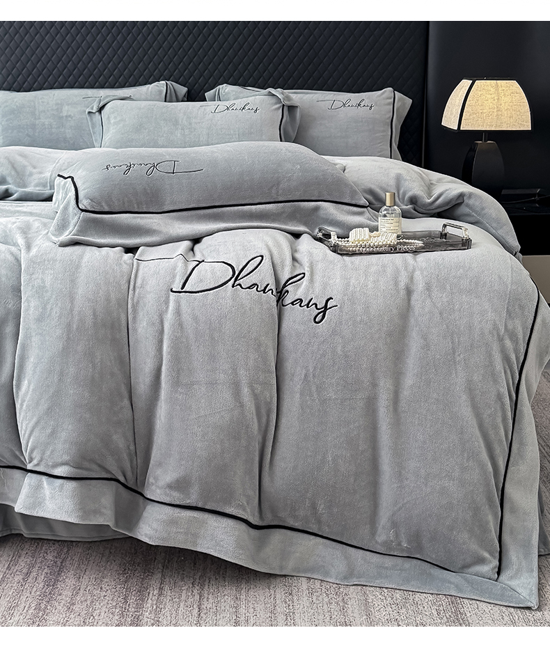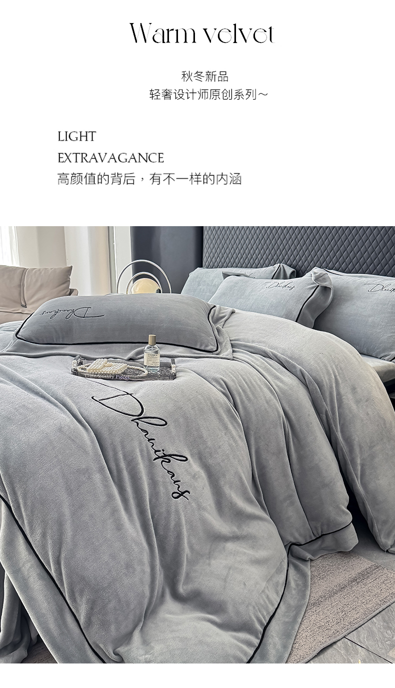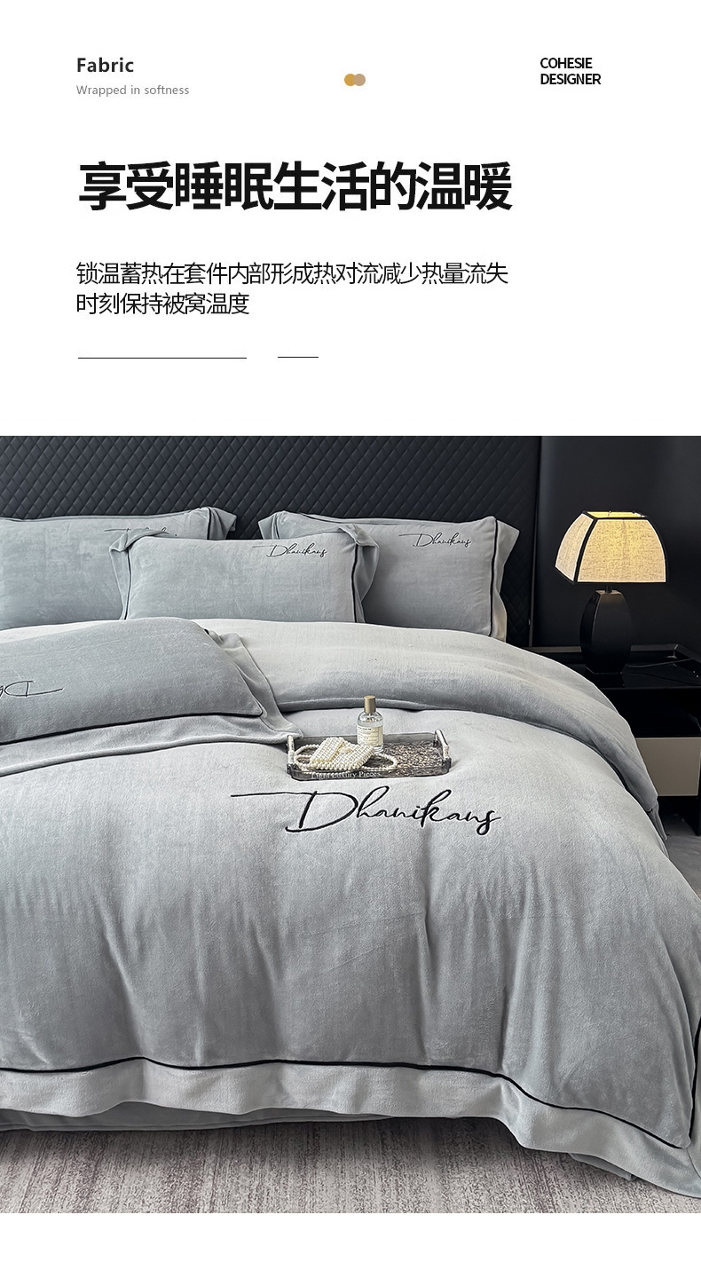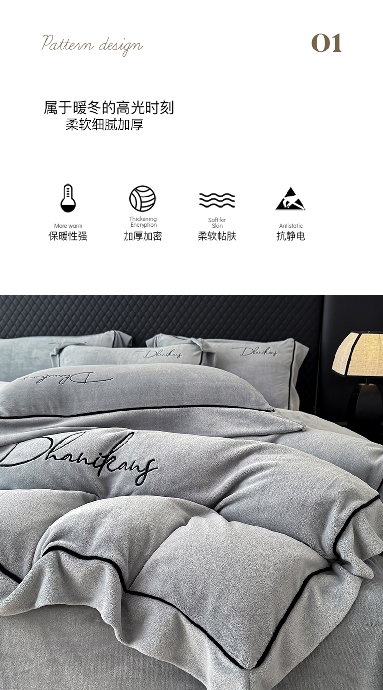 商品名称:KA家纺 2025新款冬轻奢刺绣款嵌绳大拼角牛奶绒四件套 轻奢牛奶绒-灰