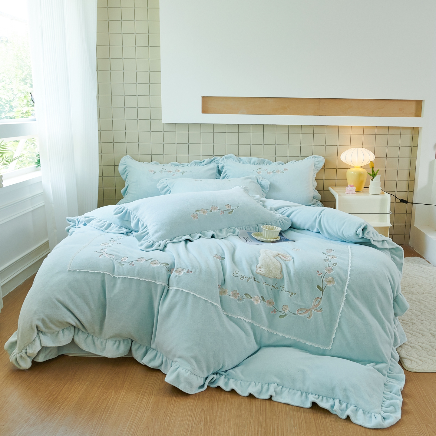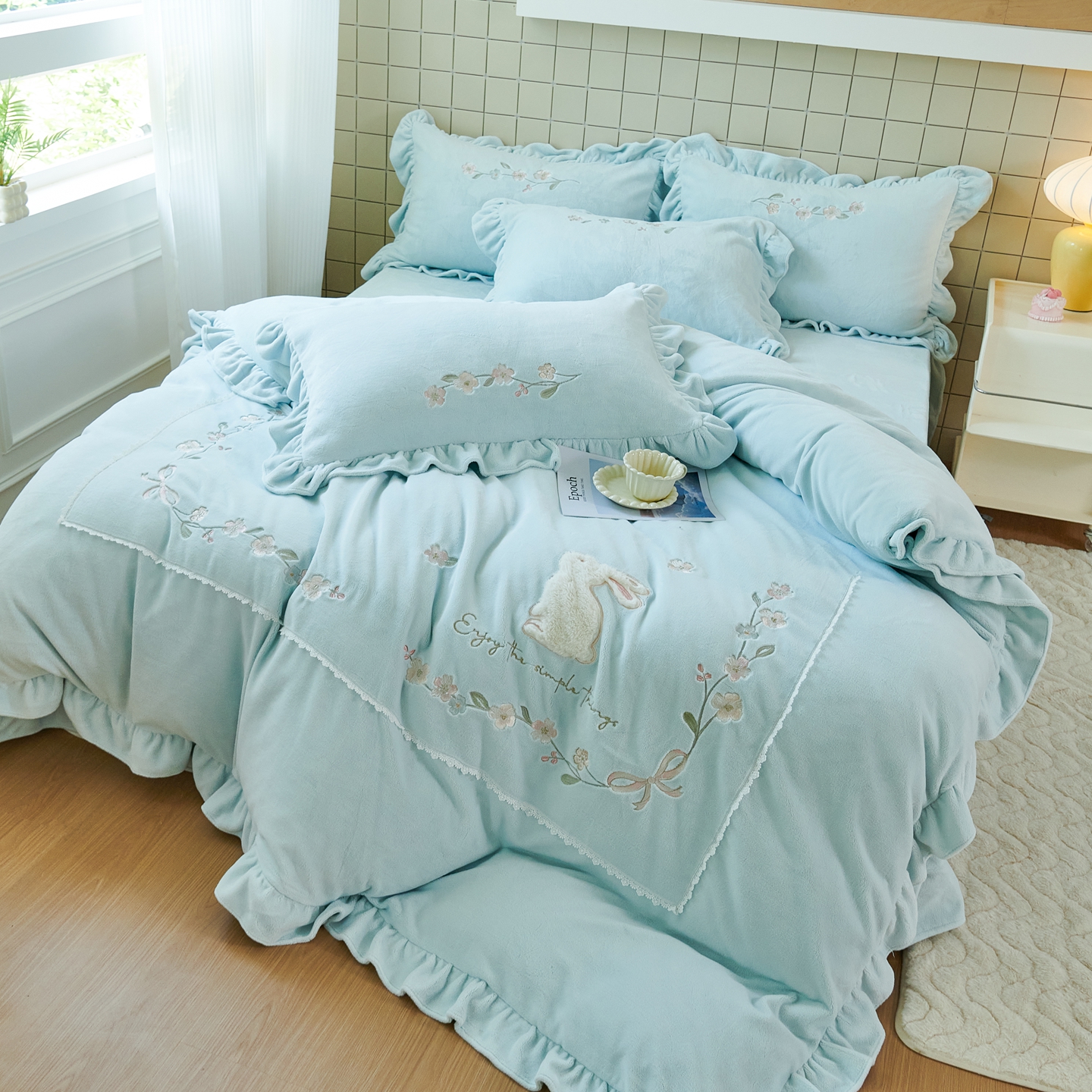 (总)优姿家纺 2025新款牛奶绒花边绣花床盖四件套,花漾时光-果绿,花漾时光-玖红色,花漾时光-米色,花漾时光-桃红色,花漾时光-天空兰,花漾时光-雾霾蓝
