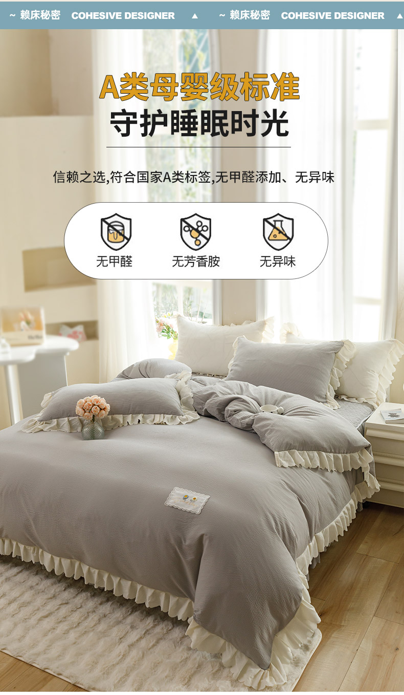 当前位置: 91家纺网 > 商品网购 > 床品套件 > 四件套 > 其它四件套 > 丝印良品 2025新款四季款夹棉泡泡纱床裙床笠被套四件套系列 浅灰