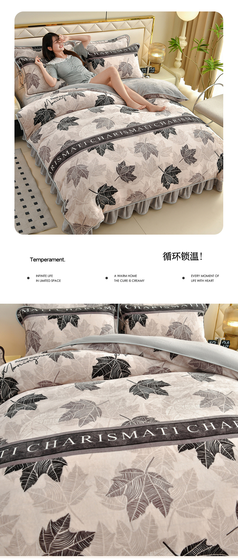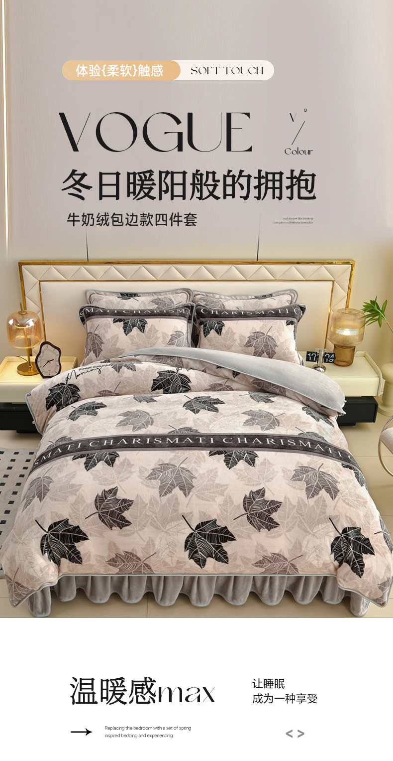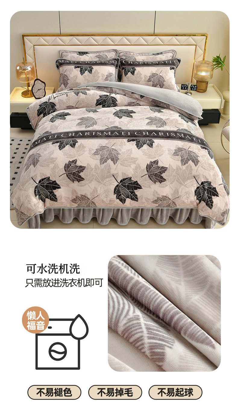 商品名称:赫本 2025新品8斤爆品牛奶绒四件套床裙款金雕绒法莱绒四套件 秋枫