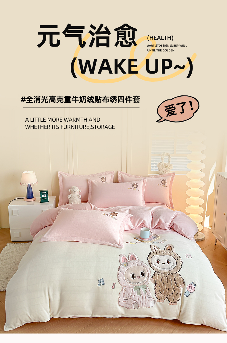(总)金窝窝家纺 2025新款全消光高克重牛奶绒贴布绣四件套,可爱拉布布-粉,可爱拉布布-蓝,萌趣大耳狗-粉,萌趣大耳狗-蓝,卡皮熊-樱花粉,可爱拉布布-咖啡色,可爱拉布布-奶咖,萌趣大耳狗-绿,卡皮熊-天空蓝