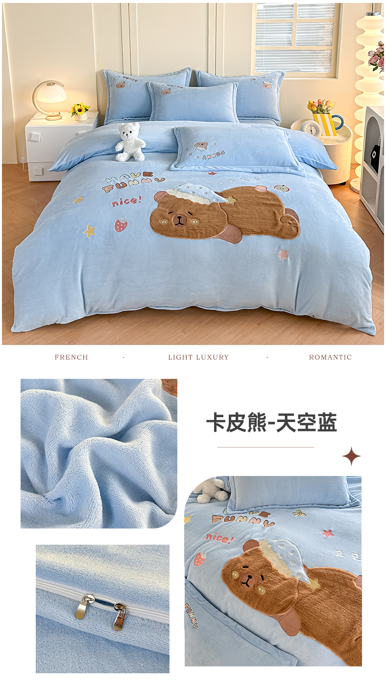 金窝窝家纺 2025新款全消光高克重牛奶绒贴布绣四件套 卡皮熊-天空蓝,卡皮熊-天空蓝