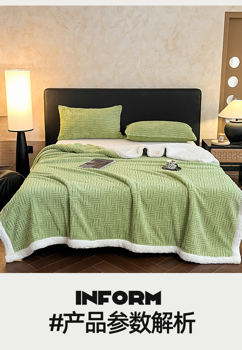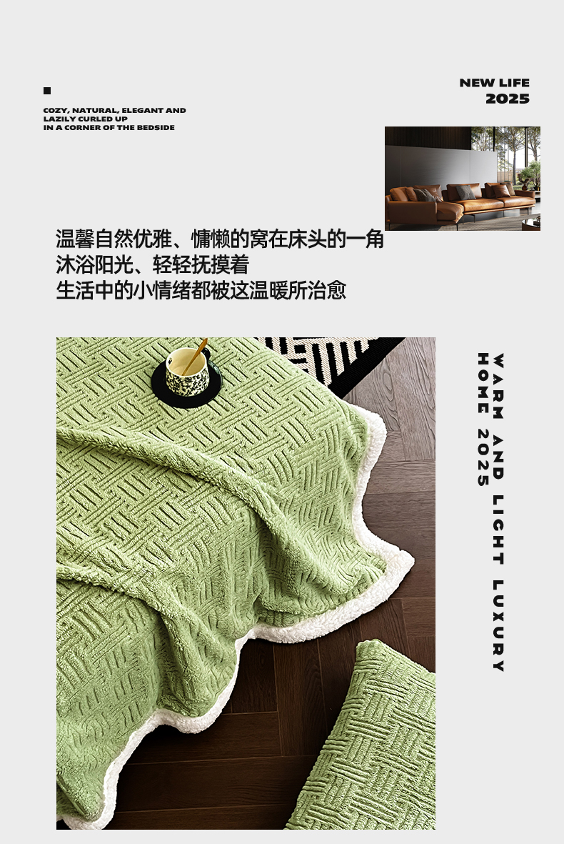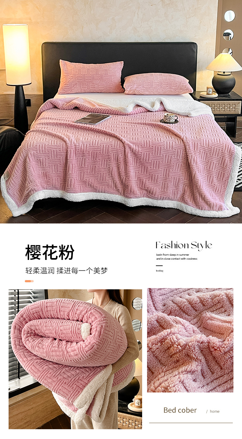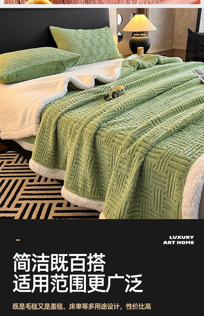 (总)丝幔家纺 2025新款A类羊棉绒原创设计毛毯系列,叶绿,粉色,湖蓝,奶咖,奶昔白,浅灰,天蓝,香槟金,银灰,月光紫