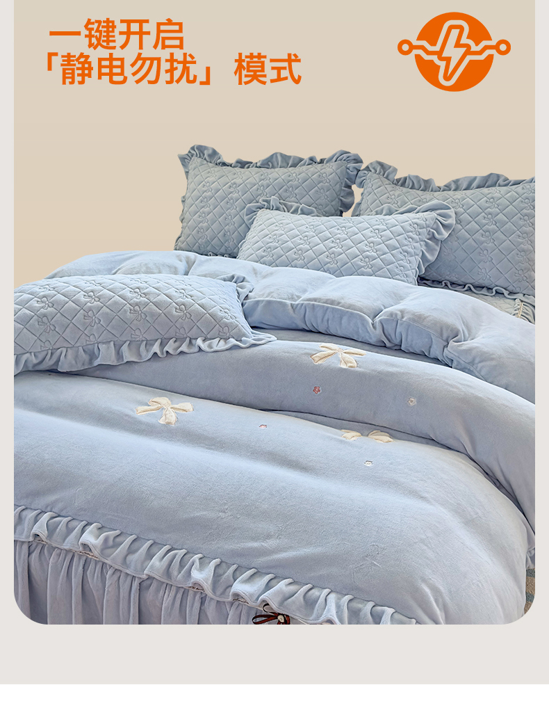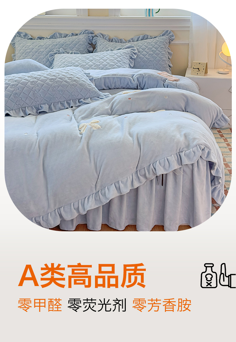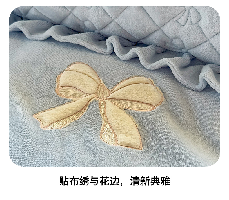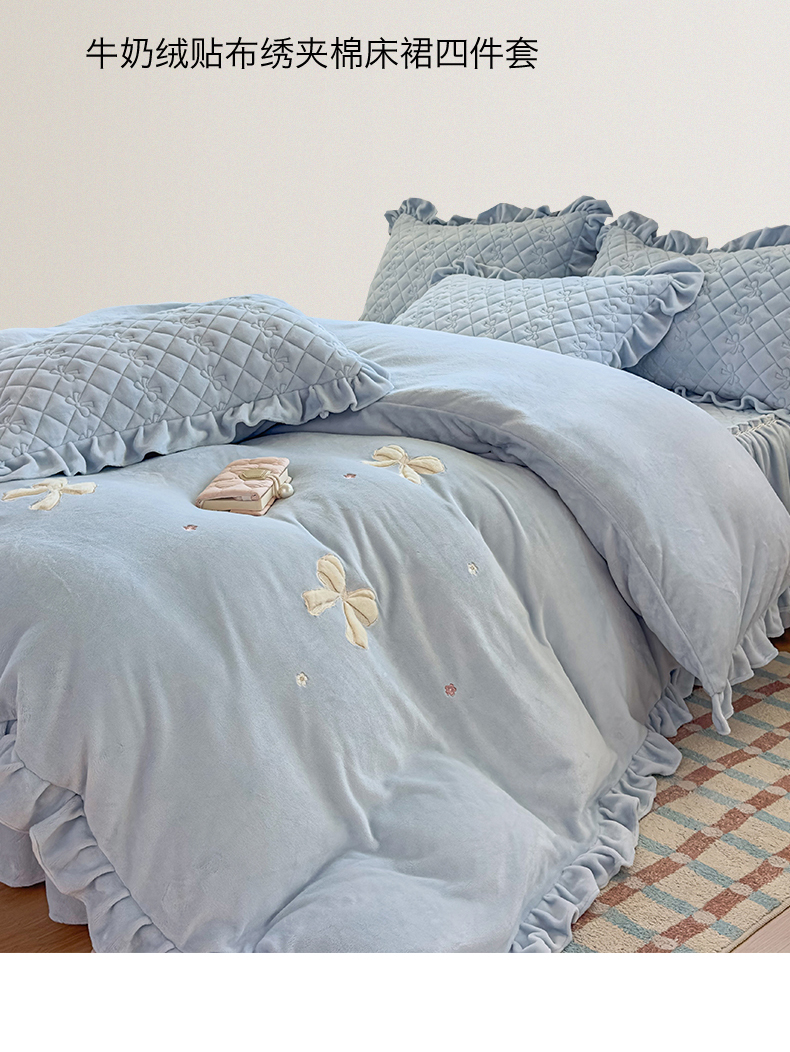 当前位置: 91家纺网 > 商品网购 > 床品套件 > 四件套 > 牛奶绒四件套 > 恒爱家纺 2025新款牛奶绒贴布绣夹棉床裙四件套 天空蓝
