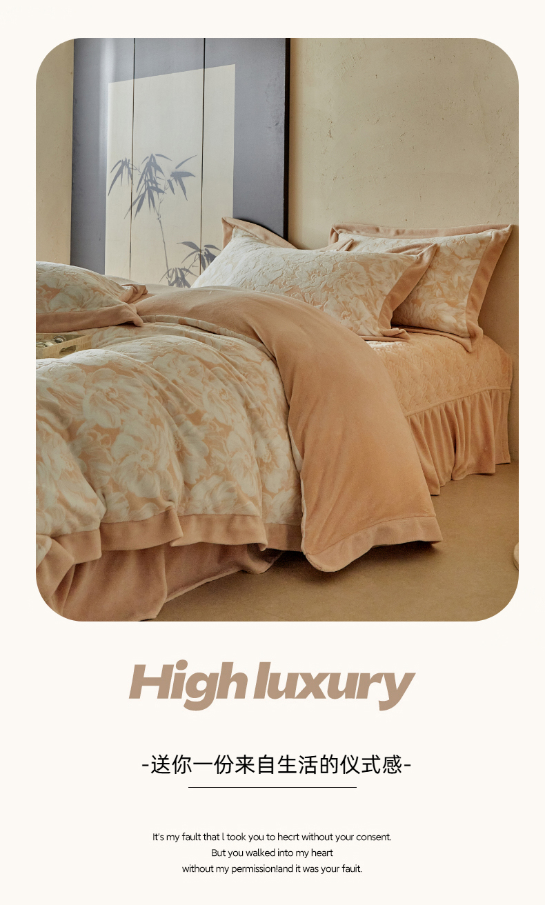 商品名称:孑寐家纺 2025新款宽边拼角雕花绒床盖四件套 花夕颜-粉色
