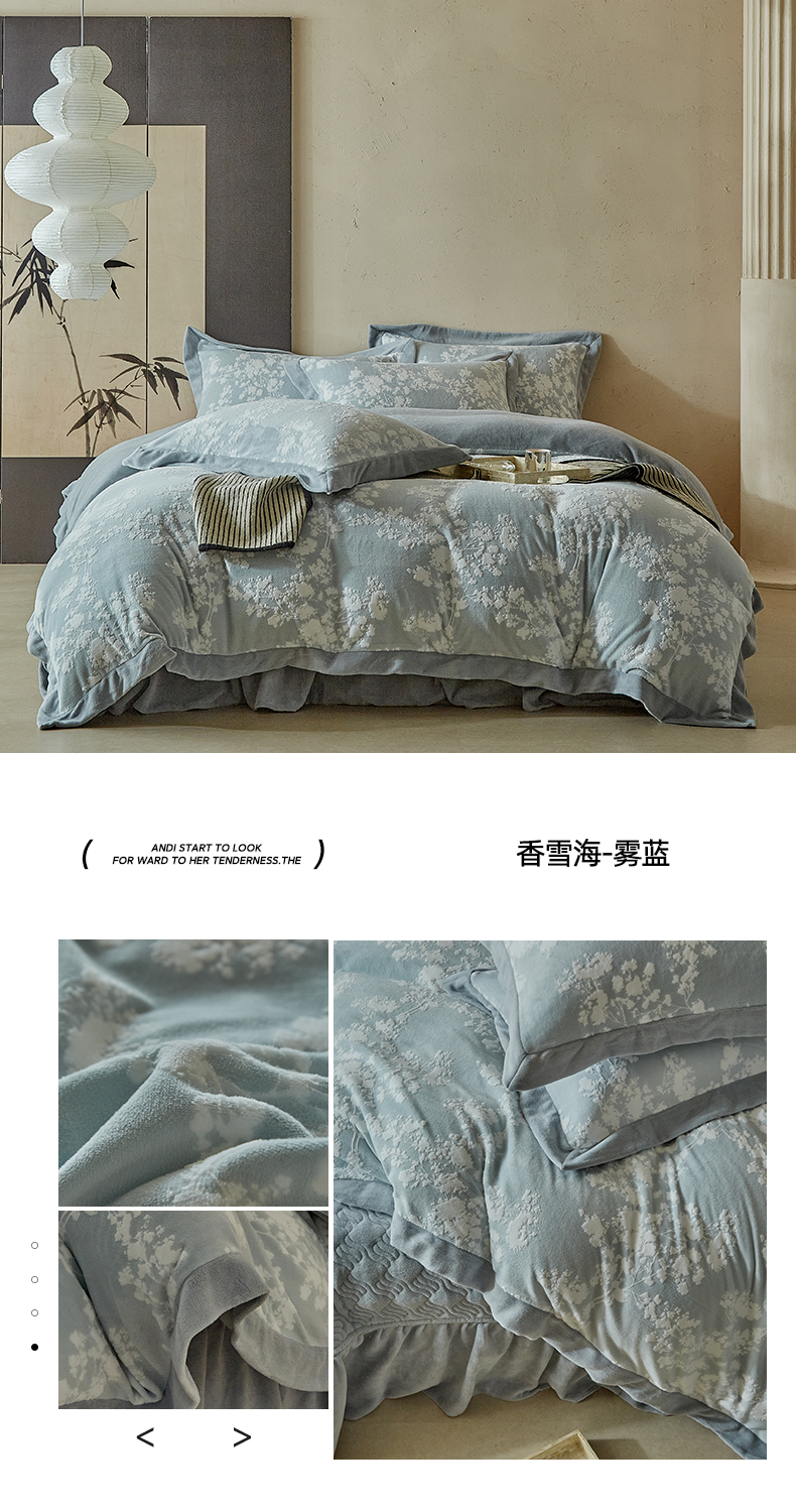 (总)孑寐家纺 2023新款韩国进口雕花绒牛奶绒床盖四件套,茉拉庄园-海天蓝,茉拉庄园-暮色绿,茉拉庄园-奶白色,茉拉庄园-奶油黄,茉拉庄园-奶油紫