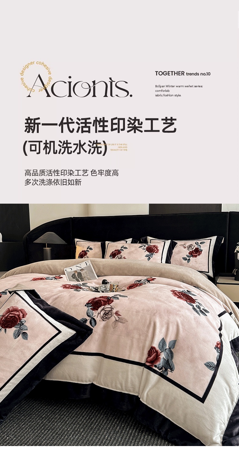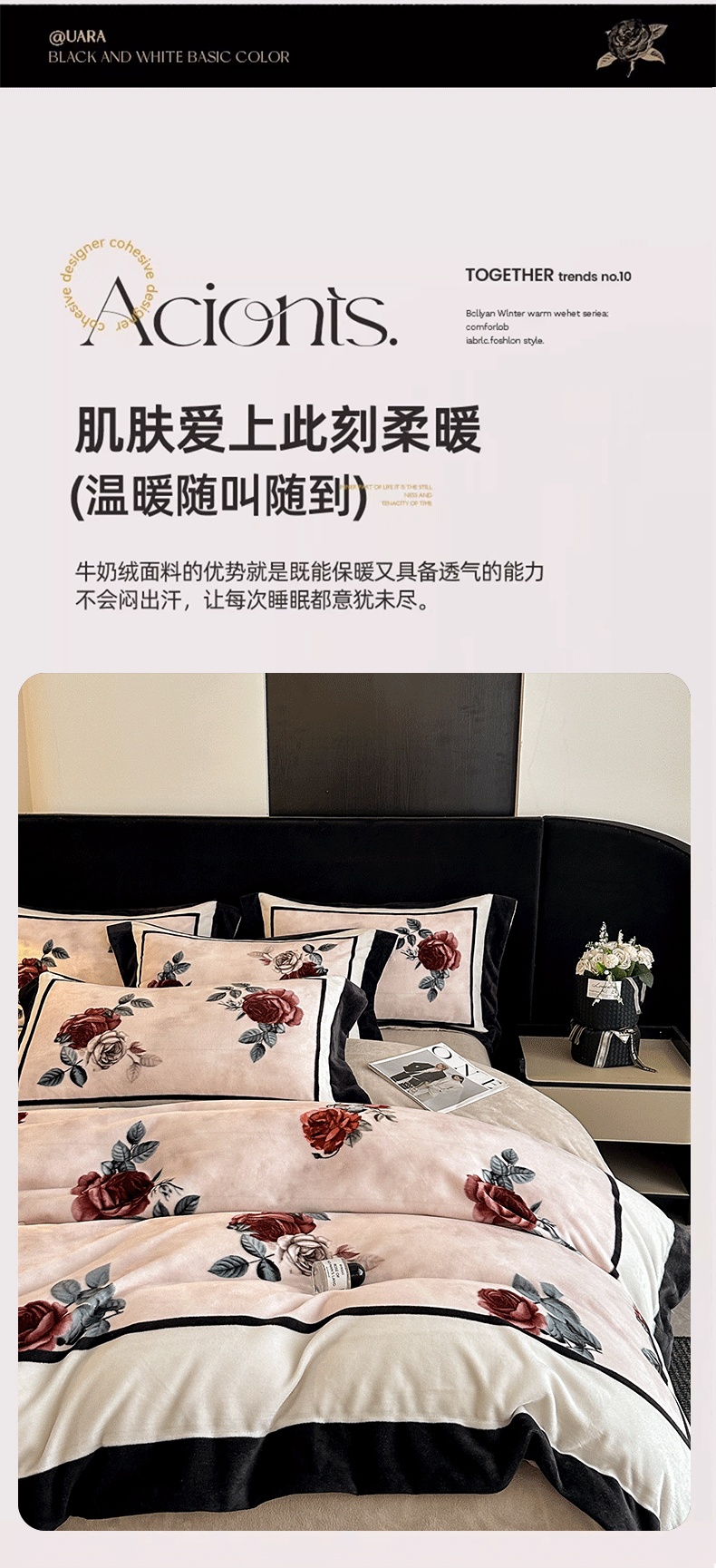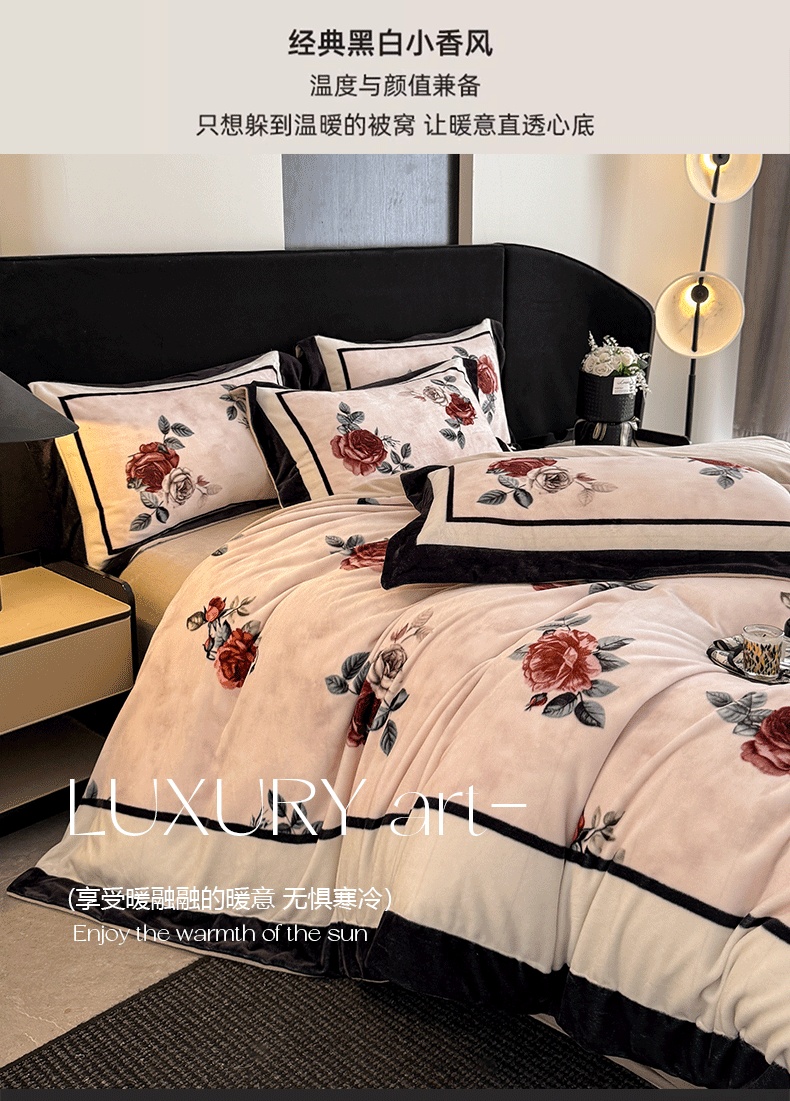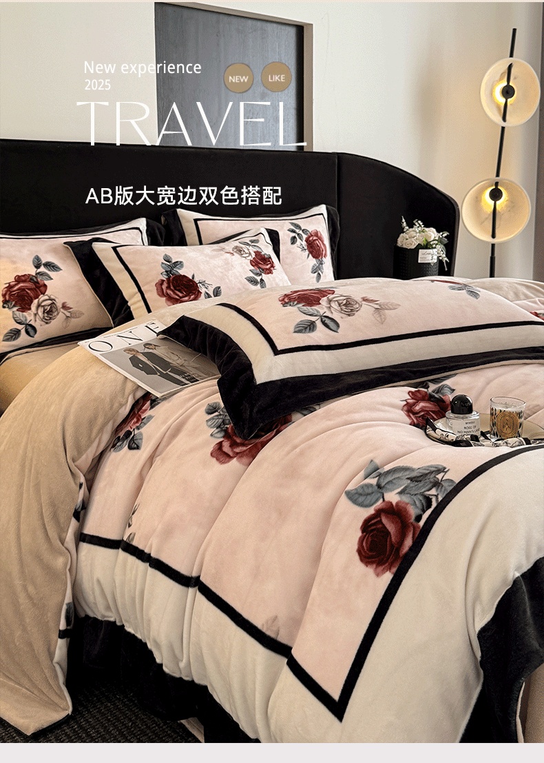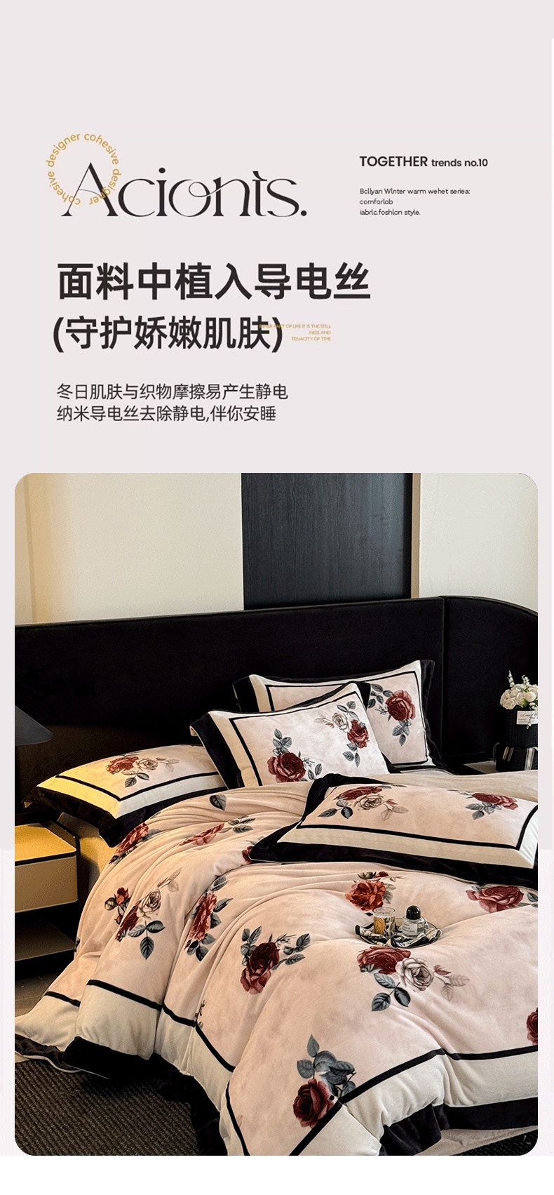 商品名称:花漾家居 2025新款秋冬新品法式轻奢复古宽边大版牛奶绒四件套(提供买家秀) 玫瑰时光