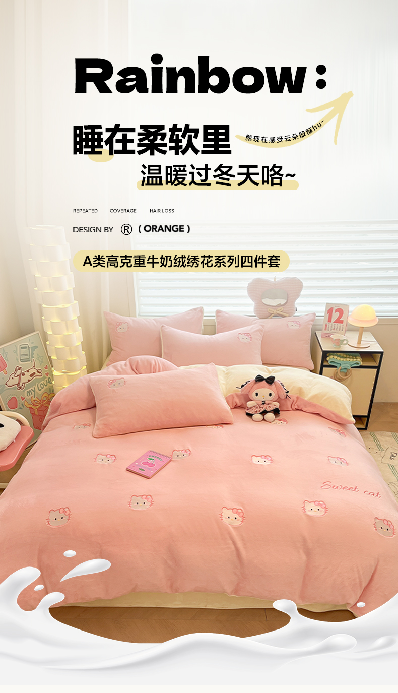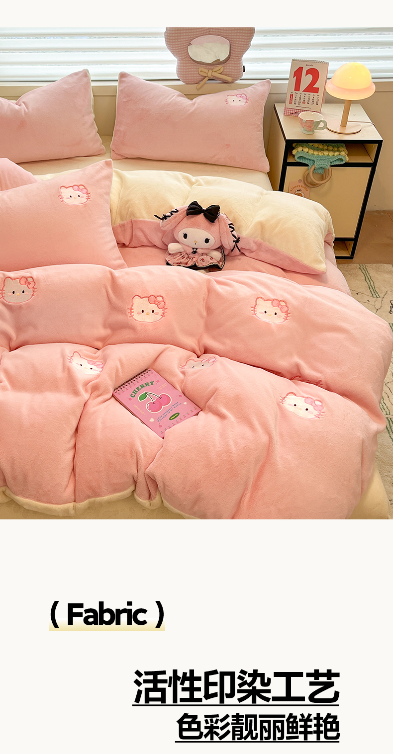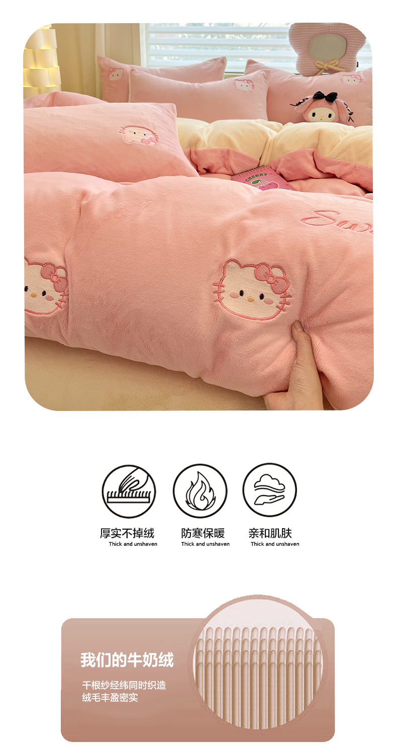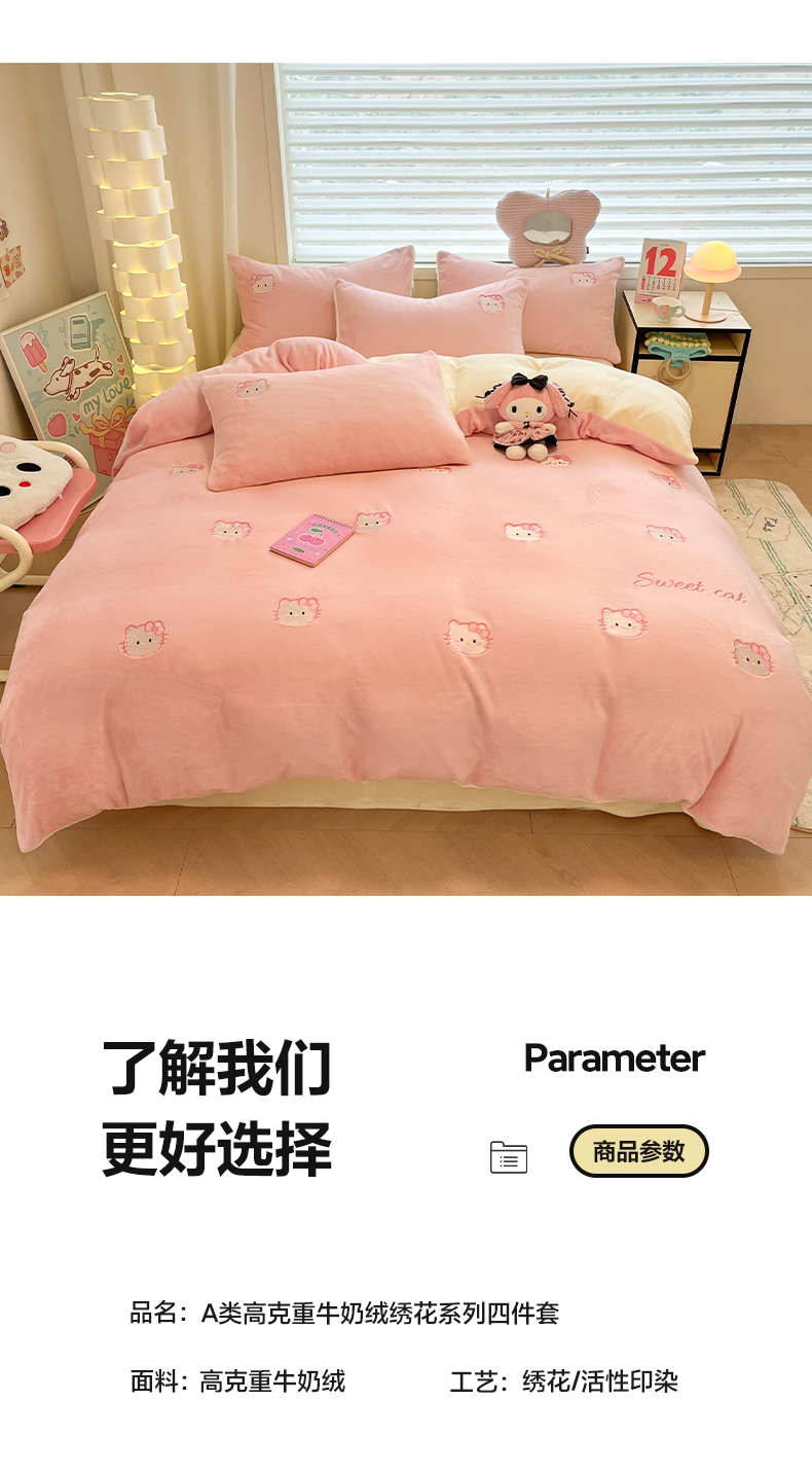 如一 2025新款200克缸染高克重精绣牛奶绒四件套 绒-甜心猫-粉米